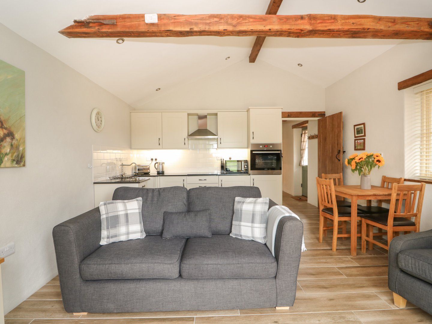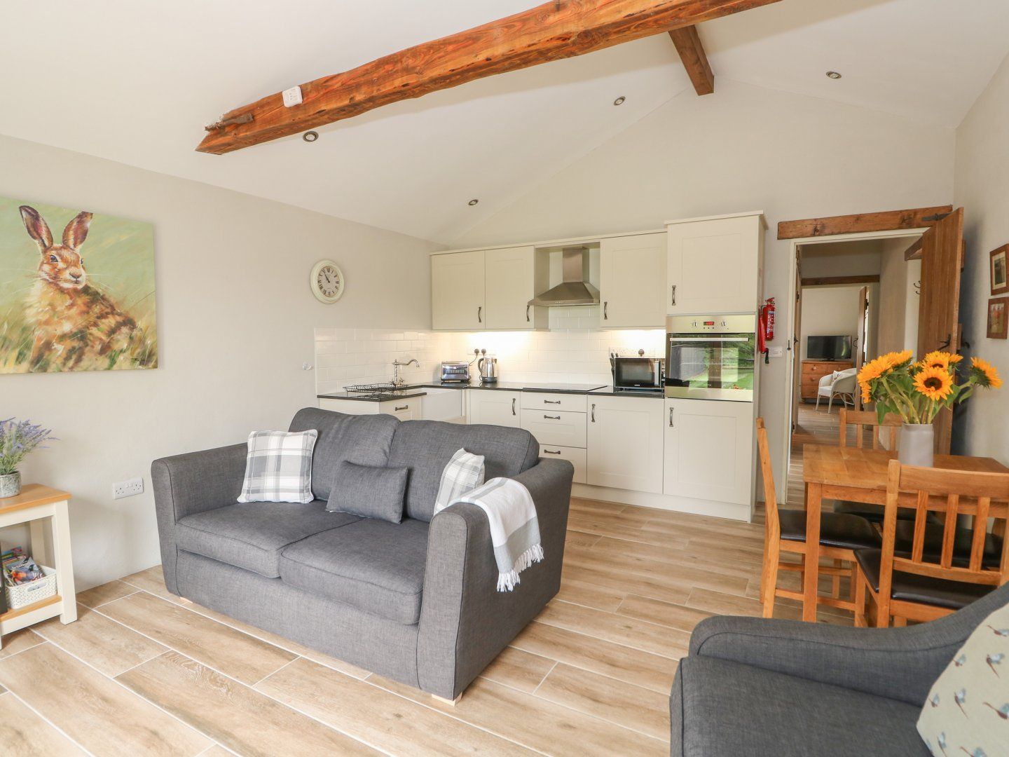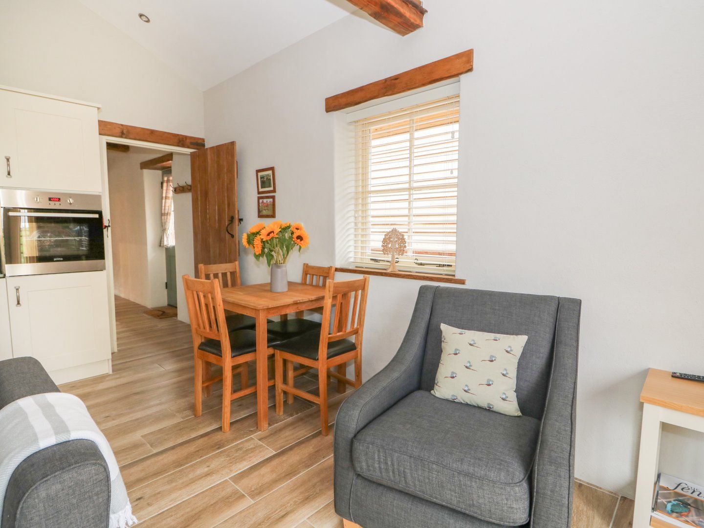Amenities Air source underfloor heating with woodburning stove. Electric oven, induction hob, microwave, dishwasher, fridge, TV, and WiFi. Fuel and power inc. in rent. Bed linen and towels inc. in rent. Off-road parking for two cars. Private patio with seating and barbecue, backing onto shared garden paddock. Storage room across the shared courtyard with lockable storage for bikes, golf clubs, surfboards etc. Sorry, no pets and no smoking. Shop 1.6 miles, pub 1.8 miles. Note: first basket of wood is included, further baskets will incur a charge. PLEASE NOTE: This property does not accept Stag/Hen/Party bookings.