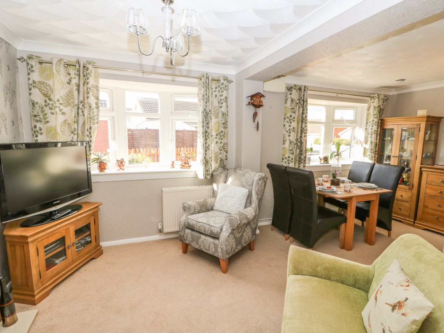 Amenities Gas central heating. Electric oven and hob, microwave, fridge, dishwasher, washing machine, tumble dryer, TV/DVD, WiFi. Fuel and power inc. in rent. Bed linen and towels inc. in rent. Off-road parking for 1 car. Enclosed patio at rear with garden furniture, enclosed gravelled garden to front. 1 well-behaved dog welcome. Sorry, no smoking. Shop 10 mins walk, pub 7 mins walk. Note: This property accepts 3 Adults and 1 infant in head count, guests must bring own travel cot etc as not provided. Note: We need to say that the door between the sitting room and snug is a single sliding patio door and the patio door in the small bedroom is a double opener patio door (French door style), with single opener out into the garden from there.