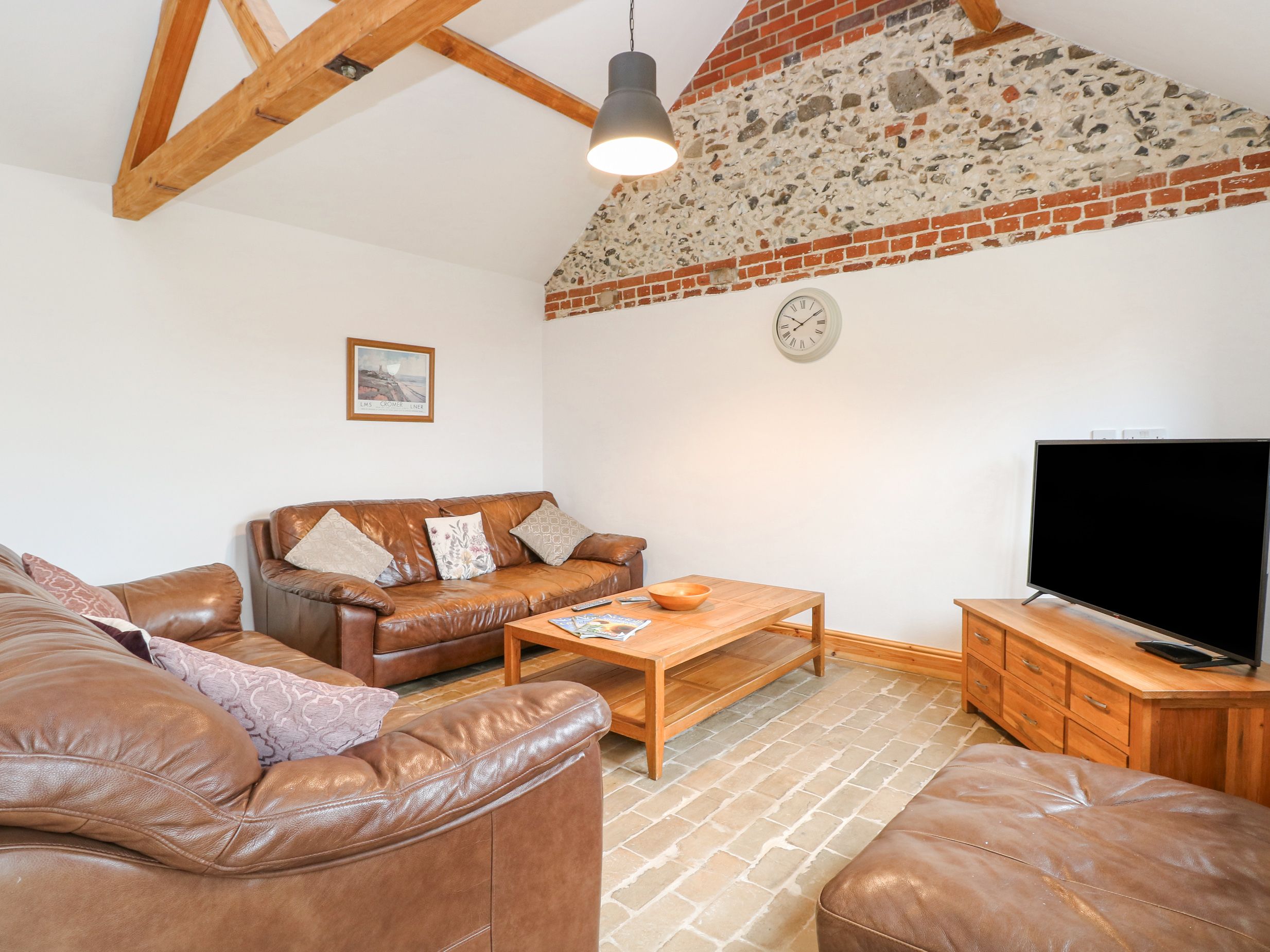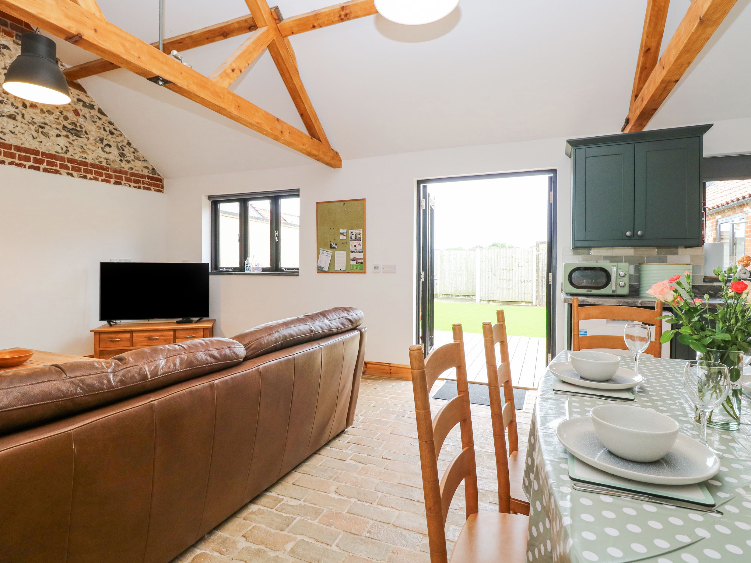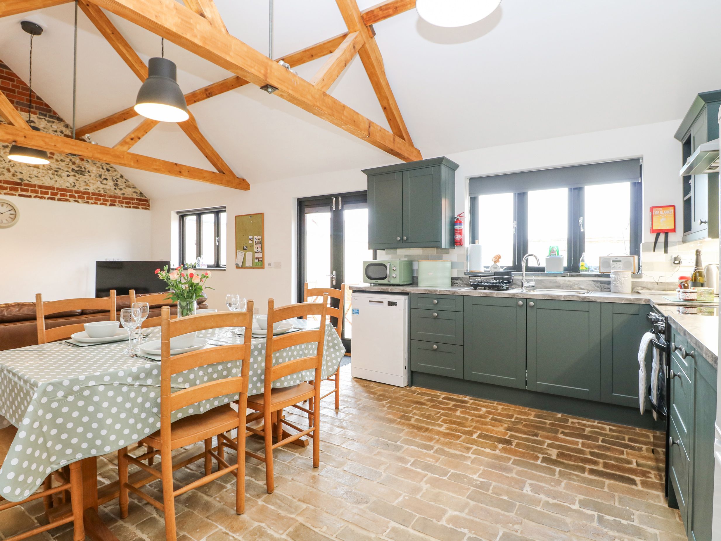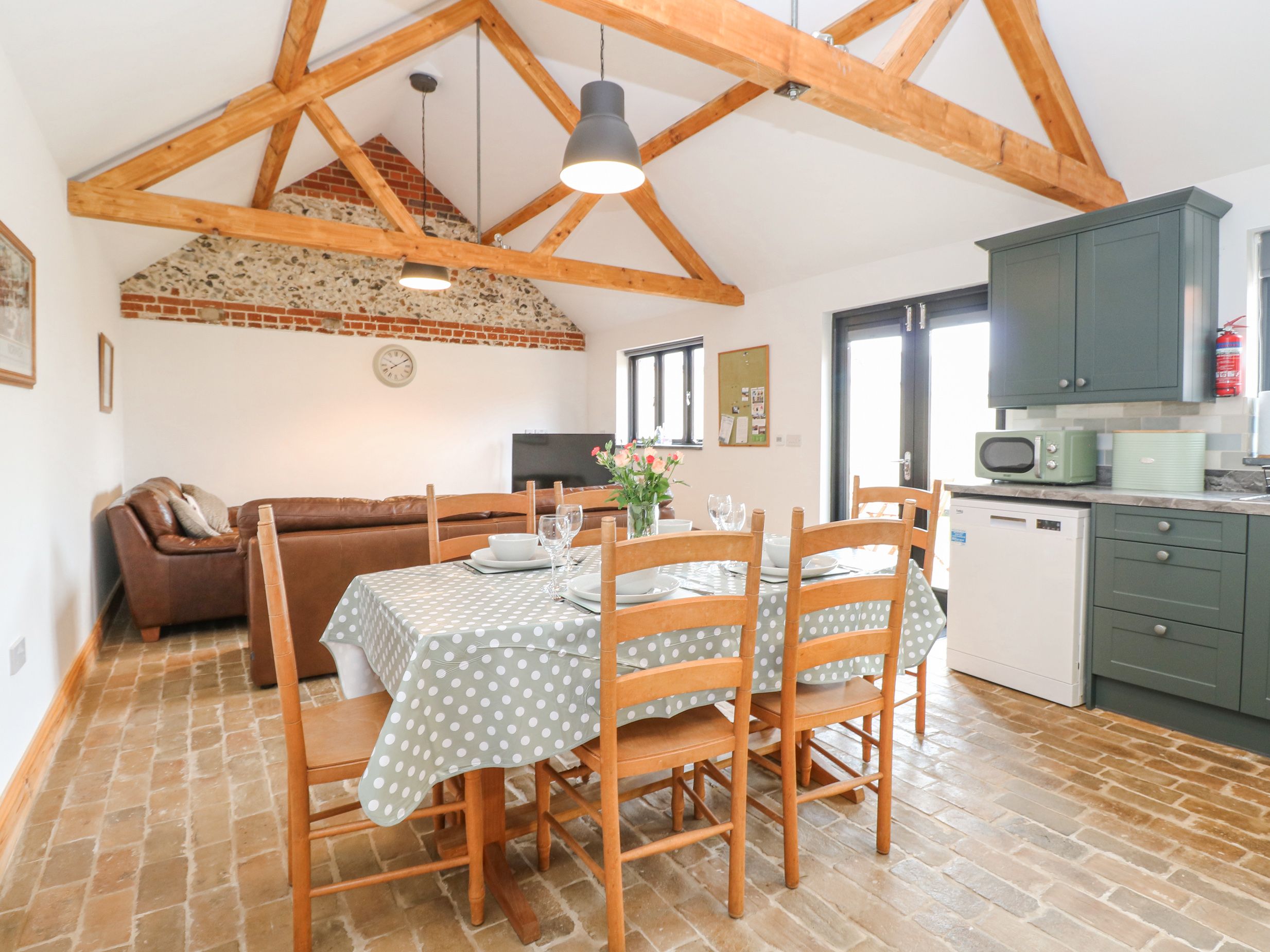 Holiday home The Old Dairy, a single-storey barn, consists of an open-plan living area with dining seating for four, Smart TV, a kitchen with an electric oven and hob, microwave, fridge/freezer, dishwasher, kettle, toaster, and a utility with a washing machine. The bedrooms consist of a king-size with an en-suite shower room and a twin, serviced by a bathroom. Outside, there is an enclosed rear courtyard with astro-turf, decking, furniture, off-road parking for one car at the front, and an additional space to the side. WiFi, fuel, power, bed linen and towels are all included in the rent. Two well-behaved pets are welcome. Sorry, no smoking. Guests can find the closest shop in 2.4 miles, and within 3 miles, a pub. The Old Dairy is your rural getaway, whatever time of year. Note: There is a step up to the entrance and a small step to the kitchen. Note: Check-in from 4pm, check-out by 10am.