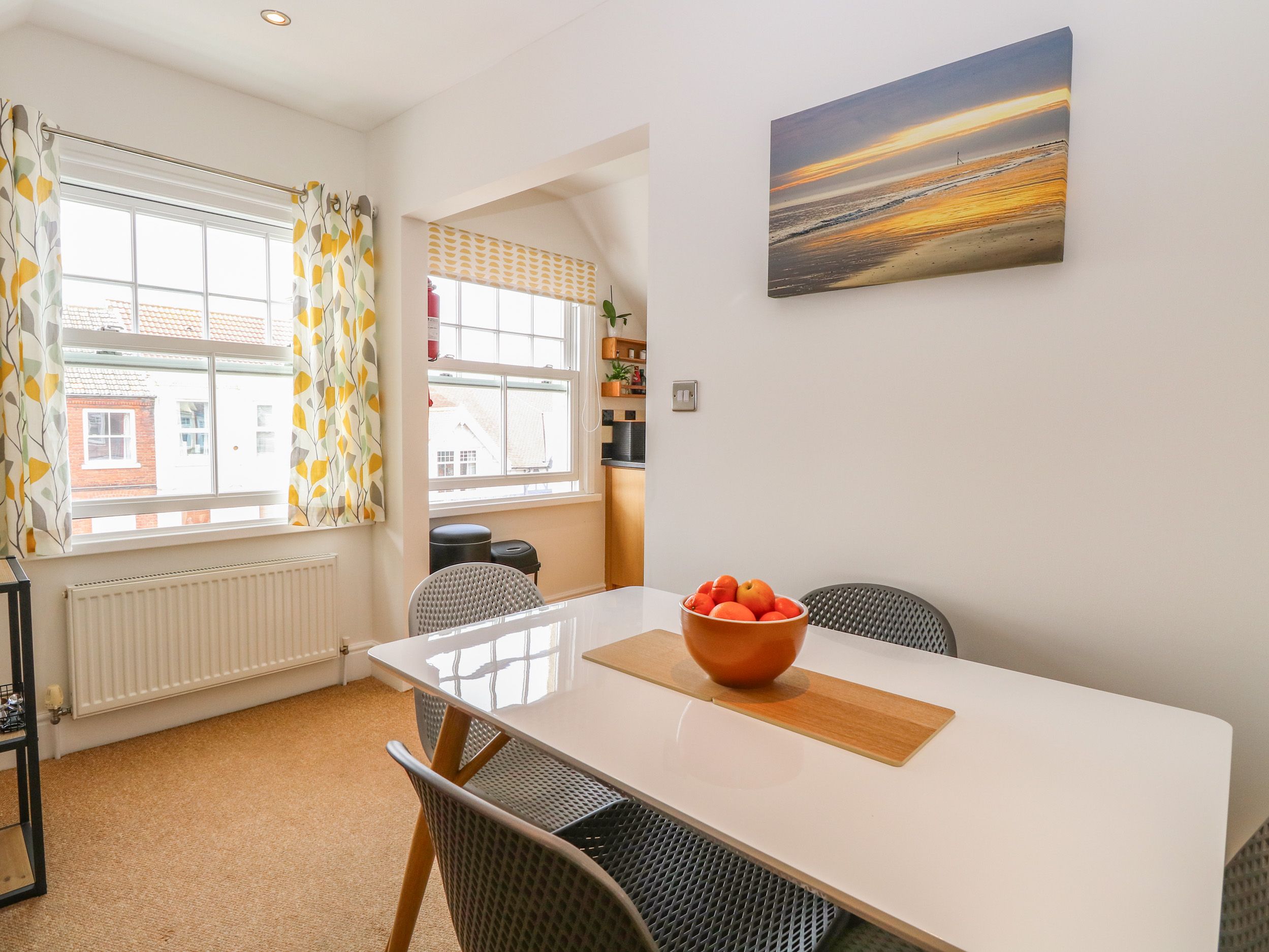 Holiday home Flat 3, a second-storey apartment overlooking the town of Cromer, consists of an open-plan kitchen and living space with an electric oven, gas hob, washing machine, fridge, microwave, kettle, toaster, dining table seating two, and a Smart TV. The double bedroom has ample storage with a dressing table. Outside, there is on-street unrestricted parking, with a carpark close by, as well as great access to a train station. Wifi, gas central heating, electric, bed linen and towels are all provided. You’ll find the closest shop and pub within 0.4 miles, a beach in 0.2 miles. No children or smoking, but one small well-behaved dog is welcome. Flat 3 makes a wonderful holiday for couples seeking to be on the coast with plenty of amenities around. Note: Check-in from 3pm, check-out by 11am. Note: This property has no garden. Please note: This property only accepts 1 booking per week and check in on a Saturday