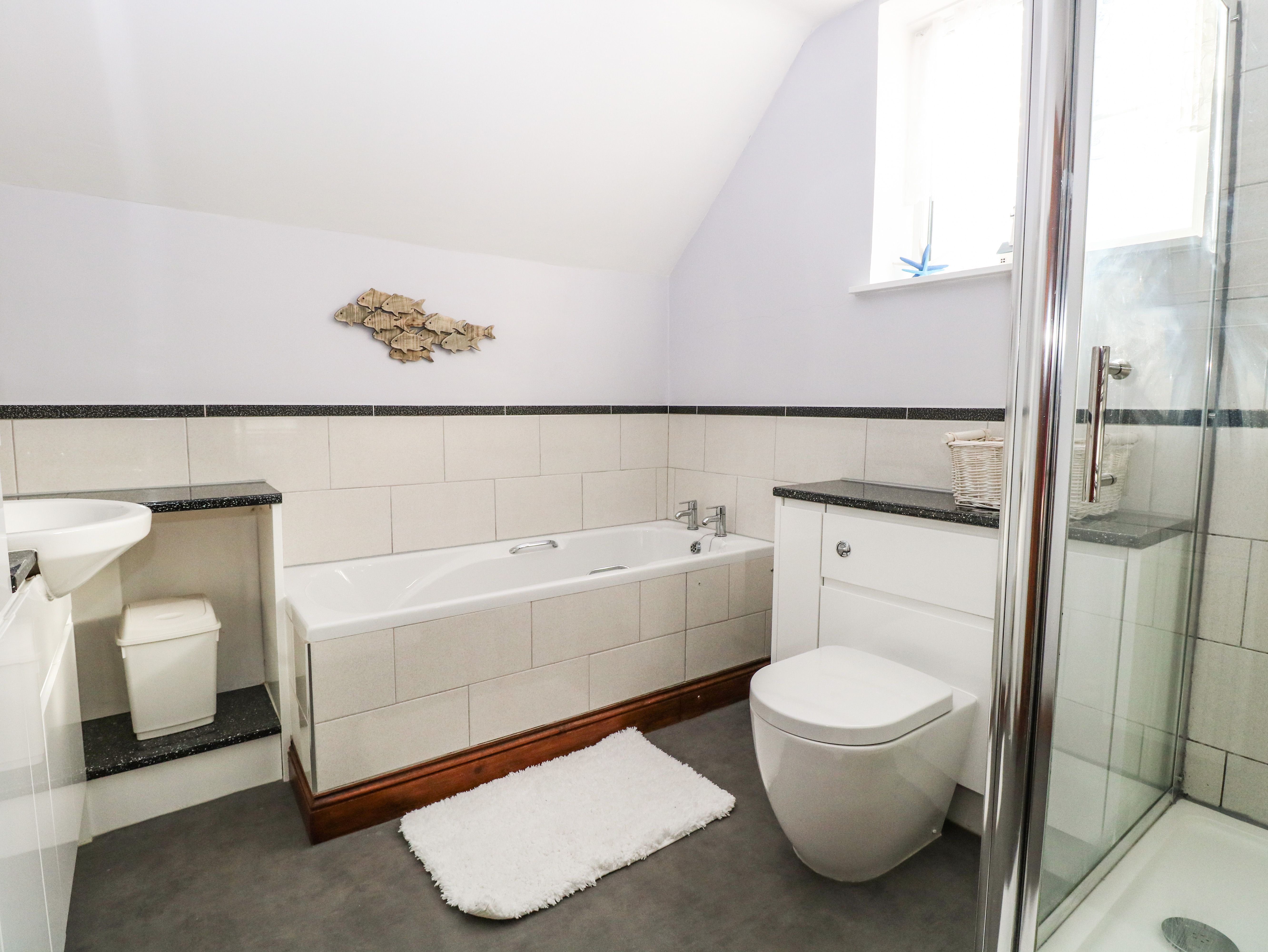 Amenities Oil central heating with woodburning stove. [Type] Oven and hob, microwave, fridge/freezer and dishwasher. Smart TV with Sky, WiFi. Fuel, power and starter pack for woodburning stove inc. in rent. Bed linen and towels inc. in rent. Highchair and travel cot available on request. Off-road parking for 2 cars. Enclosed front garden with lawned area and furniture. 3 well-behaved dogs welcome. Sorry, no smoking. Shop 0.8 miles, pub 1.4 miles, beach 1.5 miles. Note: The staircase is very steep and may not be suitable for those with mobility issues. Note: The property is close to a main road and busy roundabout so there may be road noise. Please note this property does not accept Sunday check-ins.