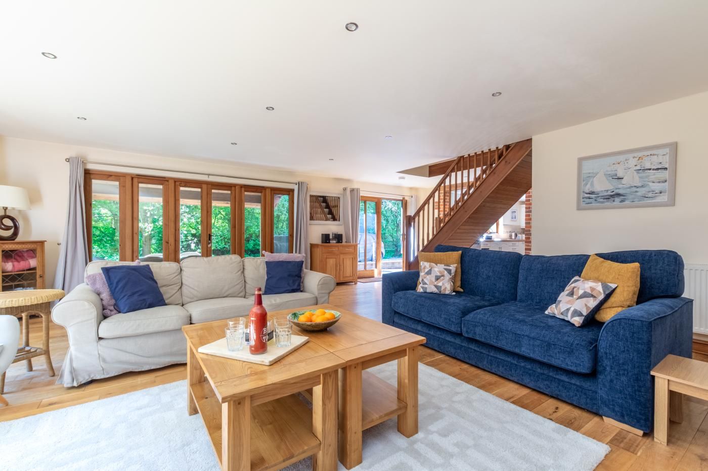 Step inside to find a spacious and sociable open-plan living area with calming neutral tones, ample soft seating, a wood burner and bi-folding patio doors.
