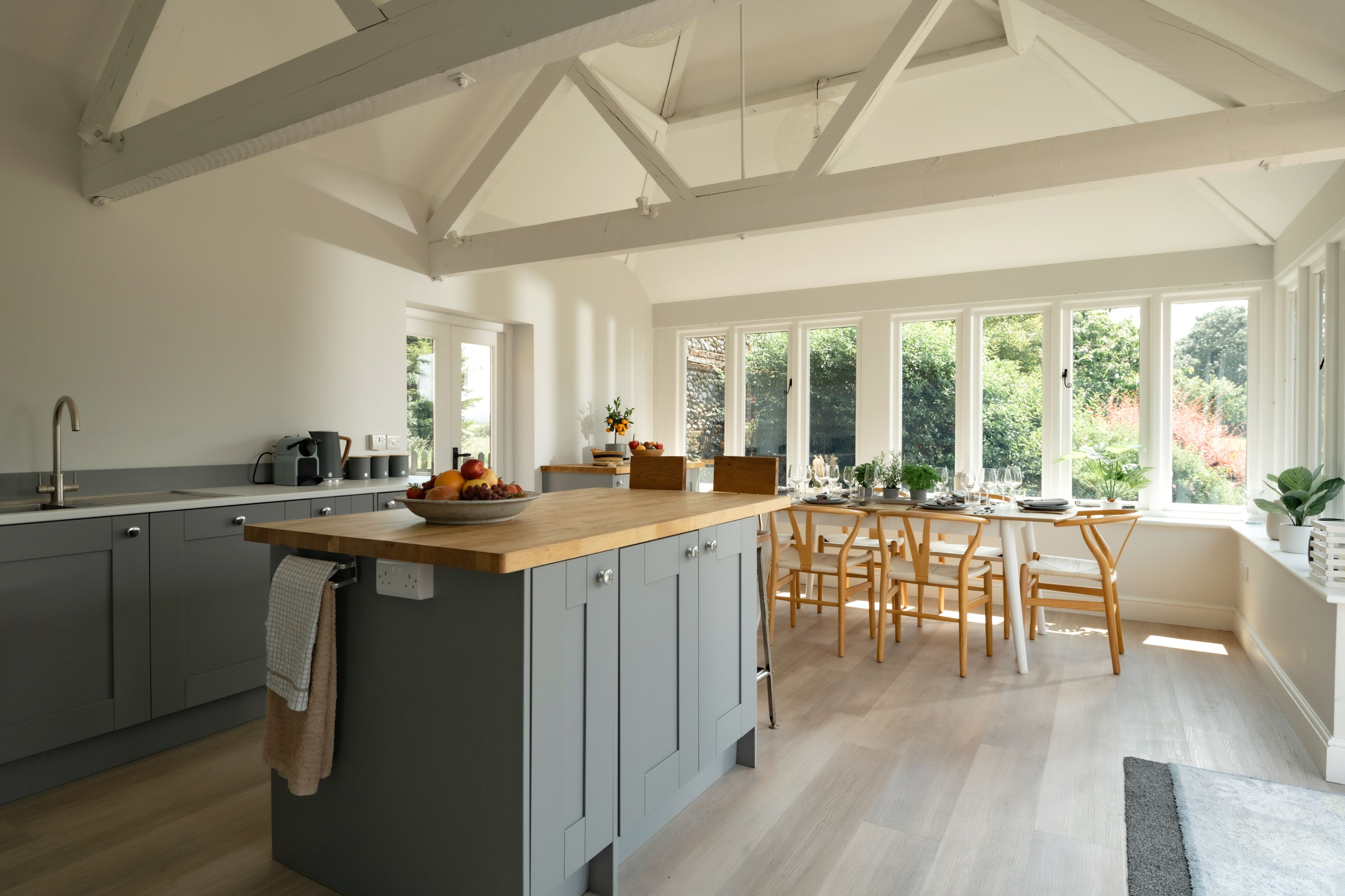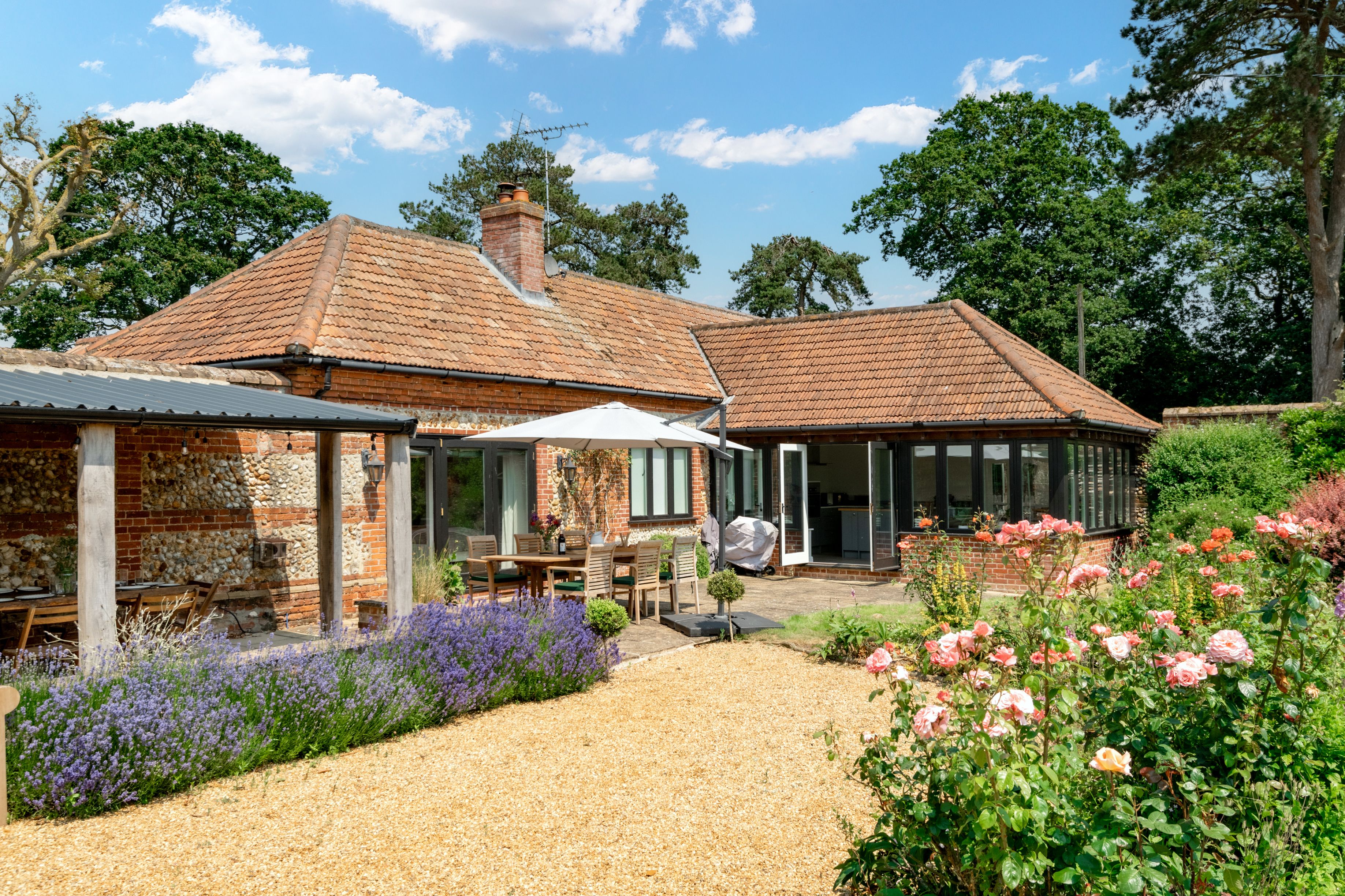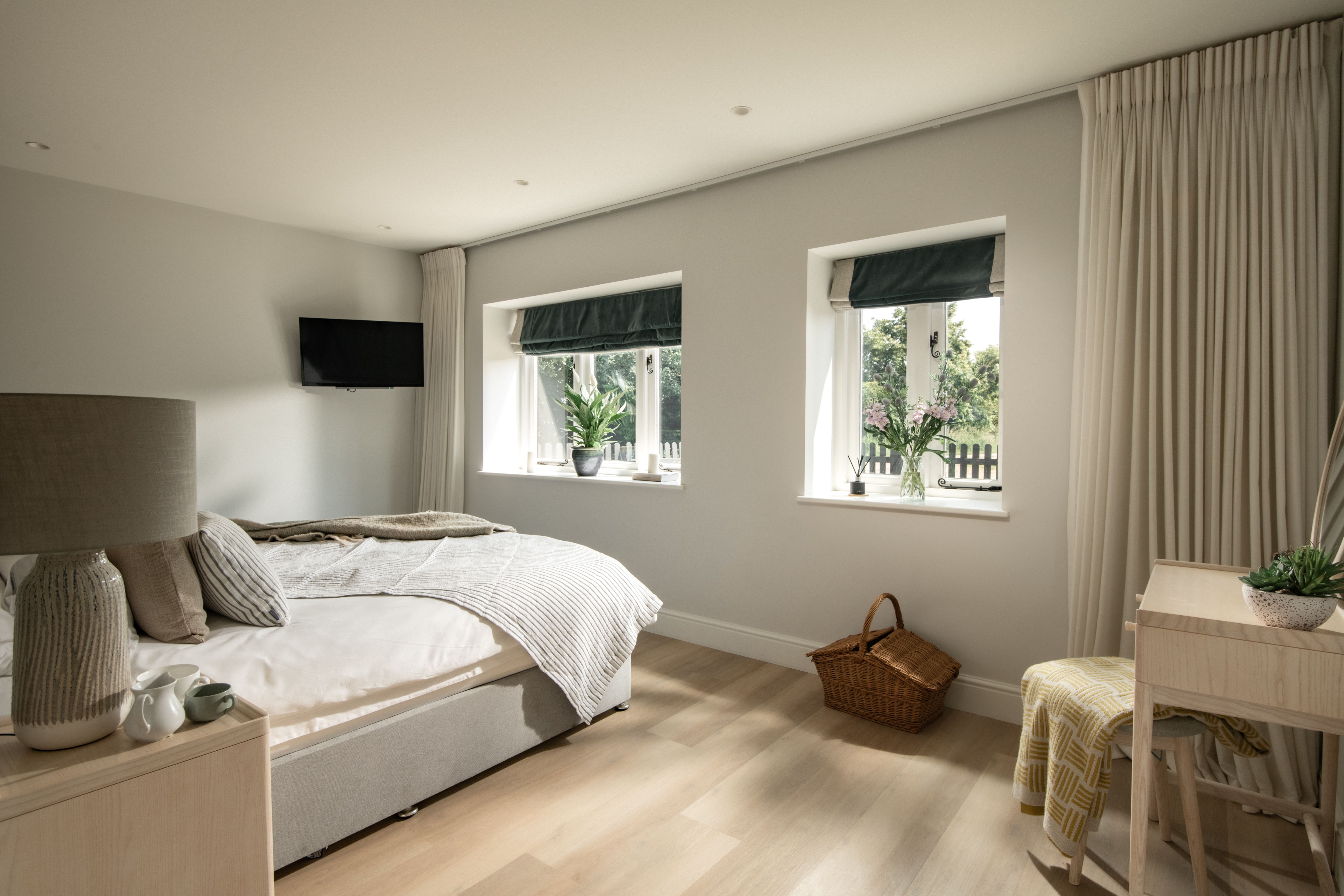 Set within 100 acres of parkland, these former stables put open countryside walks and wildlife on your doorstep. Wander across the fields to the deserted medieval village of Godwick, where a ruined church tower juts out from the ground. It’s also a half-hour drive to Wells-Next-the-Sea, a pretty seaside town in the Norfolk Coast AONB. The 19th-century stable block has been transformed into a cosy country bolthole for a family or group of friends. You can spot the village’s old church tower from your private garden, where a patio provides a place to sit in the sun and fire up the gas barbecue, and a vast lawn stretches before you. Or, head inside to the sunny kitchen diner where dining is set for the whole group. Scandi-chic interiors make for a relaxing living room, set around a traditional wood-burning stove should the weather turn chilly. Bedrooms blend in with the estate’s wonderful ladscape, with autumnal tree motifs on feature walls lulling you off to sleep. The only sounds around here are the swish of towering trees and birdsong in the morning.
