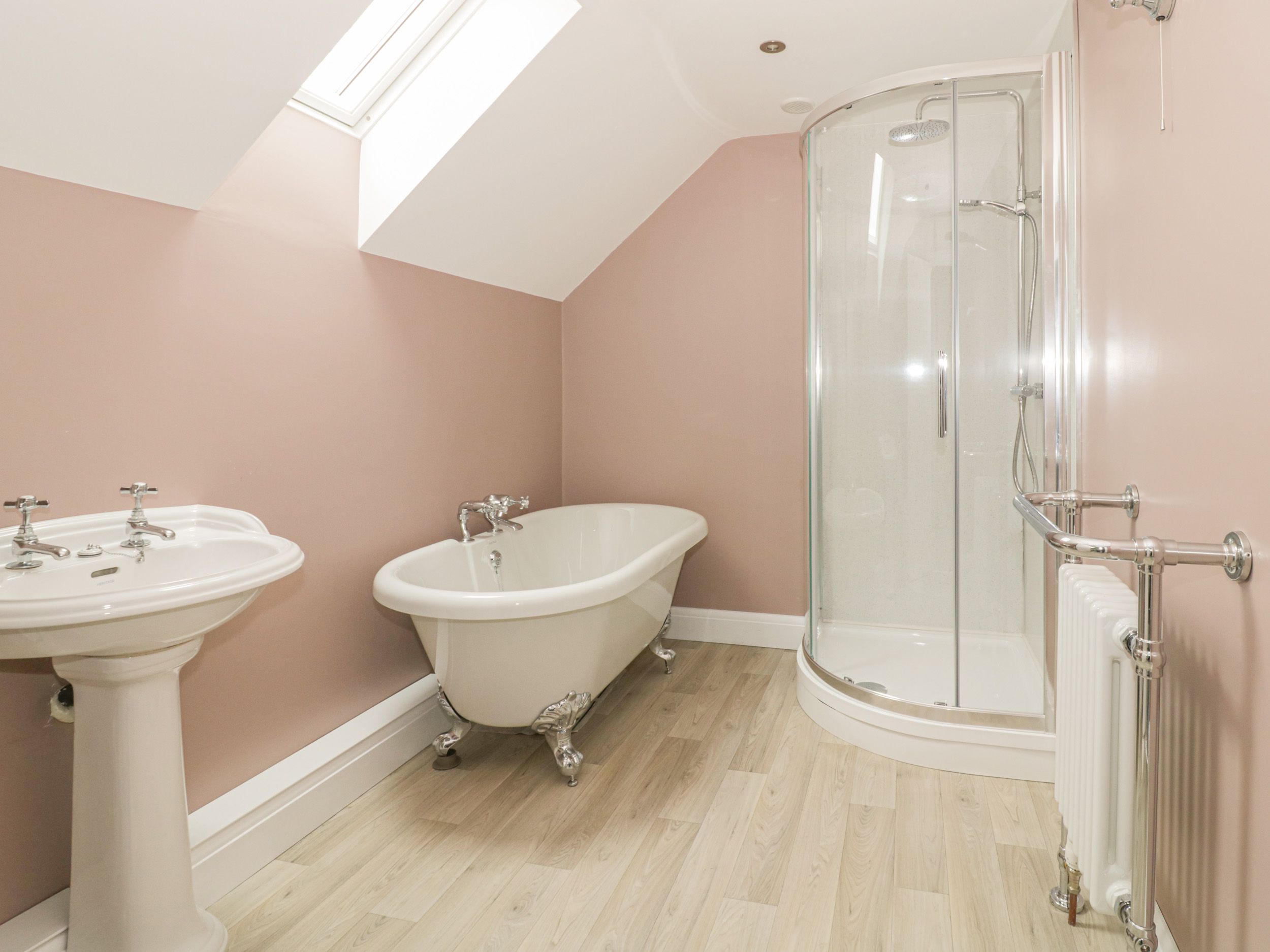 Five bedrooms over two upper floors: 2 x king-size bedrooms, 3 x twins. First Floor: 2x Twin and 2x King-size bedrooms. First Floor: Bathrooms: 1x with roll-top bath, walk-in shower, basin & WC & 1x with bath basin & WC. Second floor: Attic room twin with WC and hand basin. Ground floor shower room, basin and WC. Open-plan living room with kitchen, dining area (seating 10) and sitting area. Utility. Sitting room.