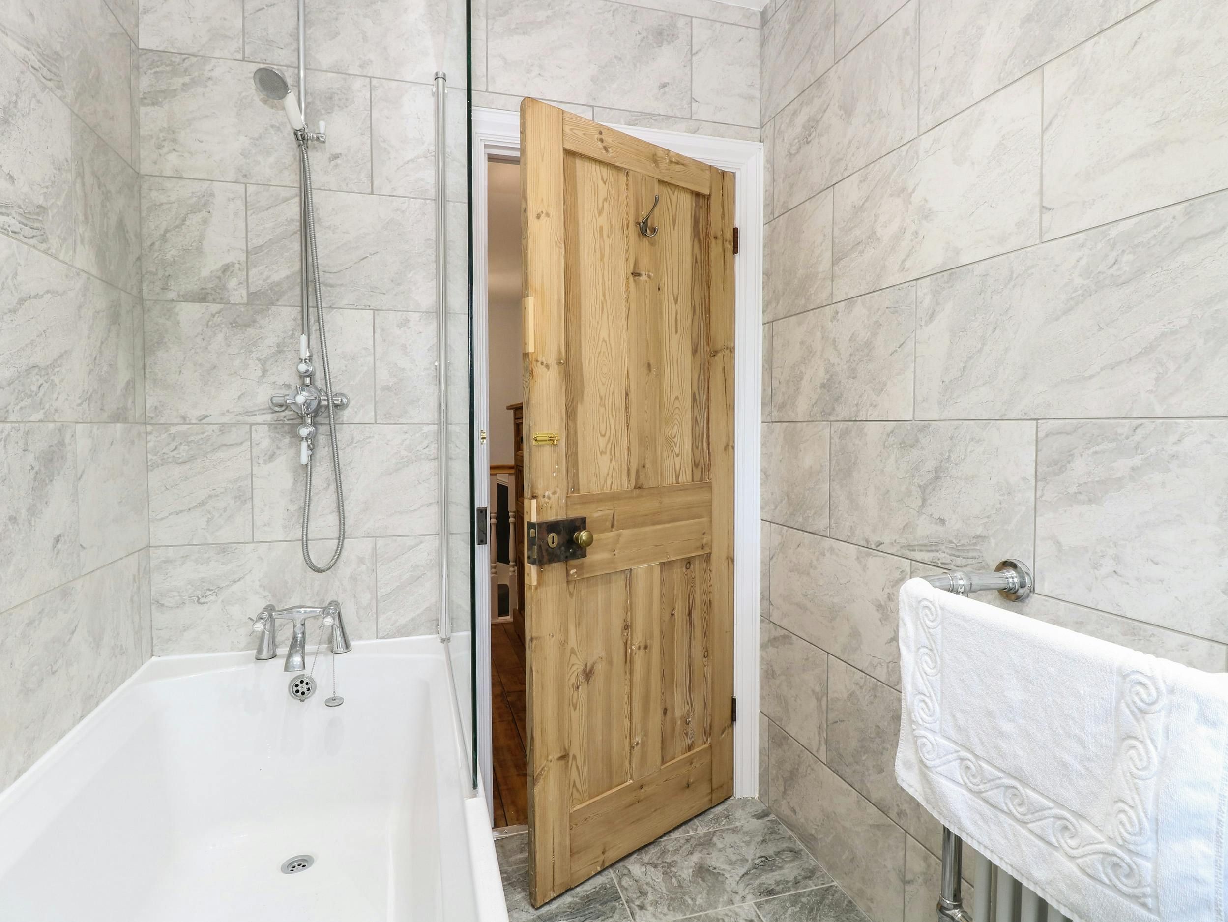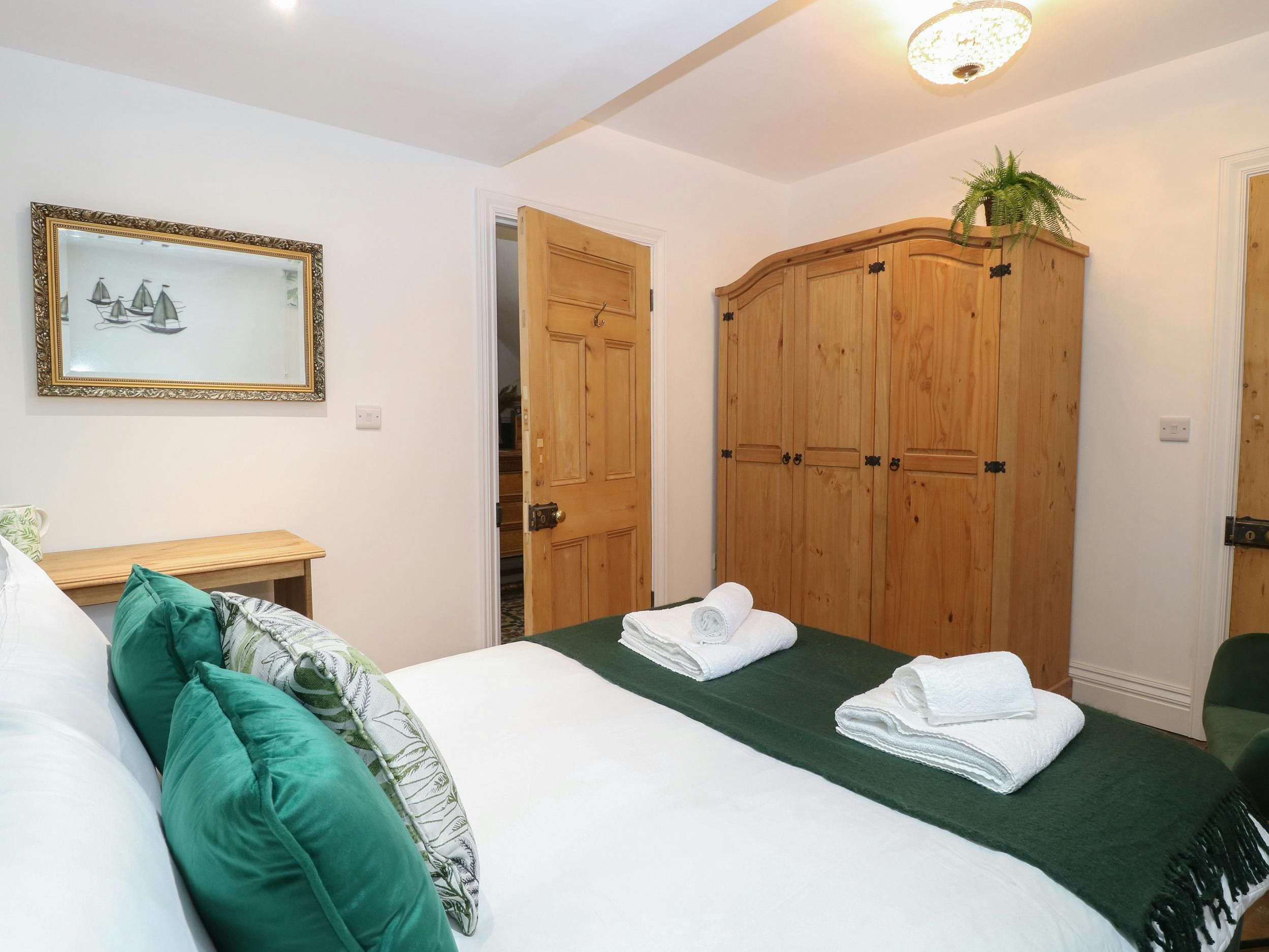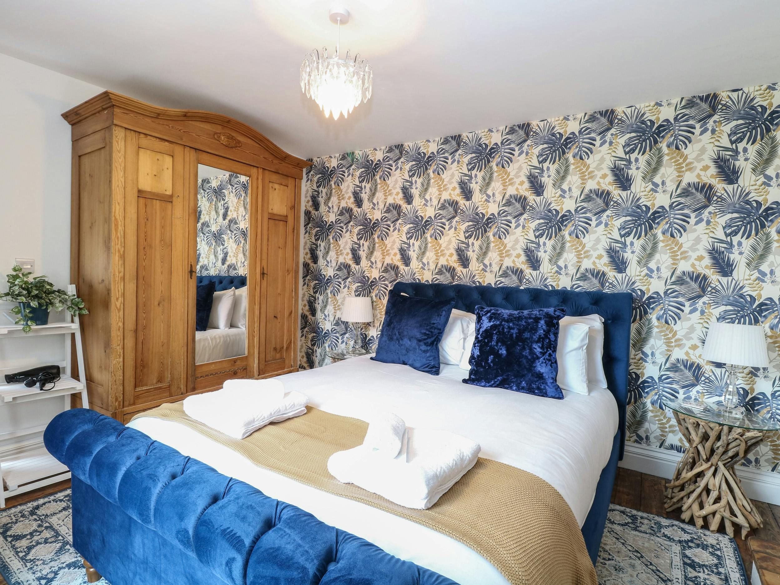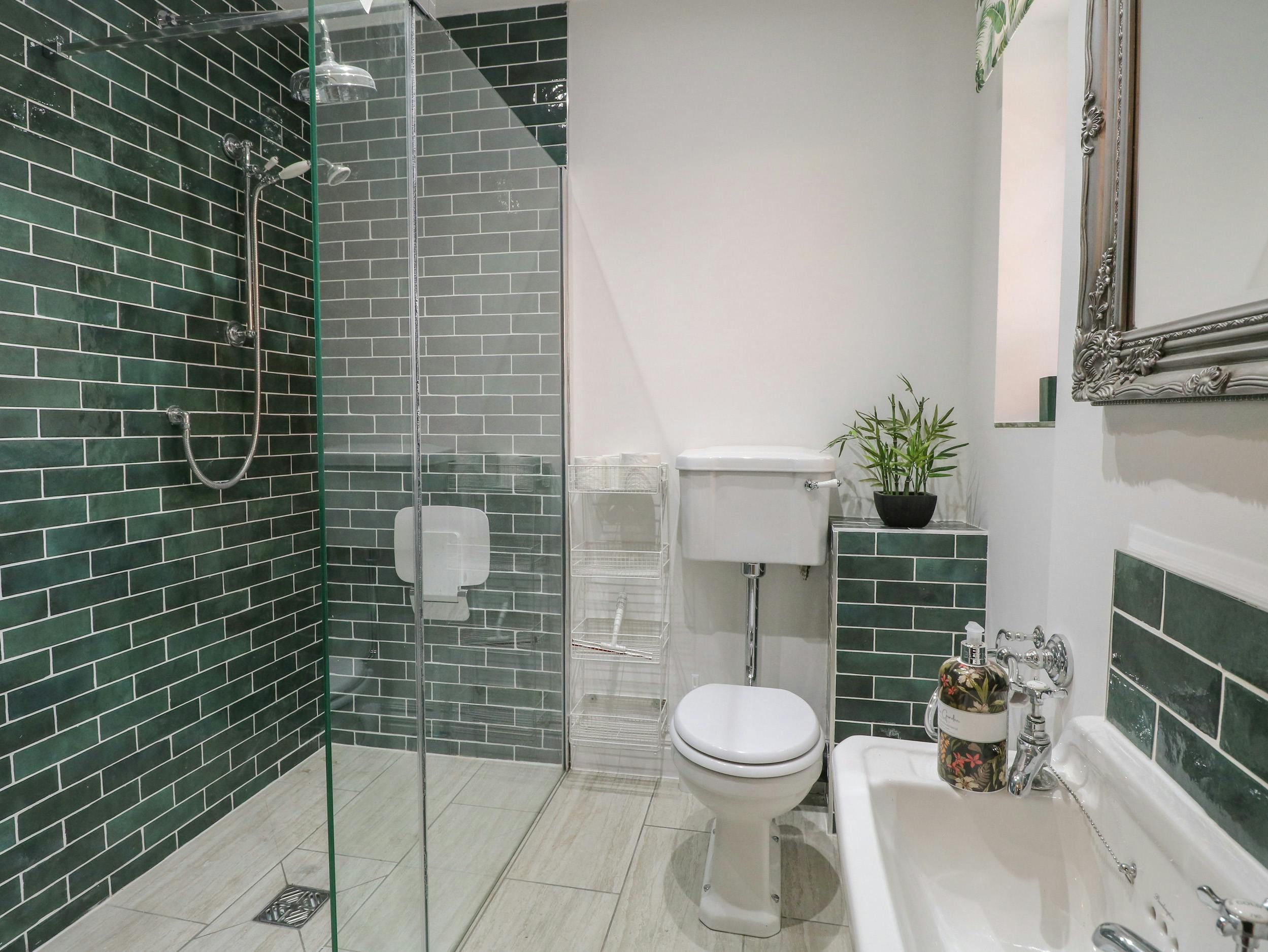 *A ground-floor bedroom is equipped with a wheelchair-accessible shower. There are steps down to the king-size bedroom.