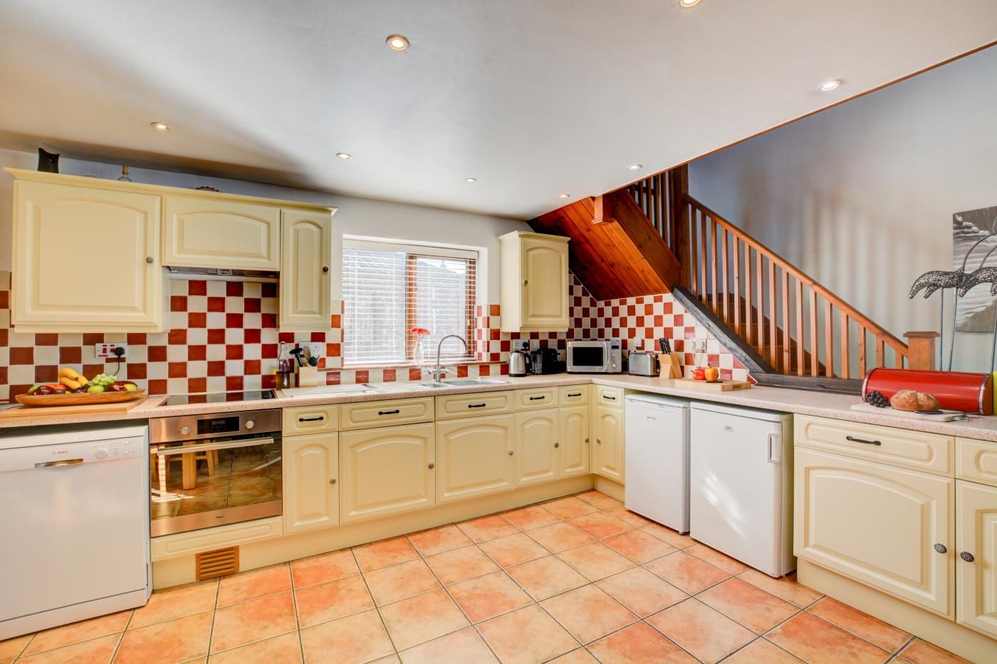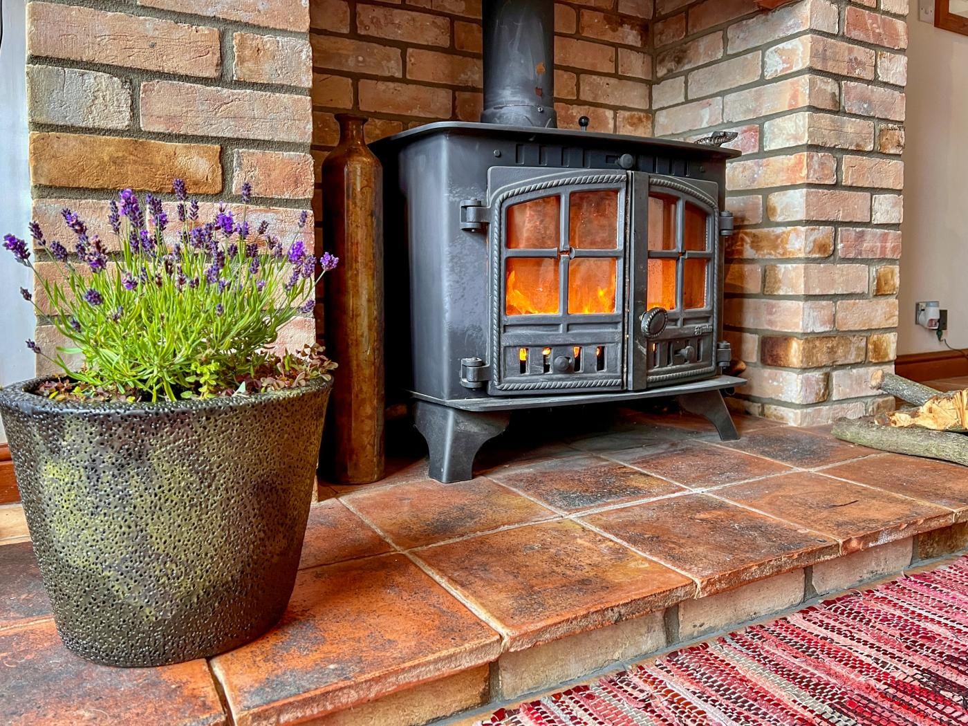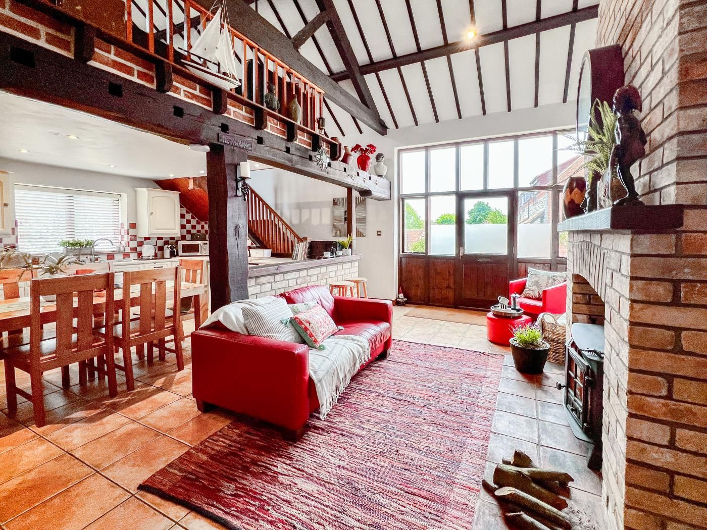 Step inside to find yourself in an open-plan lounge/kitchen/diner with a high cathedral-style wooden-beamed ceiling, and a cosy seating area next to the warming wood burner.