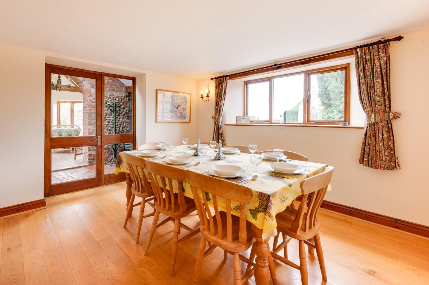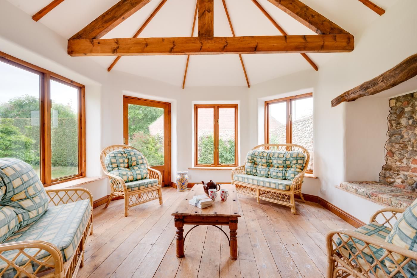 Located opposite the village church in the rural Norfolk village of Field Dalling, this meticulously renovated barn conversion offers a delightful haven for families and groups of friends with its lovingly preserved original features, light-filled garden room and leafy, lawned grounds.