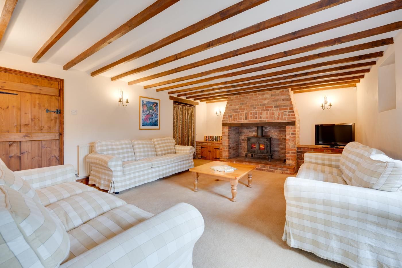 This captivating two-storey home exudes rustic charm. Step into the generously proportioned lounge, complete with comfortable seating, an enchanting beamed ceiling, and a decorative inglenook fireplace.