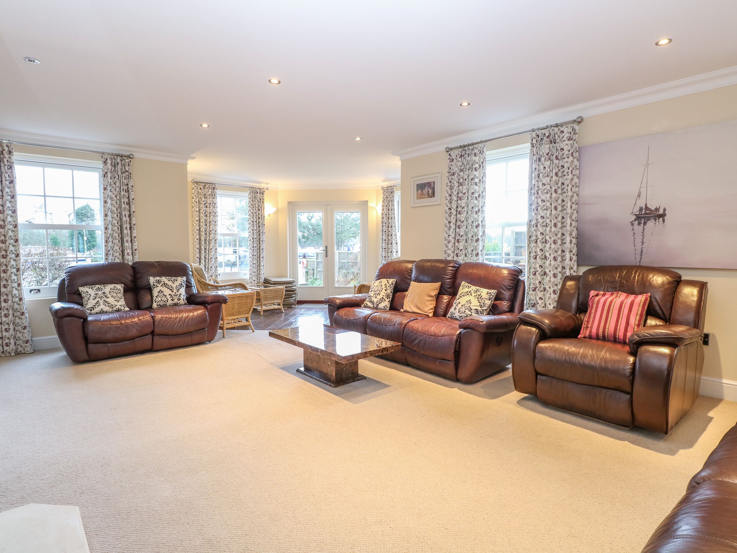 Accomodation Details Five bedrooms: 1 x super-king-size with TV and en-suite with bath, walk-in shower, basin, and WC, 1 x super-king-size with TV and en-suite walk-in-shower, basin, heated towel rail, and WC, 1 x super-king-size, 1 x twin ground-floor twin, 1 x twin. Bathroom with bath, shower over, basin, heated towel rail, and WC. Cloakroom with basin and WC. Kitchen. Utility. Dining room. Sitting room. Please note: This property doesn't accept Sunday check ins.