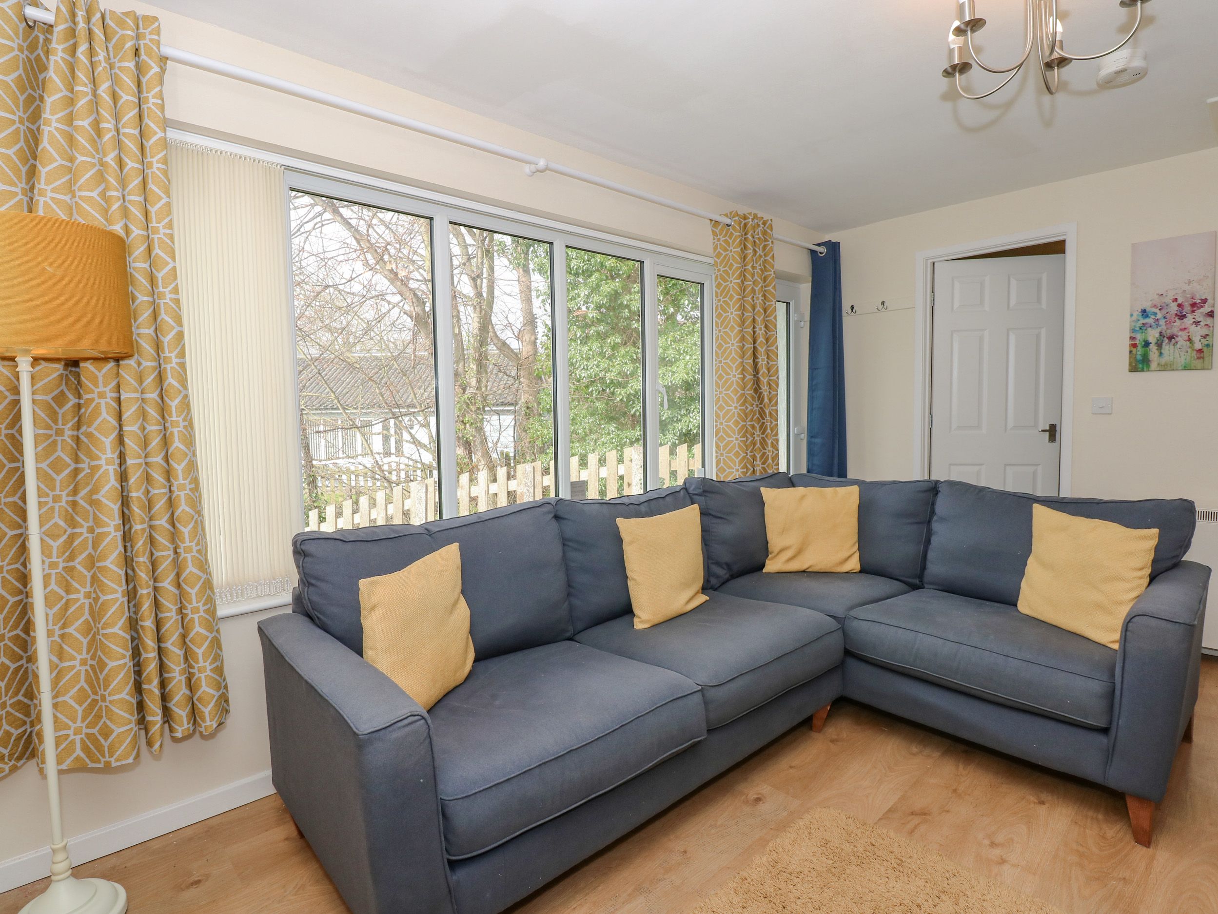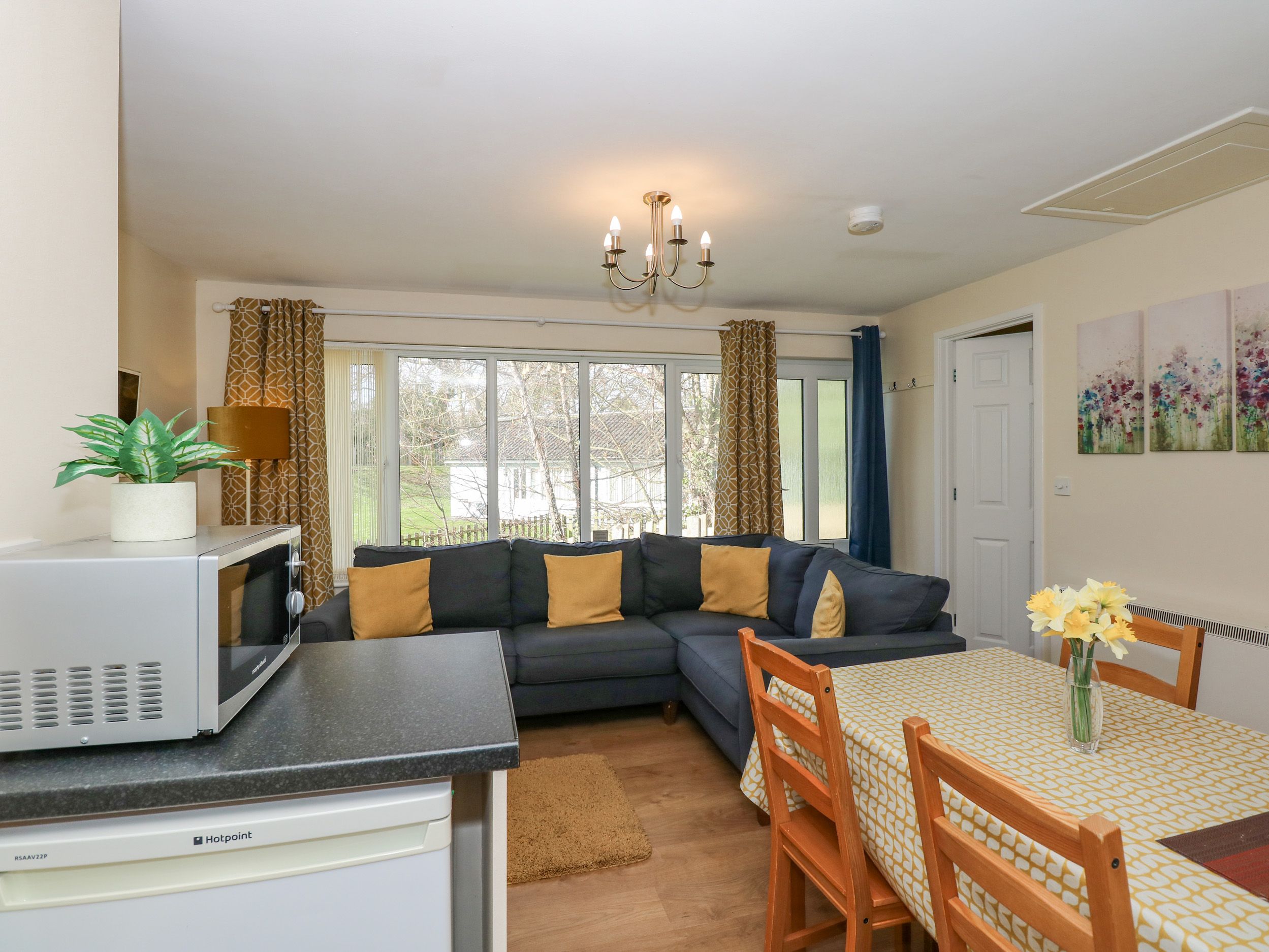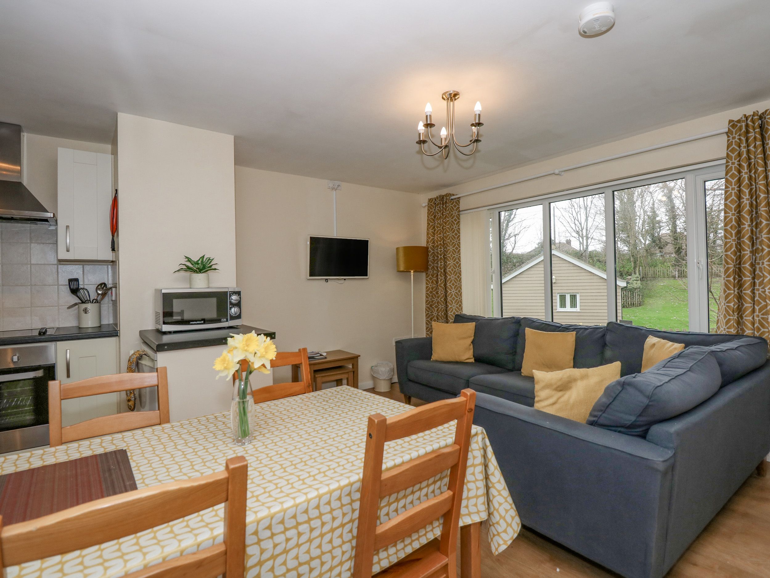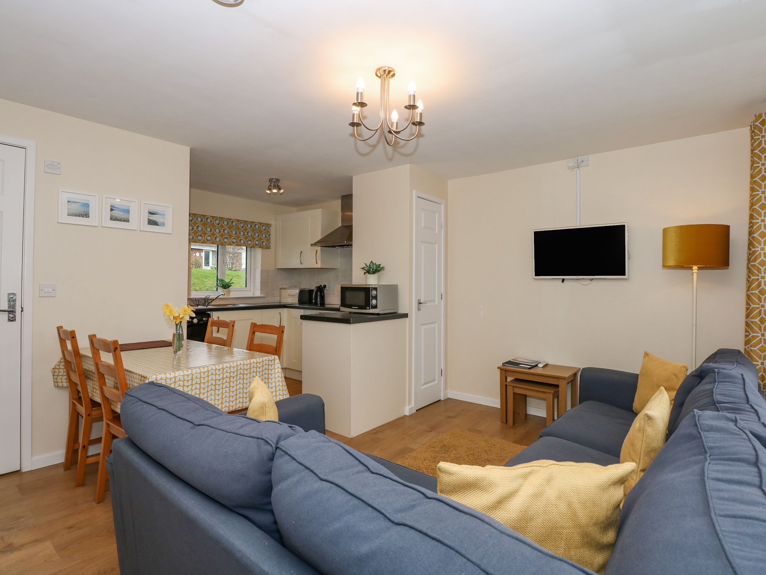 Single-storey. Two bedrooms: 1 x double, 1 x twin. Shower room with walk-in shower, basin and WC. Open-plan living space with kitchen, dining area and sitting area