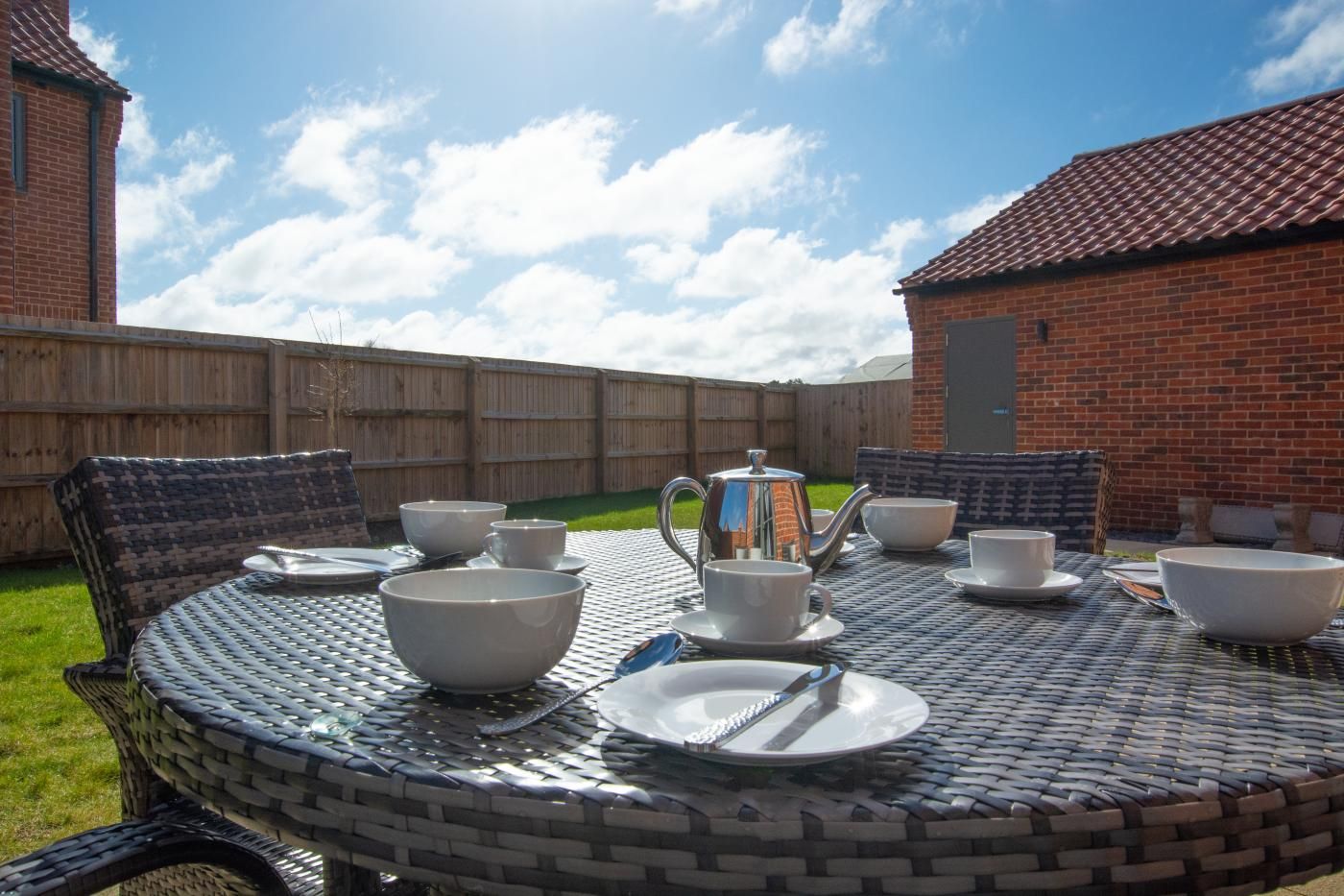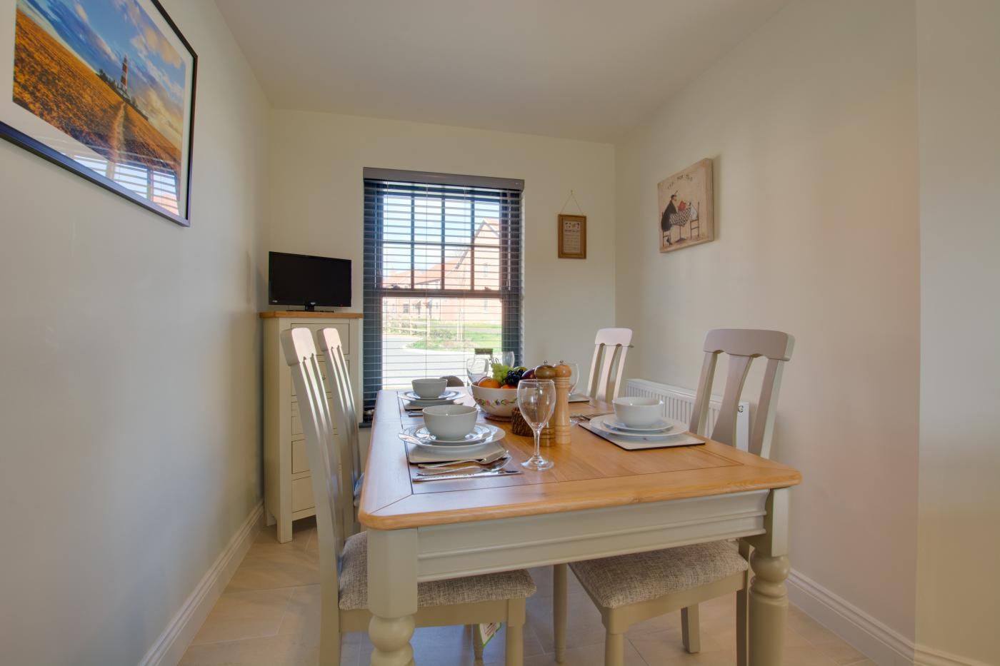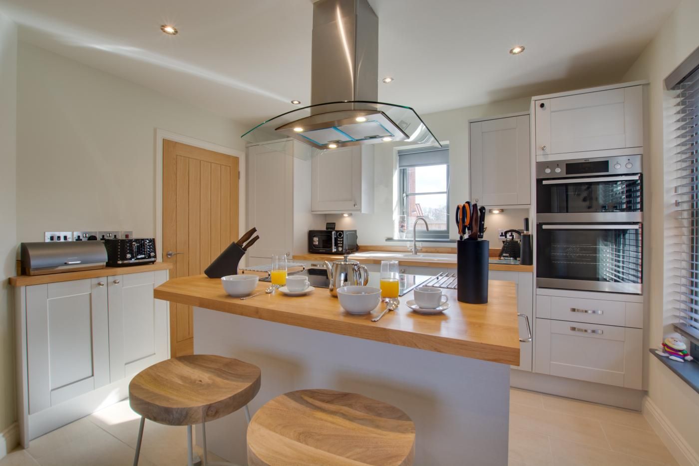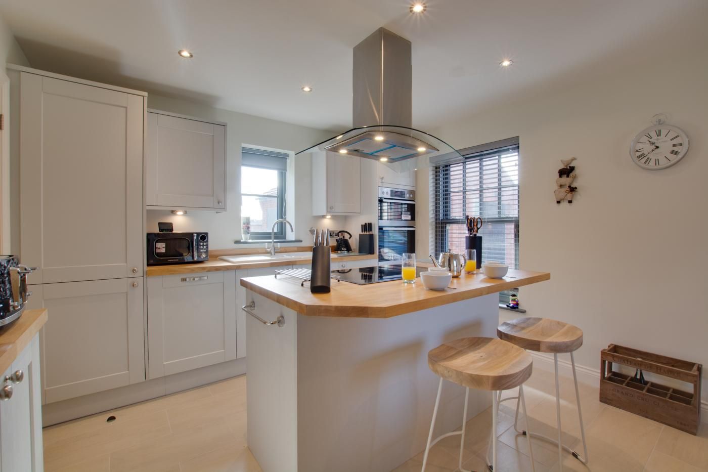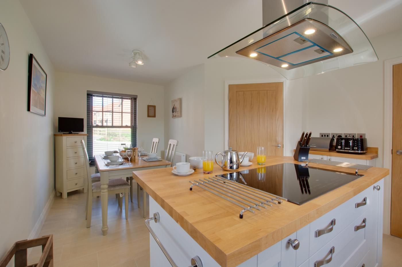 Step inside to find a bright, neutral-toned kitchen/diner with farmhouse-style units boasting an island with a breakfast bar plus an intimate dining area with a wooden table with seating for four.