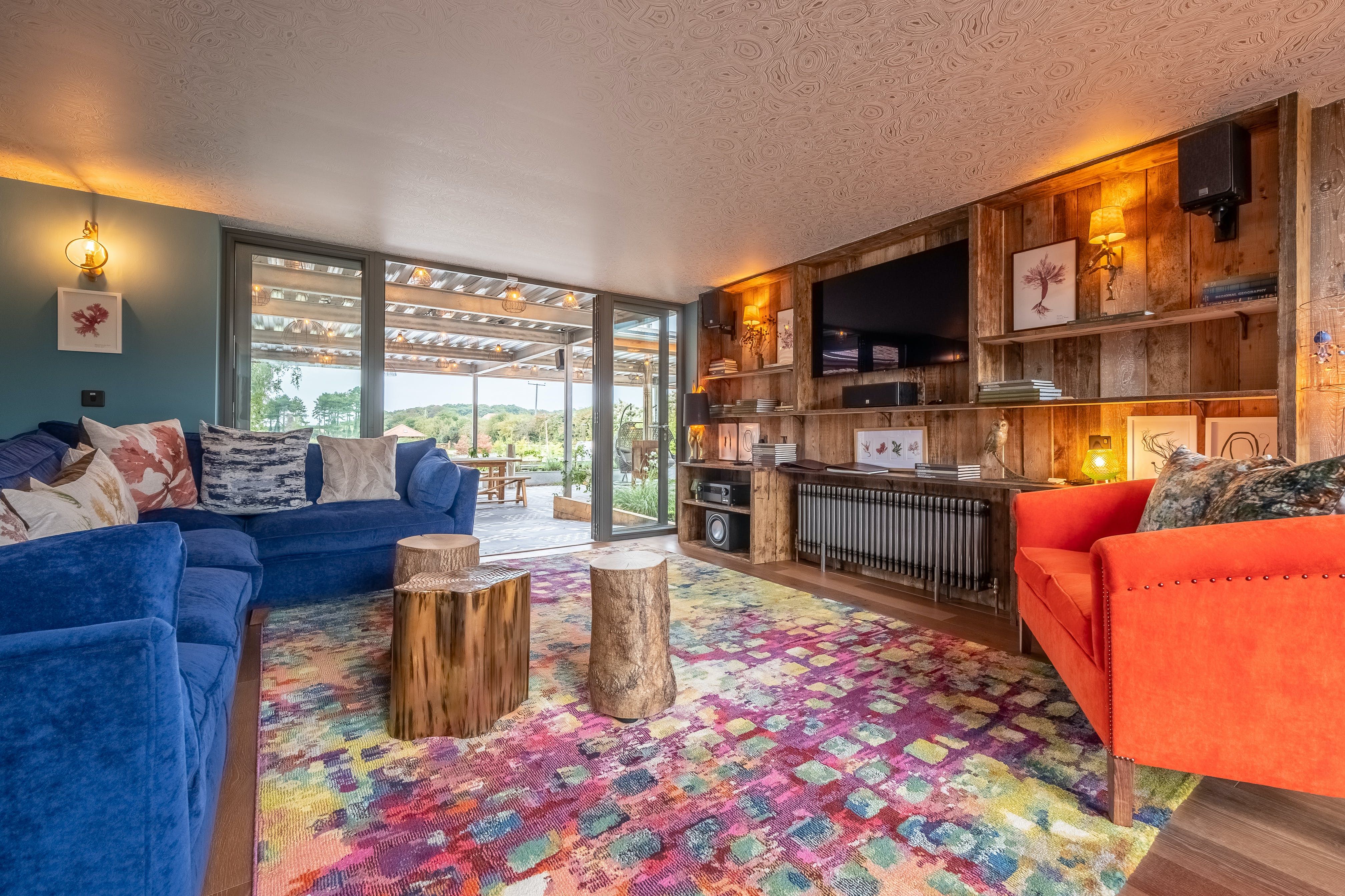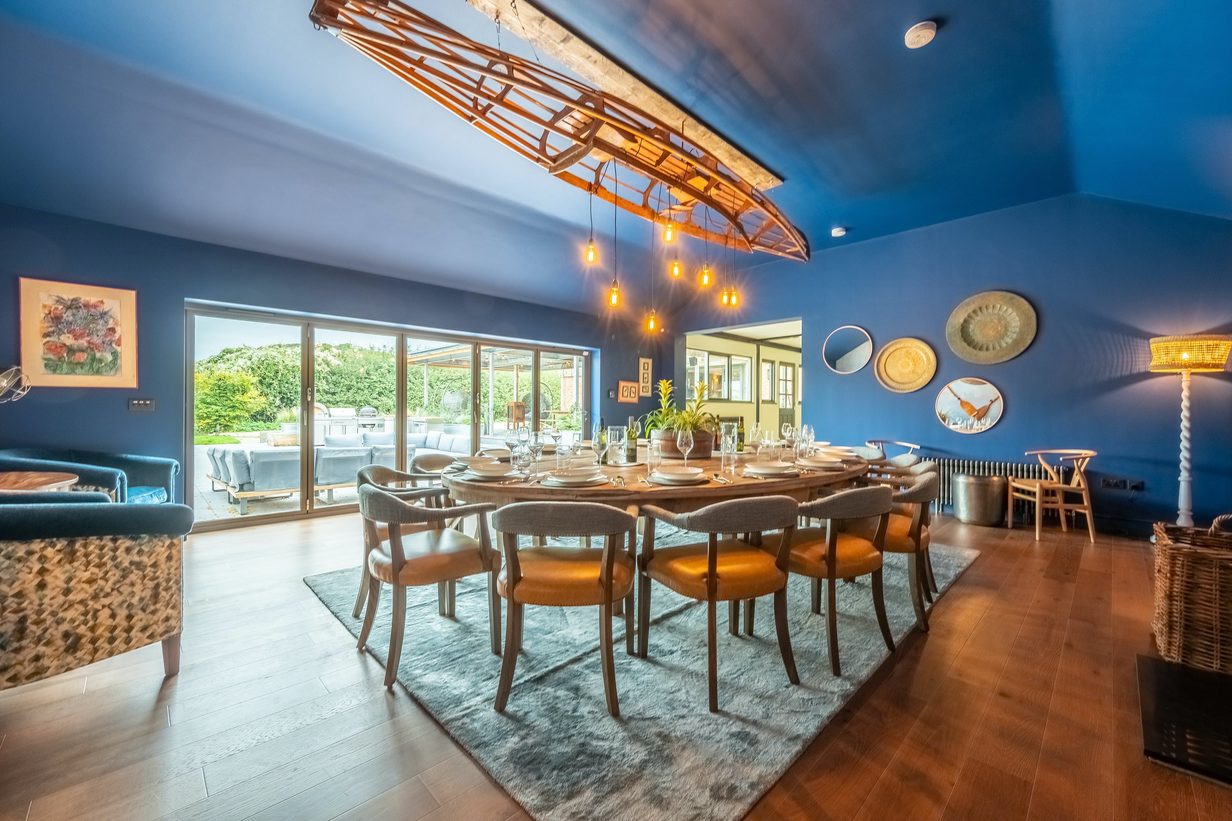 Designed for inside-outside living in all seasons, kickstart your day by relaxing in the wood-fired hot tub, detoxing in the sauna, or jumping into the Scandinavian cold plunge pool. When thoughts turn to food, there's a gold-standard Swedish outdoor kitchen to grill and chill and a covered heated terrace with a sound system to keep the night flowing. Fancy getting your glad rags on and dialling up a private chef? Then the atmospheric dining area inside has glamorous soiree written all over it, and the dressing-up cupboard will bring all the party vibes.