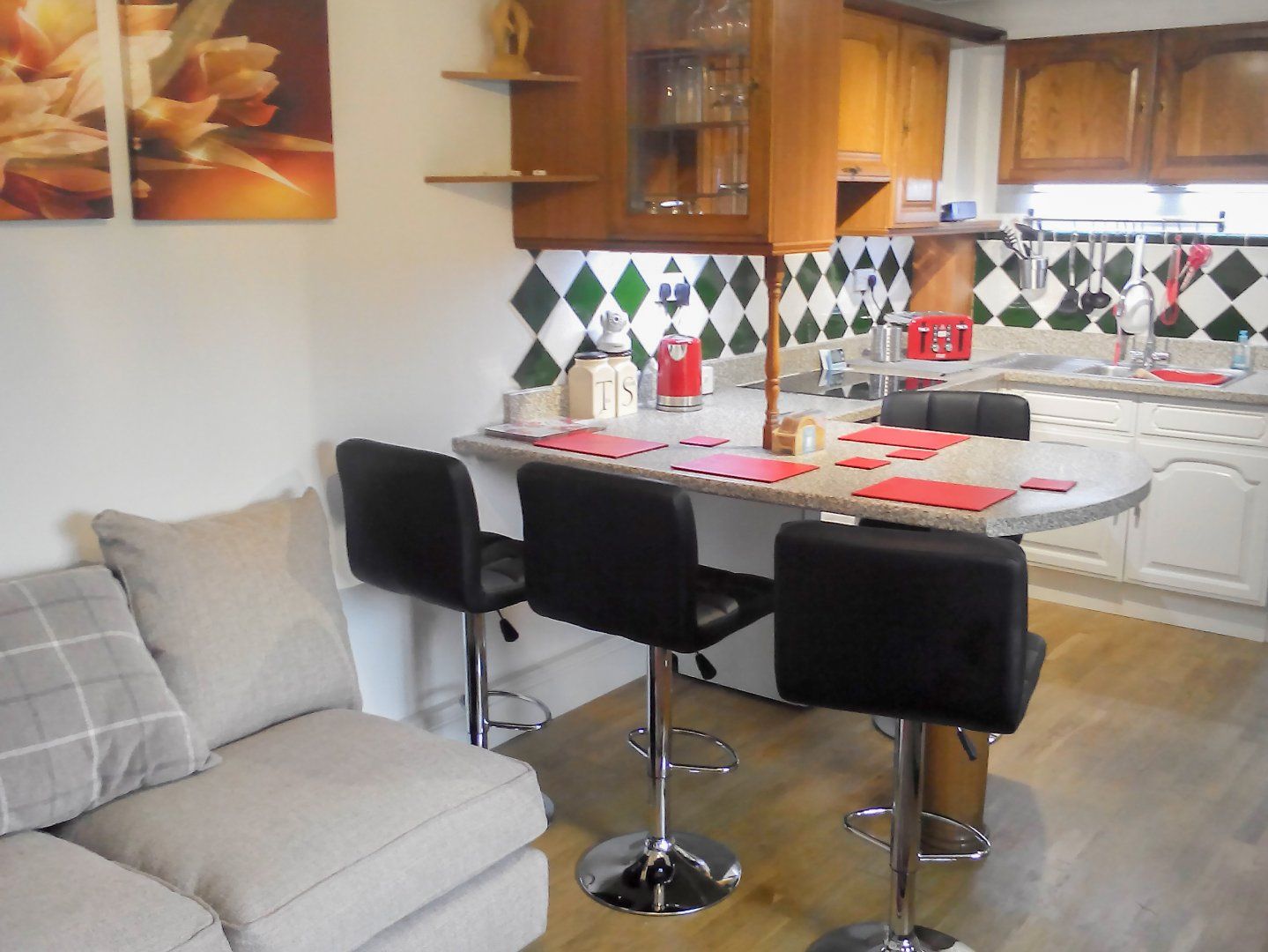 Accomodation Details All ground floor. Two bedrooms: 1 x twin with TV, 1 x single with pull-out trundle bed . Bathroom with bath, separate shower, basin and WC. Open plan living area with kitchen, breakfast bar (seats 4) and sitting area.