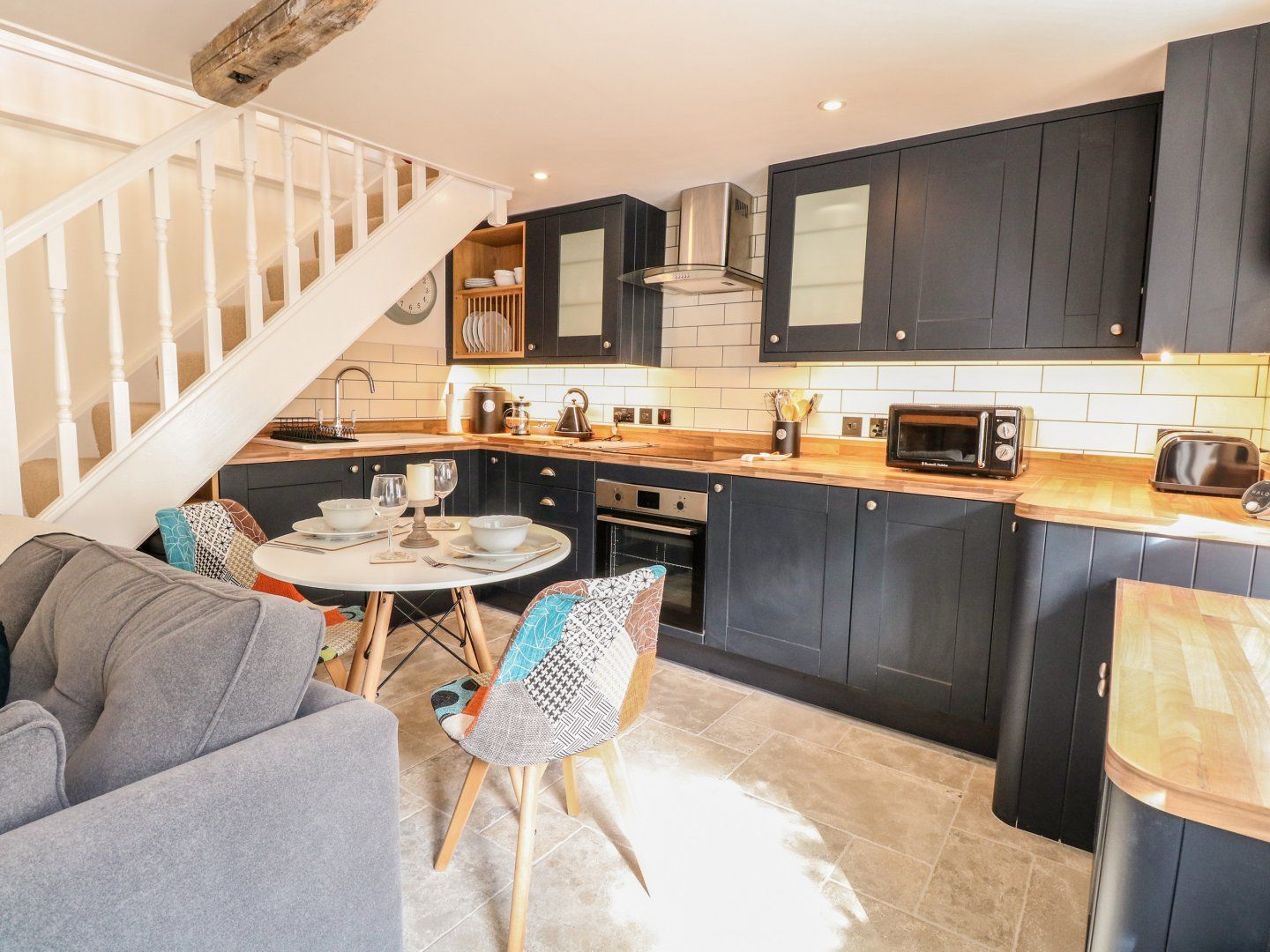 Accomodation Details One double bedroom with TV, freestanding bath and en-suite walk-in shower, basin and WC. Open-plan living space with kitchen, dining area and sitting area with woodburning stove
