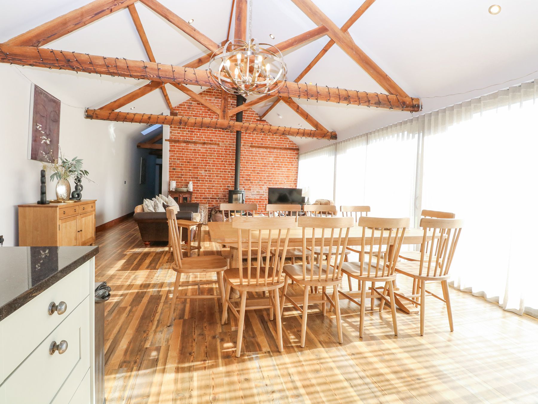Holiday home The living areas in this single-storey barn conversion consist of an open-plan living space with kitchen equipped with electric oven and hob, microwave, fridge, freezer, washing machine tumble dryer and dishwasher, dining table and sitting area with woodburning stove and Smart TV. The bedrooms all contain Smart TVs and en-suite shower rooms and consist of a super-king-size (zip/link), a double, a family room with super-king-size (zip/link and single and a family room with king-size and single. 2 X Cots available. Outside there is off-road parking for four cars and an enclosed lawn and patio with barbecue. One well-behaved dog welcome. With 1.6 miles there is a shop and pub. Sorry, no smoking. WiFi, fuel, power, starter for woodburning stove, bed linen and towels are all included in the price. Explore Norfolk at Shorthorn Barn .