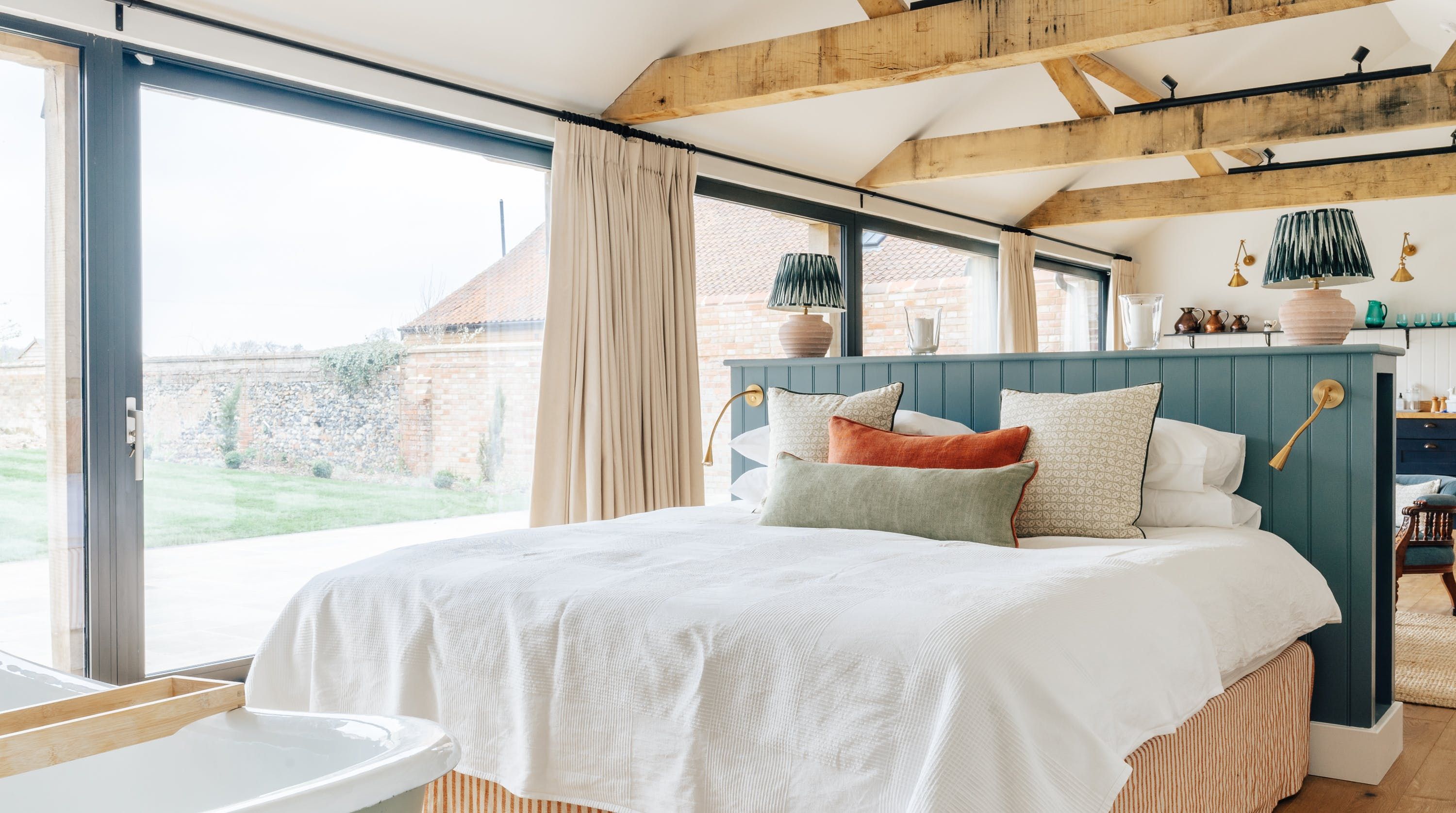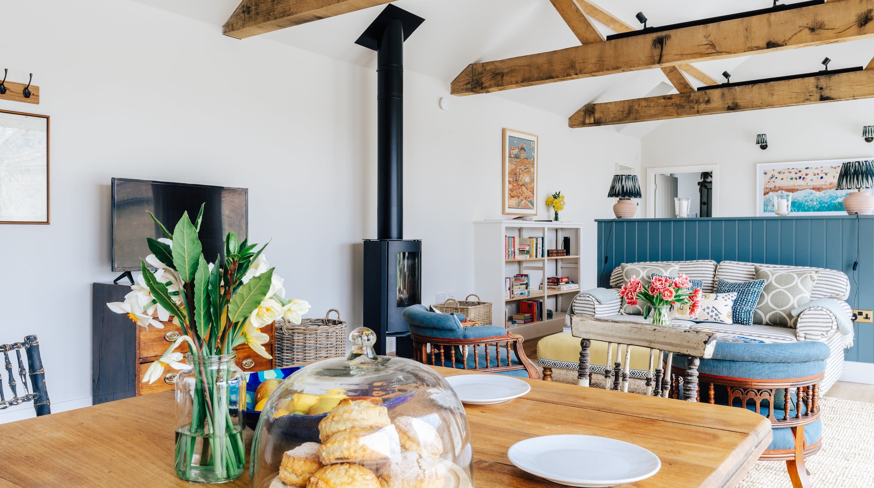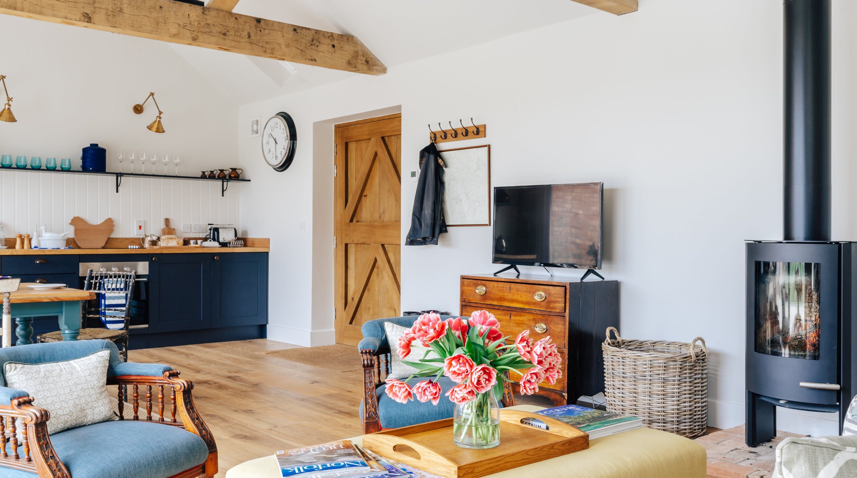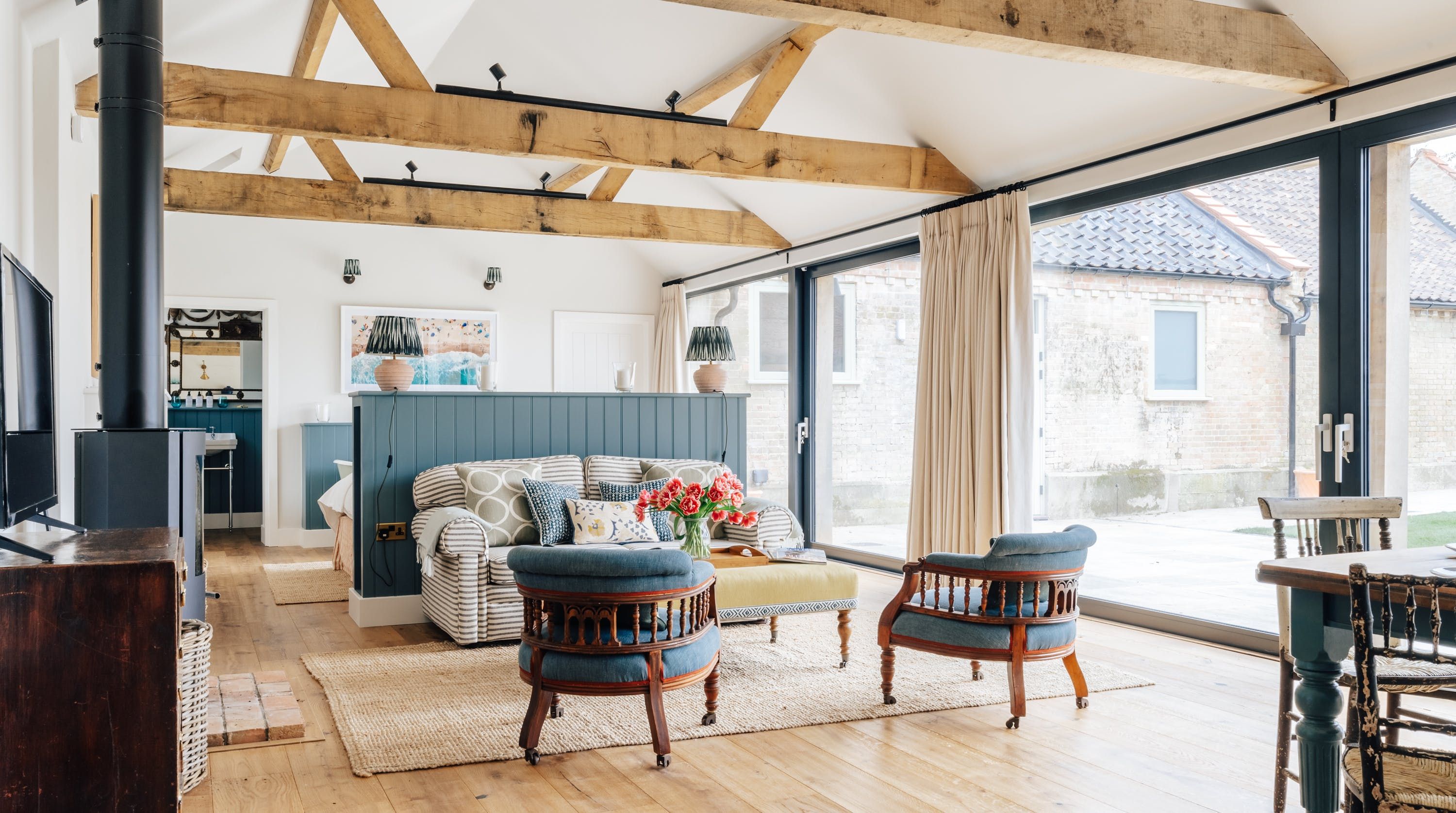 Inside, vaulted ceilings sport original wooden beams, while enormous glass walls flood the space with sunlight. Books and board games line the shelves, cushy sofas are perfect for snuggling and a delightful wood burner keeps everything toasty warm on chilly evenings. We love the small but well-equipped kitchen – you'll have everything you need to rustle up dinner – and the sumptuous bathtub is just the ticket after an invigorating walk through the countryside. On summer days, take your relaxing onto the private courtyard garden, gathering around the fire pit and firing up the barbecue for an alfresco feast when you grow peckish.