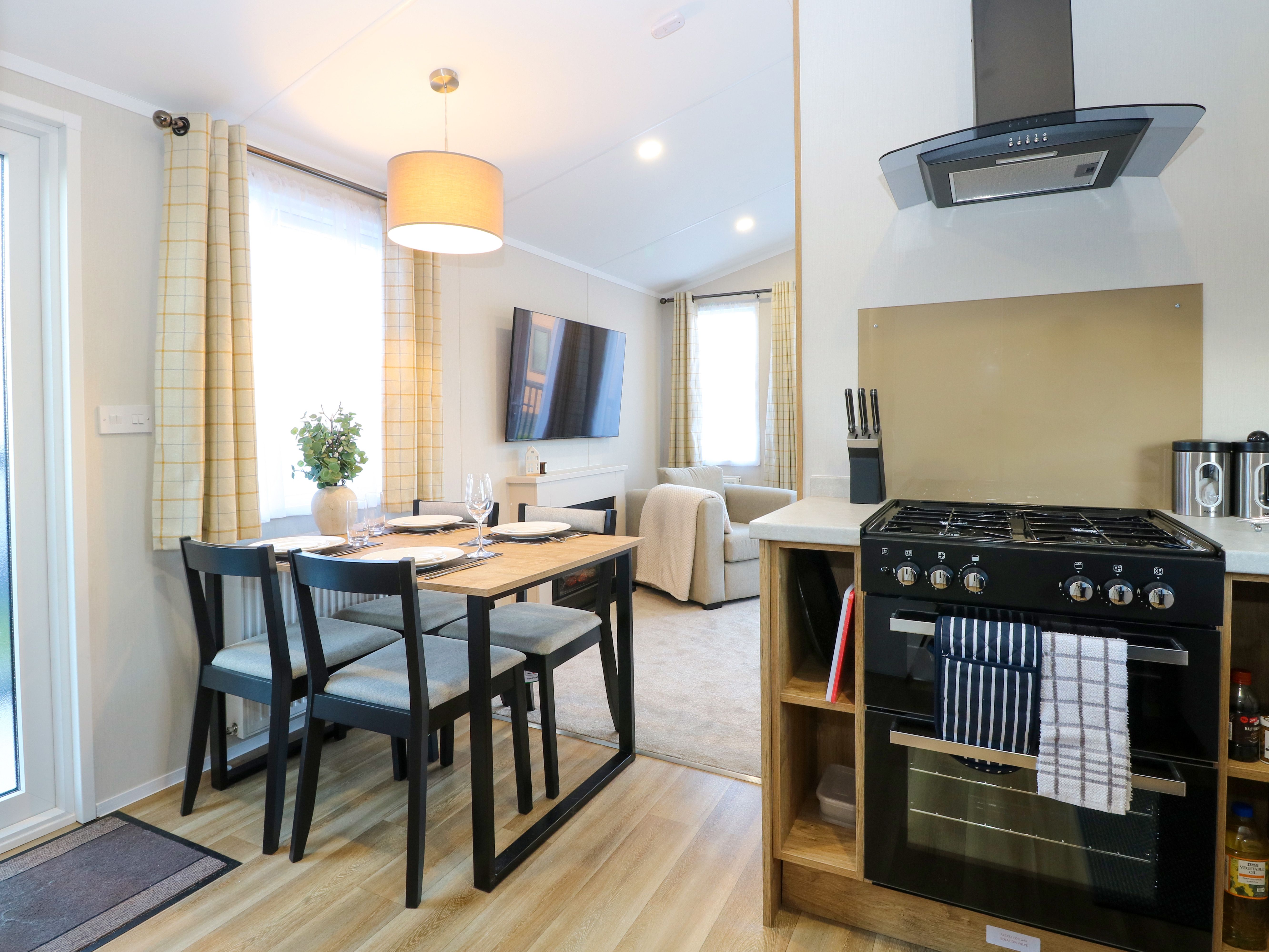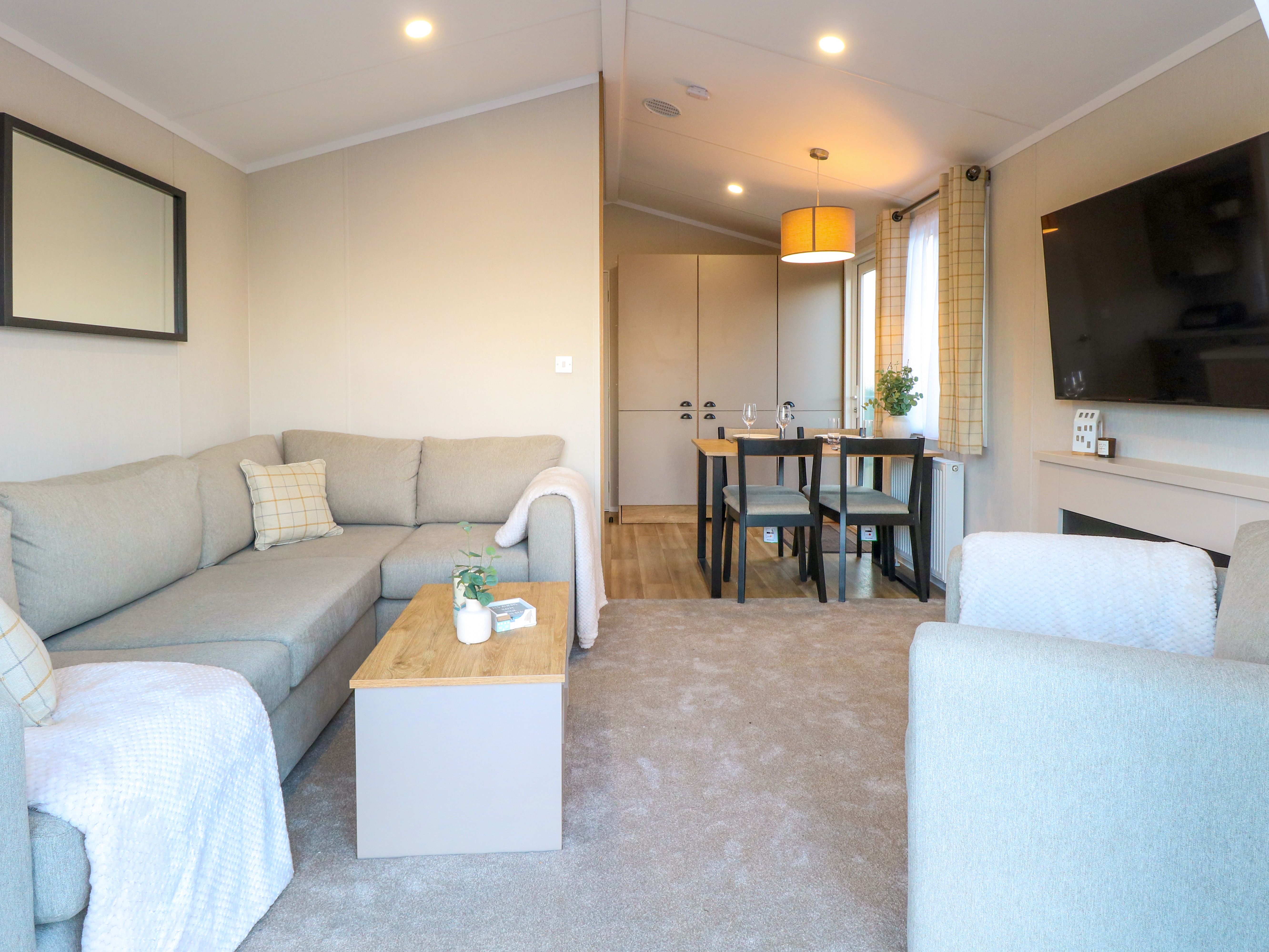 Holiday home The Sea Lodge, a single-storey caravan, consists of an open-plan living space including a kitchen with gas oven and hob, microwave, fridge/freezer, and washing machine, a dining area with dining seating for four guests, and a sitting area with Smart TV and electric fire. The bedrooms consist of a king-size with en-suite walk-in shower and a twin. There is a shower room with walk-in shower, basin, heated towel rail, and WC. WiFi, fuel, power, bed linen, and towels are included in the rent. Outside, there is an enclosed front decking with sea views and off-road parking for one car. One well-behaved dog welcome. Sorry, no smoking. Shop 0.2 miles, pub 1.2 miles, beach 0.1 miles. Stay at The Sea Lodge for your next picture-perfect holiday. Note: This property has a Good Housekeeping Bond of £250. Note: Although this is a single-storey property, there are a few steps up to entrance. Note: Check-in 3pm, Check-out 10am. Note: From February 2025, there will be a lodge located on the empty plot in front of The Sea Lodge. Note: There are currently ground-works taking place on-site, these works are not completed during evening and weekends