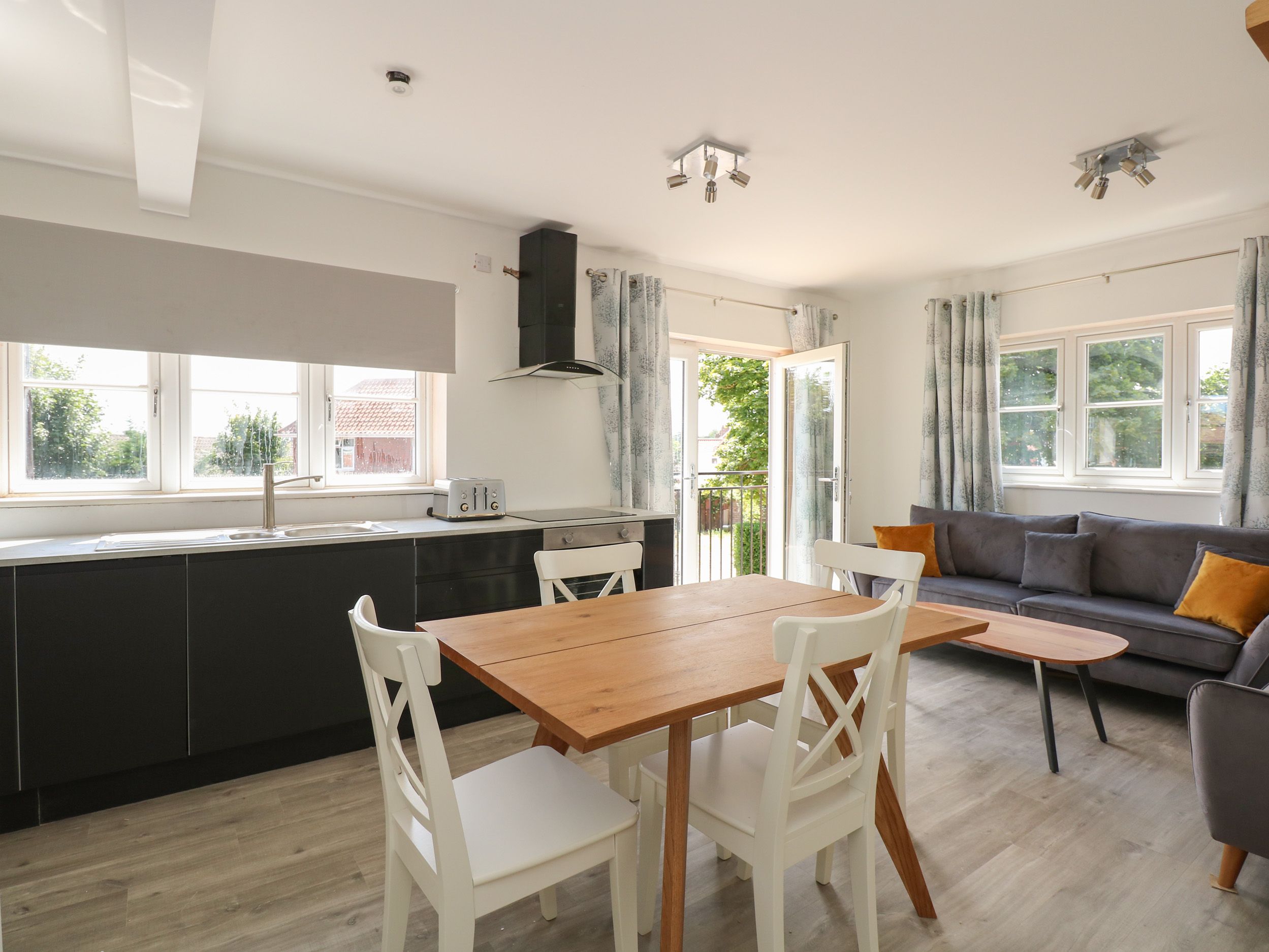 Accomodation Details First-floor apartment. Two bedrooms: 1 x double with en-suite walk-in shower, basin and WC, 1 x twin. Shower room with walk-in shower, basin and WC. Open-plan living space with kitchen, dining area, sitting area and Juliet balcony