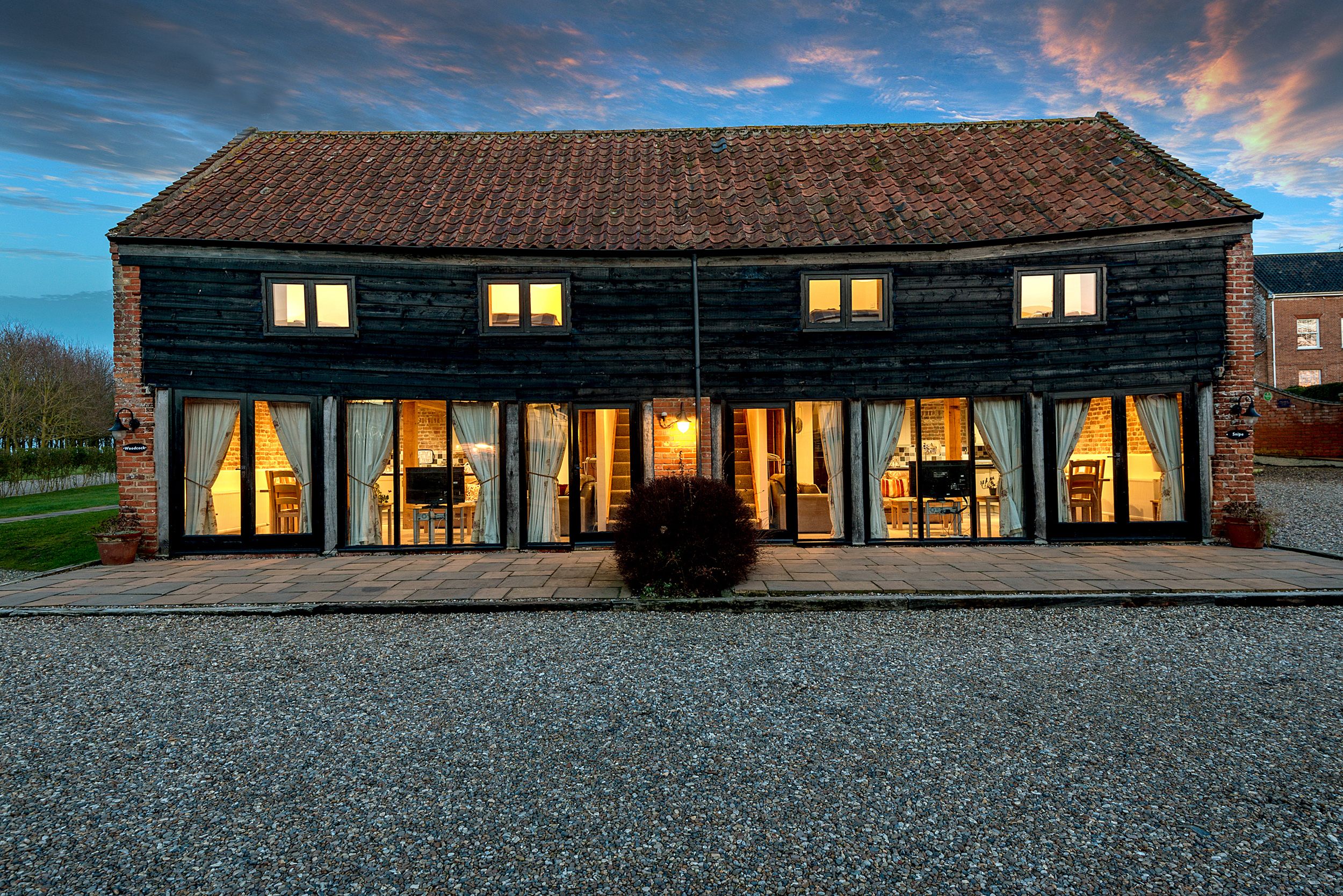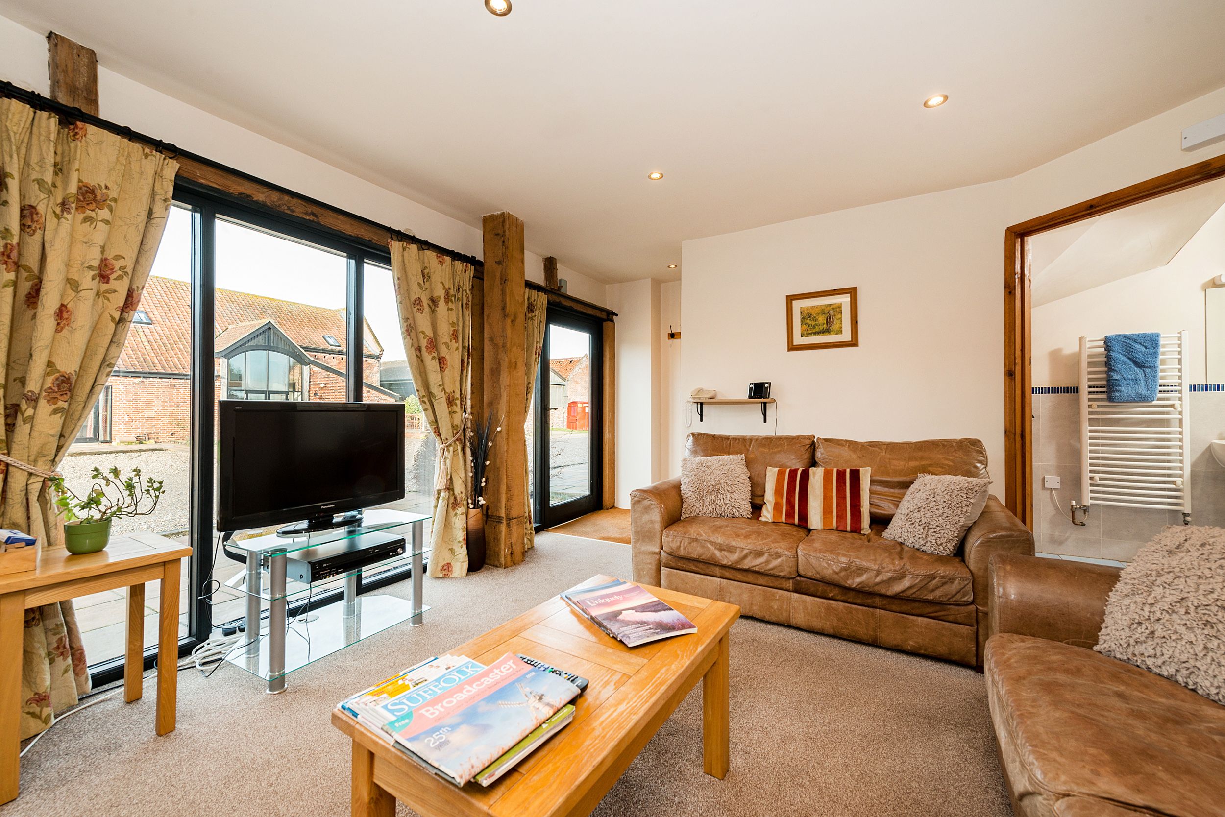 Three bedrooms: 1 x king-size with en-suite with walk-in shower, basin and WC, 1 x king (Zip/link - Twin upon request), 1 x twin. Shower room with shower, basin and WC. Bathroom with bath, shower, basin and WC. Kitchen/sitting/dining room. Communal games room, gym, soft play and hot tub. Farm shop on site. Gas heating. Electric oven, gas hob, microwave, fridge, freezer, dishwasher, washing machine, filter coffee machine. Smart TV, WiFi. Bed linen and towels inc. in rent. Travel cot and high chair available on request. Off-road parking. Garden with furniture, patio and lawn. Sorry no smoking. Shop 0.1 miles, pub 0.6 miles. Note: There is an EV charger on site, shared between the eight units. Note: Wheatacre Barns houses many fantastic facilities for the eight barns to share, these include a games room, fitness suite, soft play barn and hot tub.