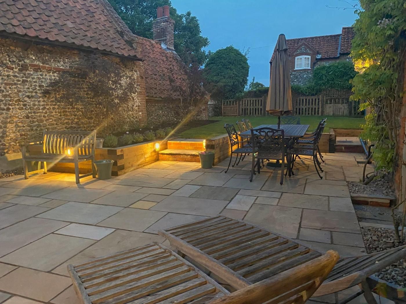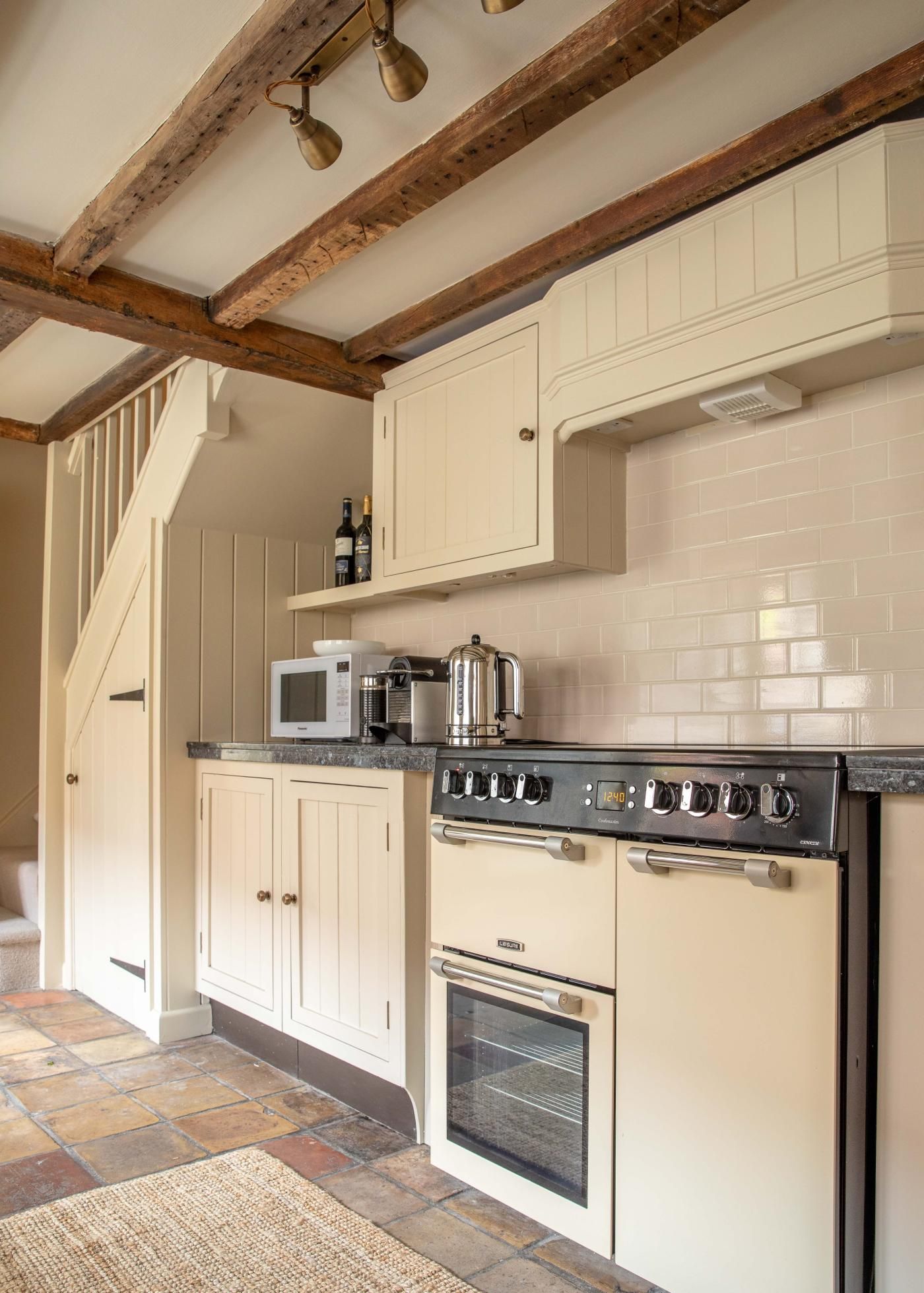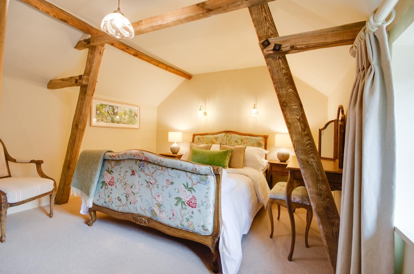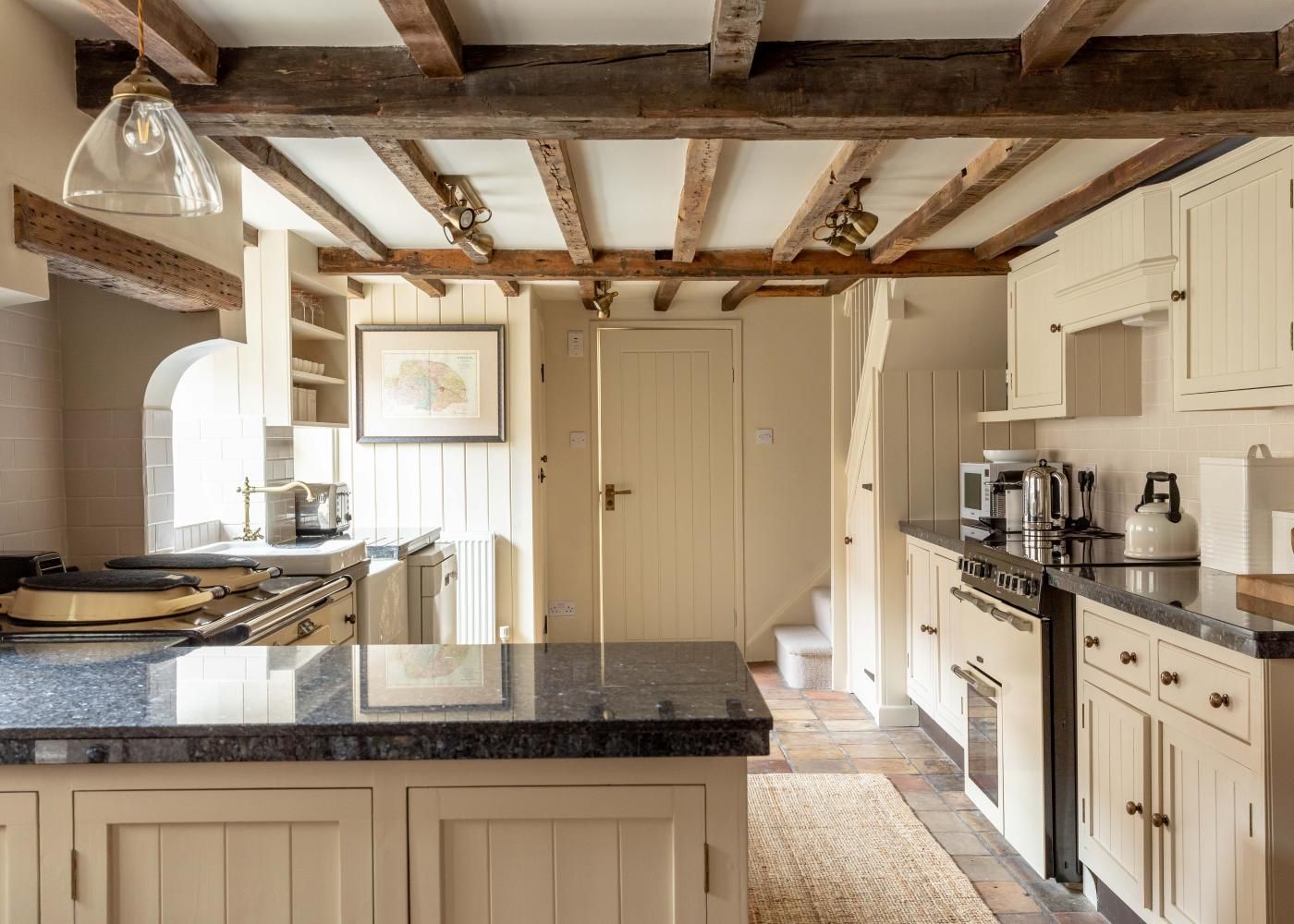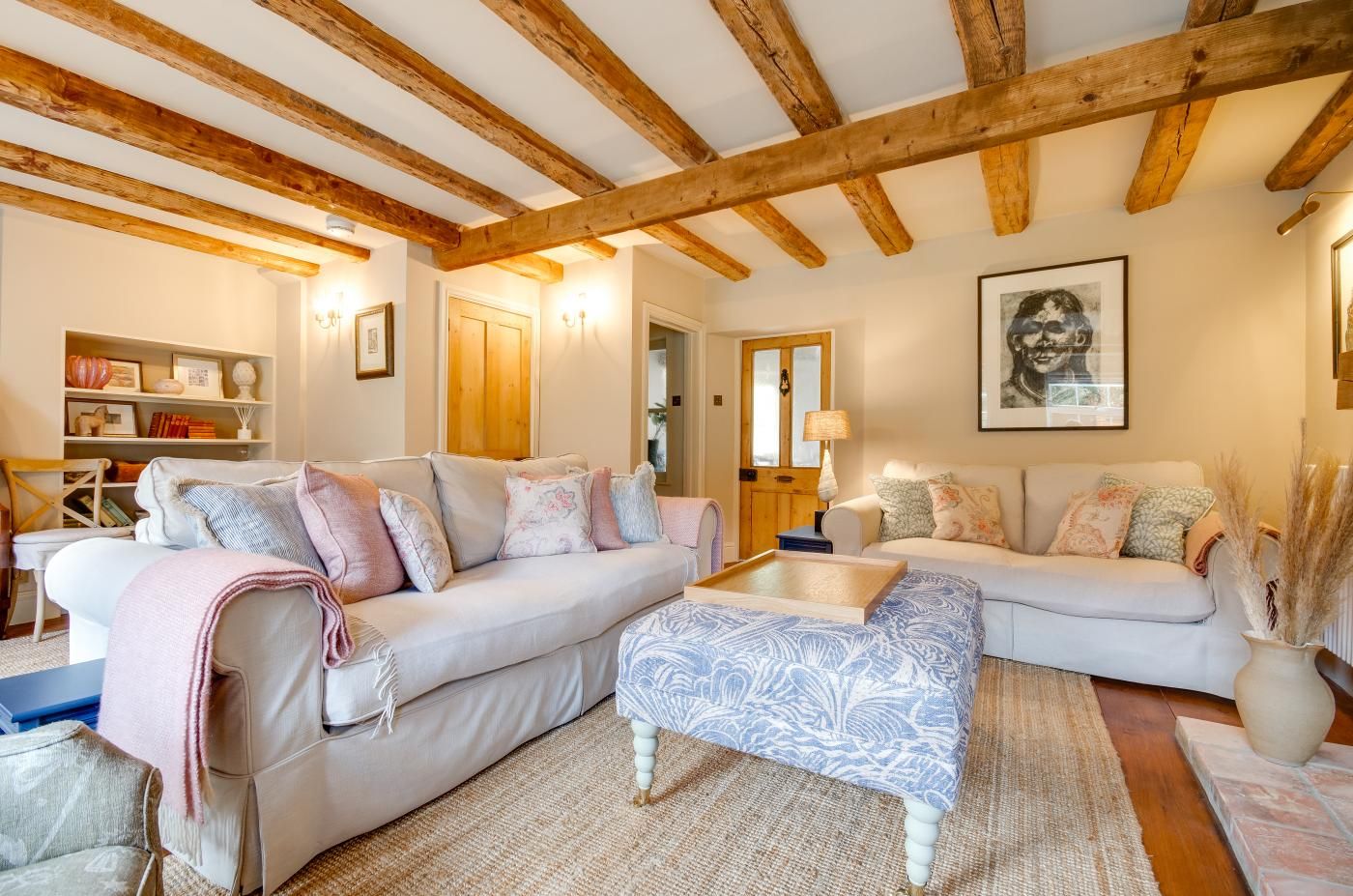 A clever design combines beautiful 19th century features such as exposed beams and flint with gorgeous antique furnishings and modern amenities.