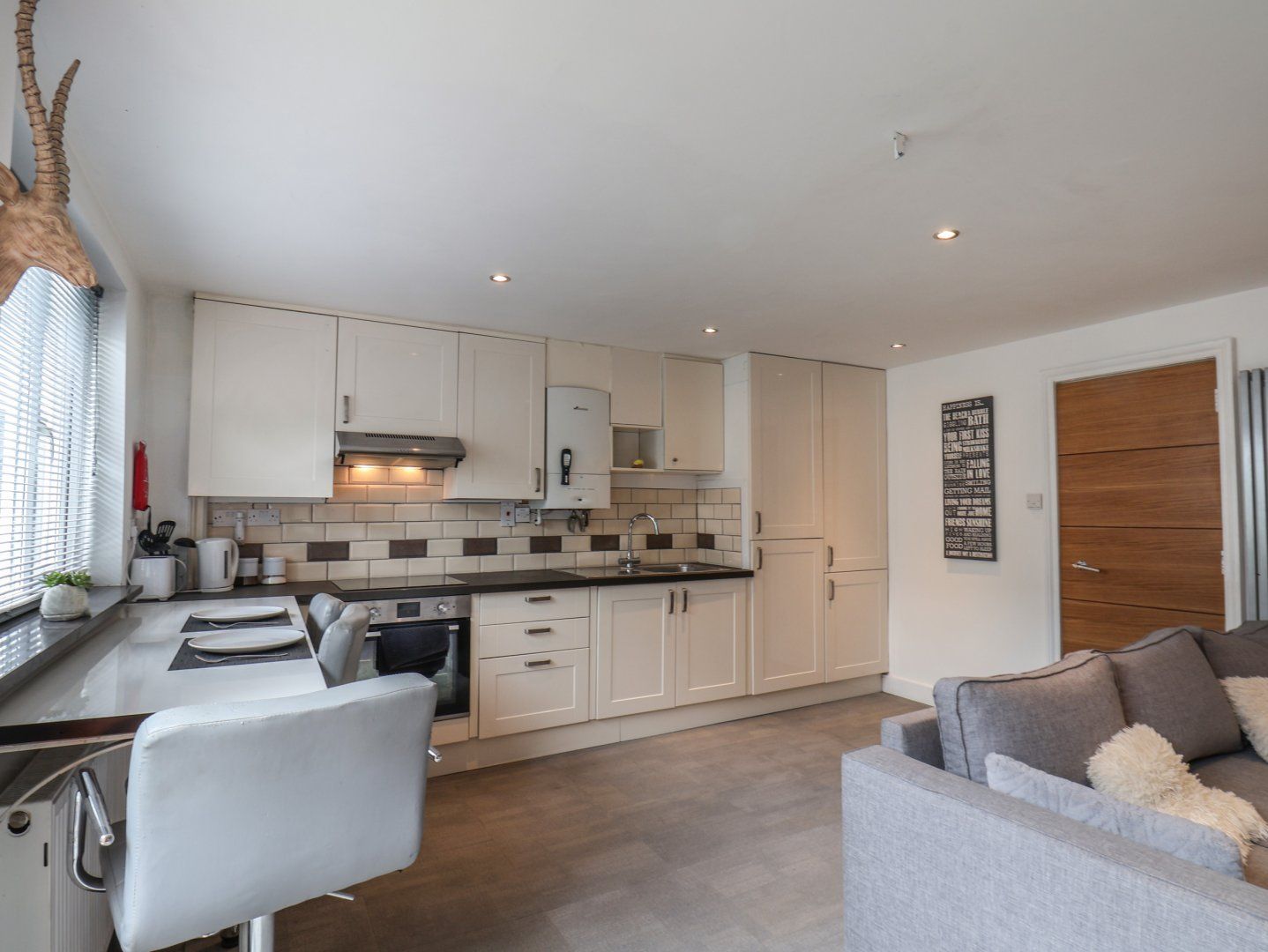 Two bedrooms: 1 x king-size, 1 x ground-floor bunk bed. Ground-floor shower room with walk-in shower, basin and WC. Open-plan living space with kitchen, dining area and sitting area