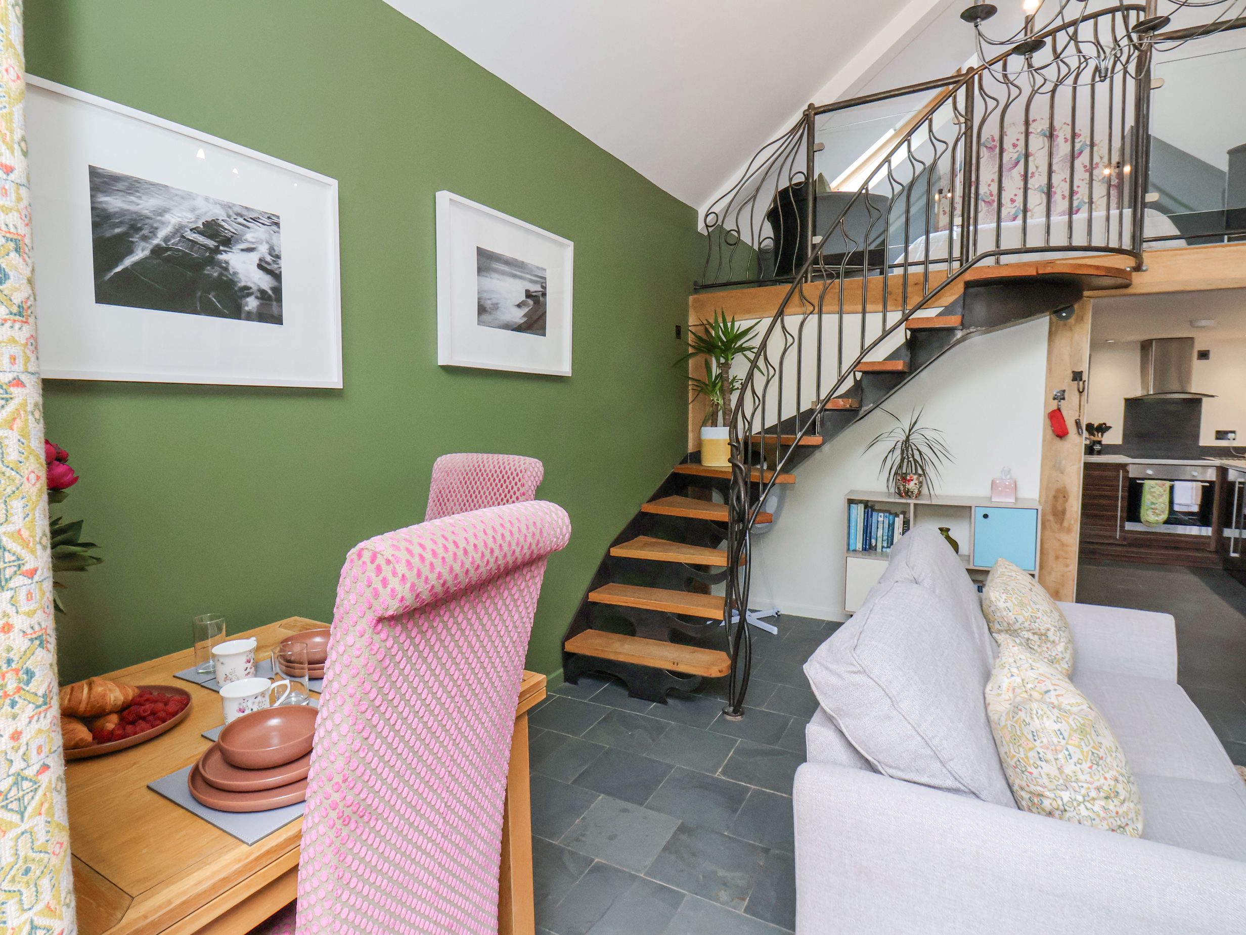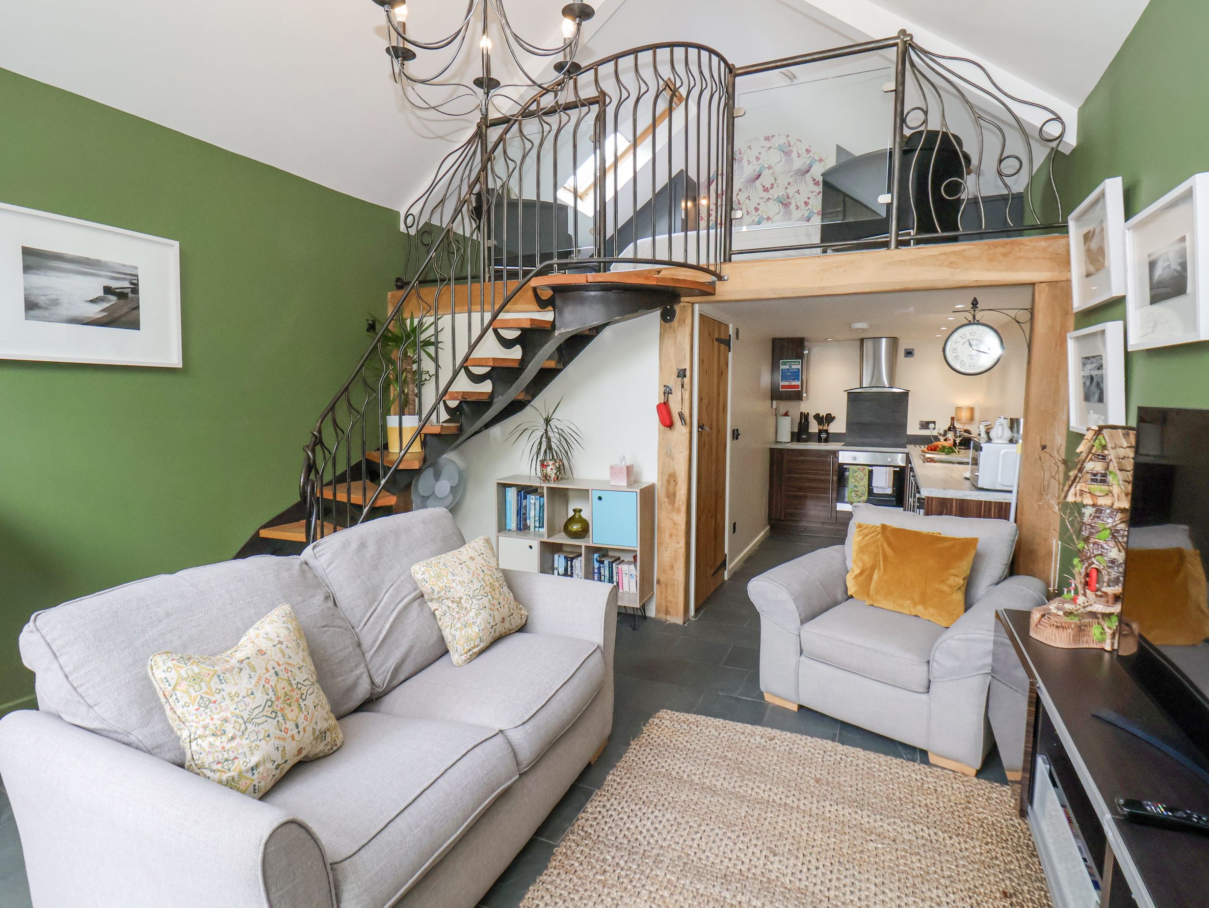 One double mezzanine bedroom. Ground-floor bathroom with free-standing bath, handheld shower, basin, heated towel rail, and WC. Open-plan living space with kitchen, dining area and sitting area