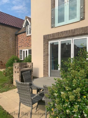 Off the lounge area are bifold doors opening onto a private furnished patio, surrounded by large, shared garden and landscaped grounds.