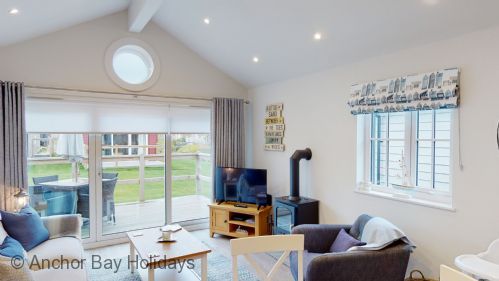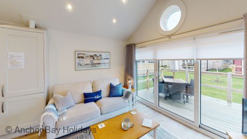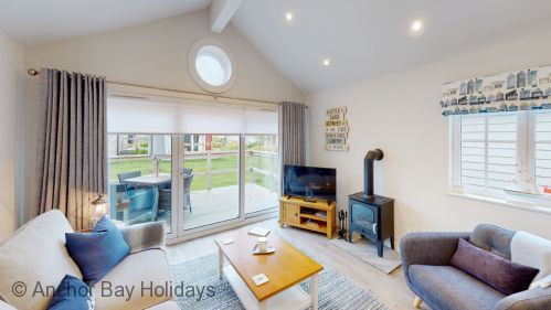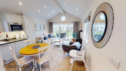 To the right is the open-plan kitchen / dining / lounge space with lovely comfy seating for 4, SMART TV and Nespresso coffee machine. Exit through the large sliding doors to the deck with seating for 4, ideal for alfresco dining or sitting out whilst the children play outside.