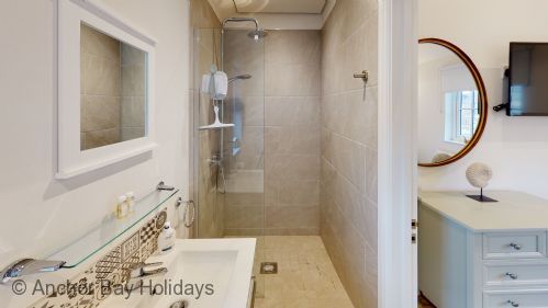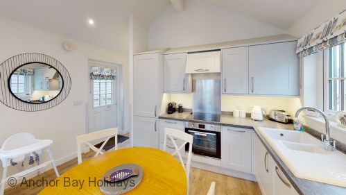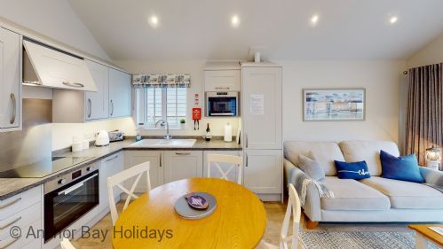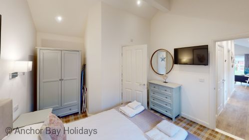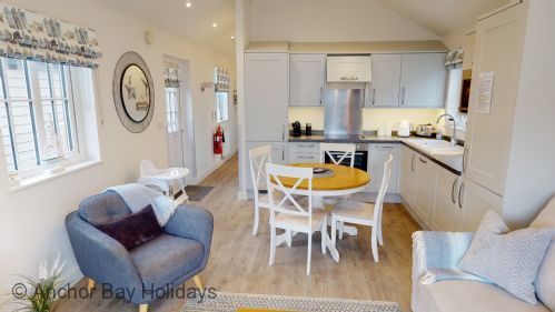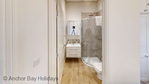 Enter Bay-Breeze through the step free door into the hallway with storage for coats and other essentials. To your left are the master bedroom with king size bed and ensuite shower (wet) room, and the second bedroom with two single beds. These can be pushed together to make a king should you wish this. (two single duvets etc provided). There is also another shower room with jack-and-jill doors.