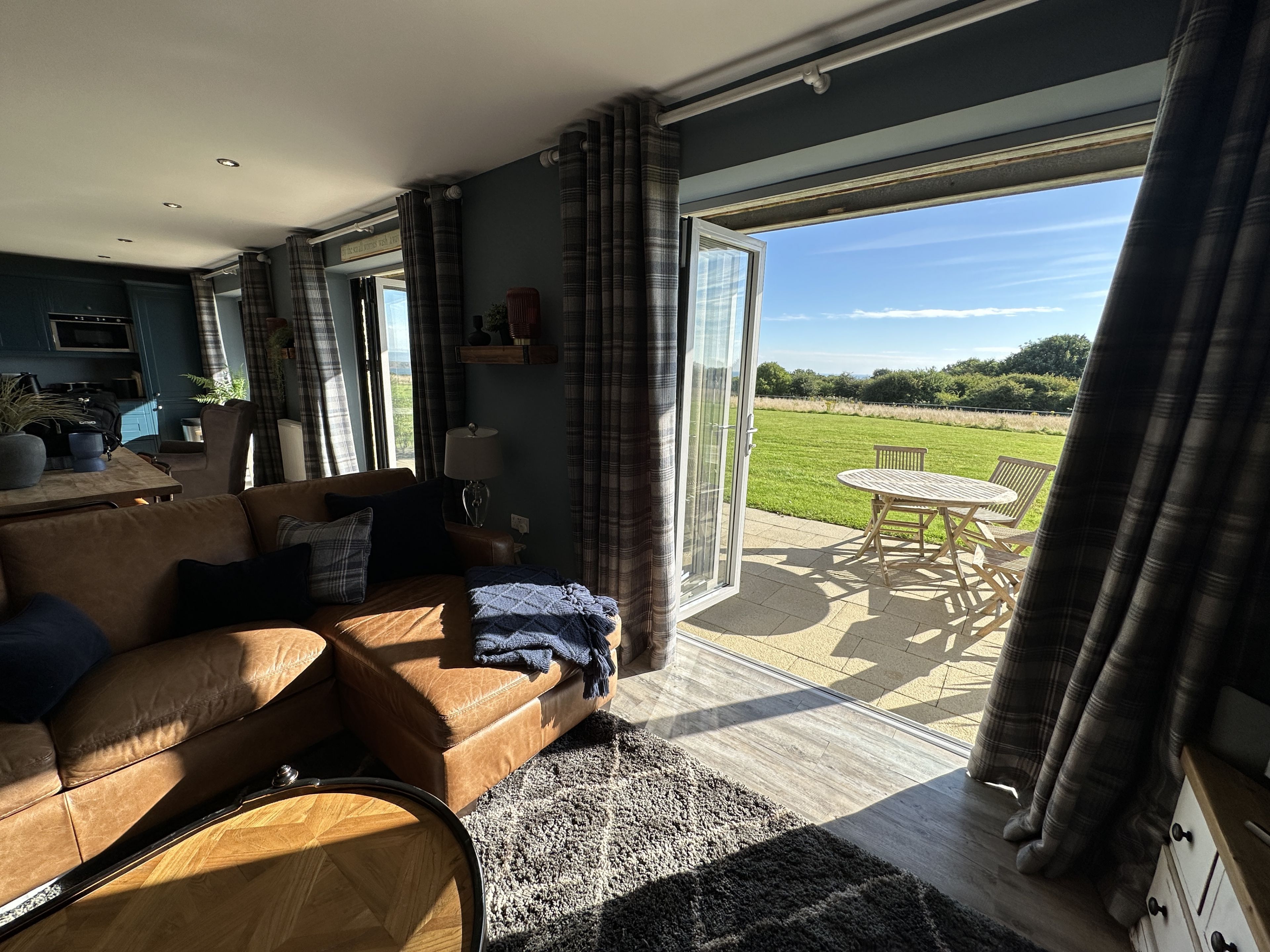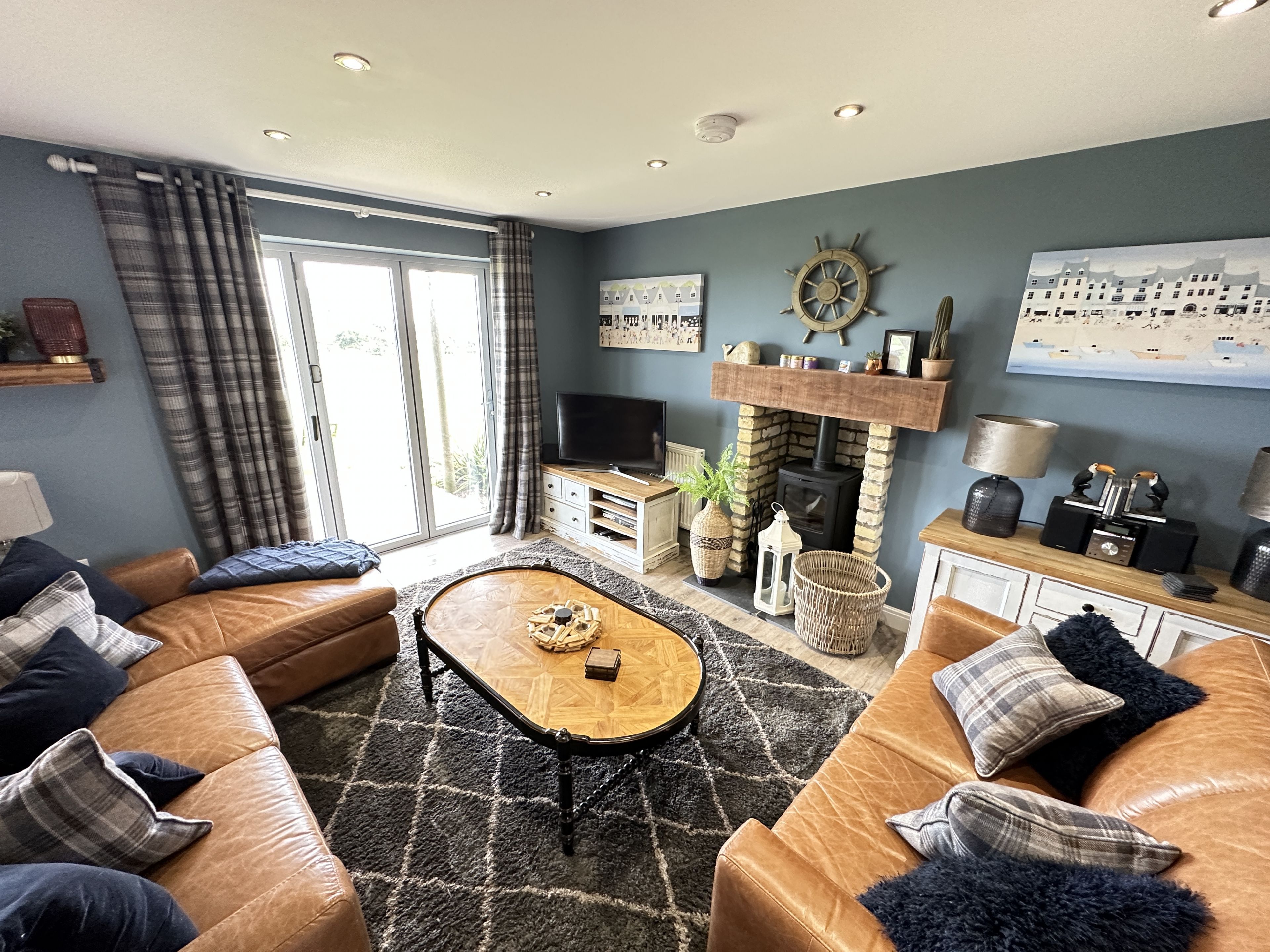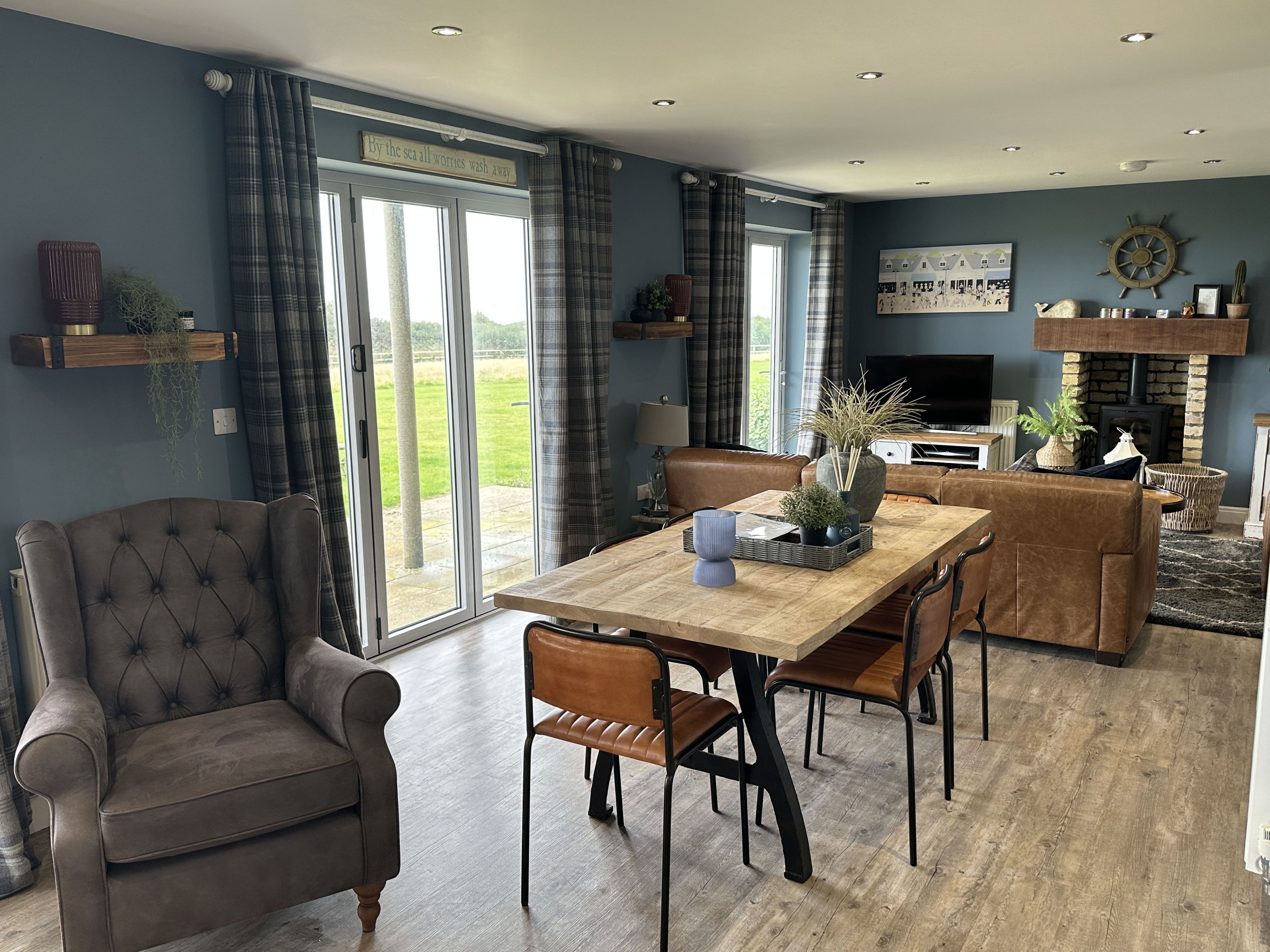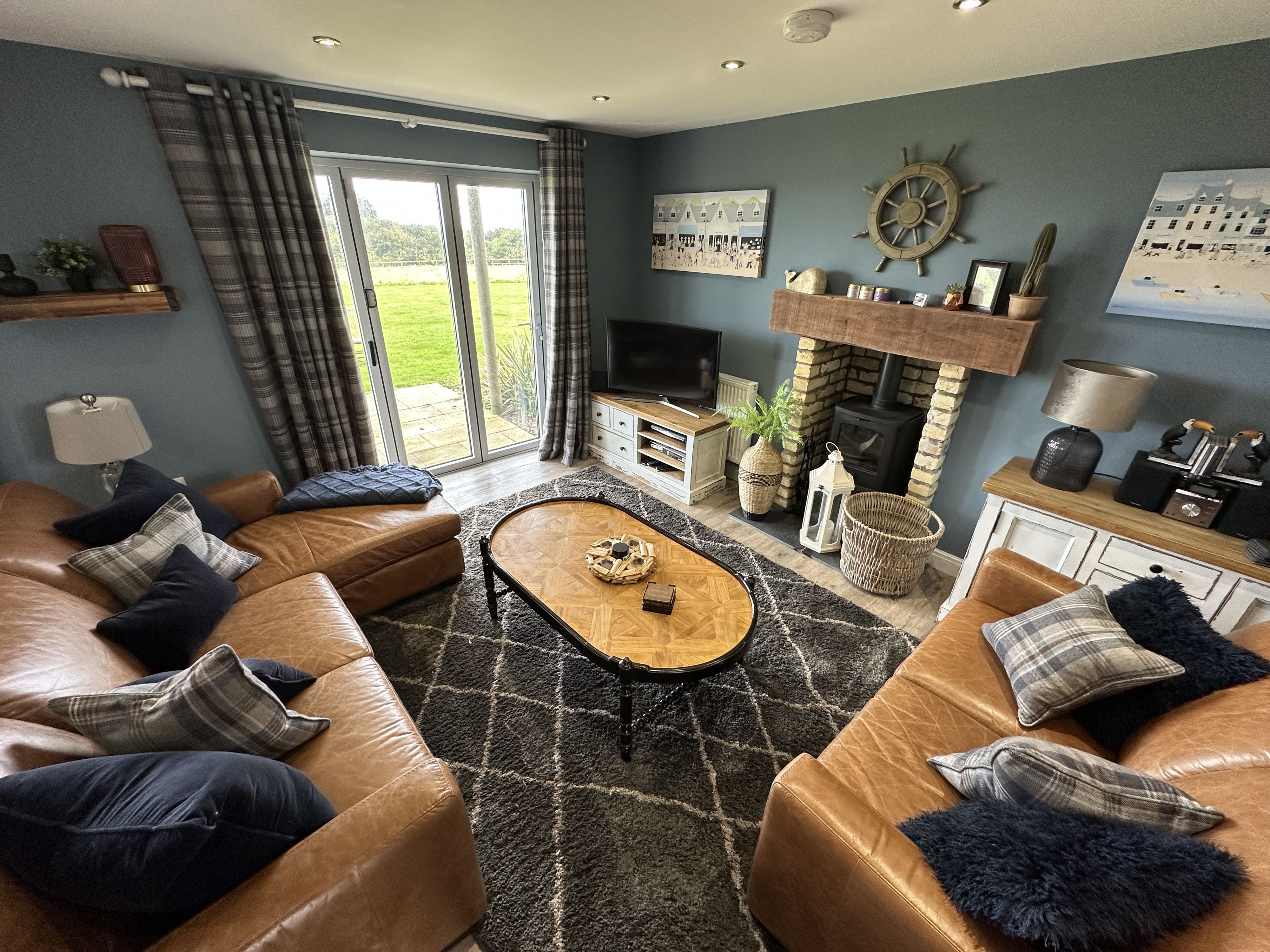 Across the diner, there is a comfortable lounge with luxury sofas, seating and large SKT TV (with sports included). There is a lovely log burner available in the lounge area and this is available to use November to March - this is not available in April to October due to the excessive heat generated and the bi-fold doors. (guests wanting to use this must supply own logs)