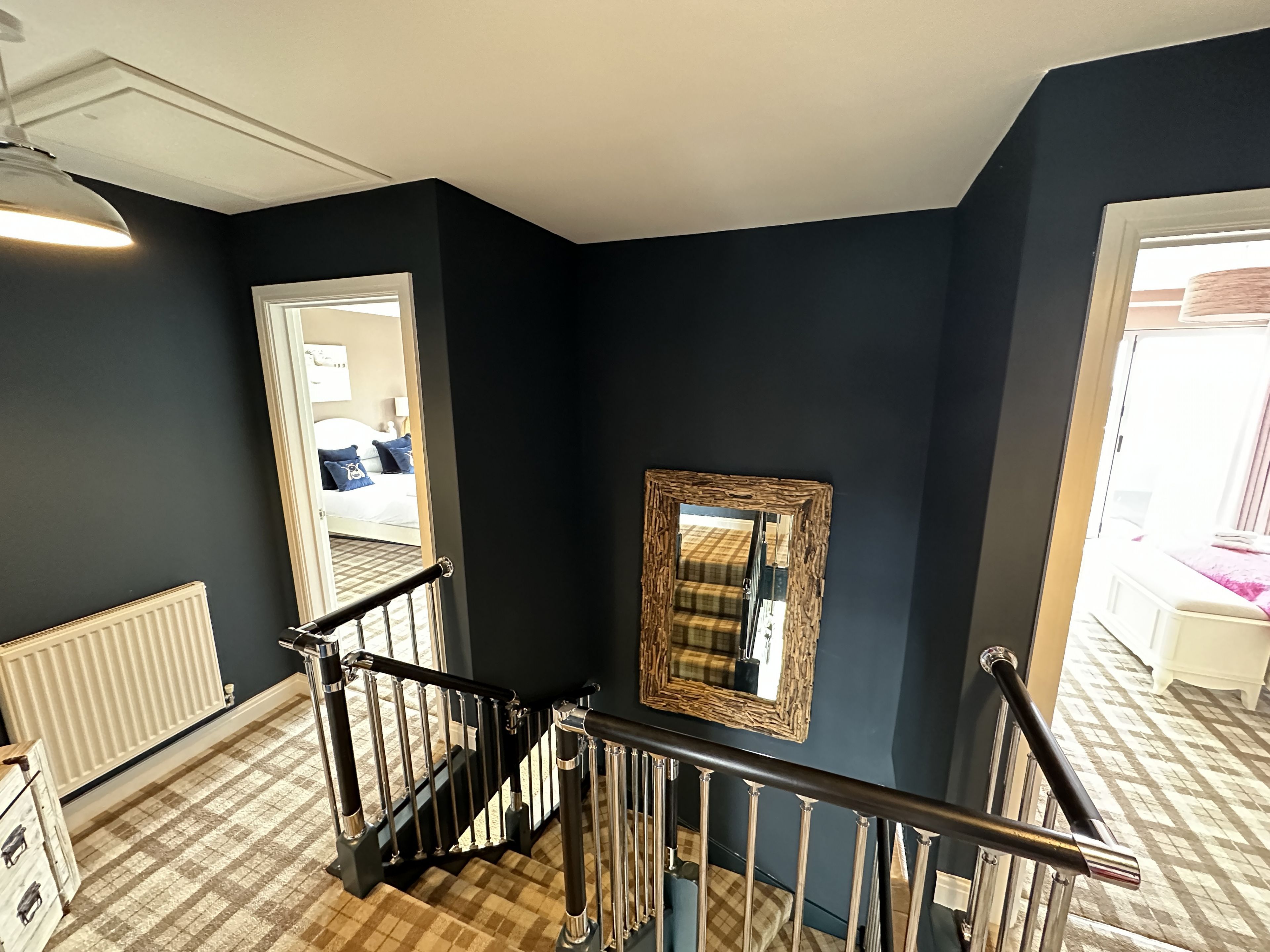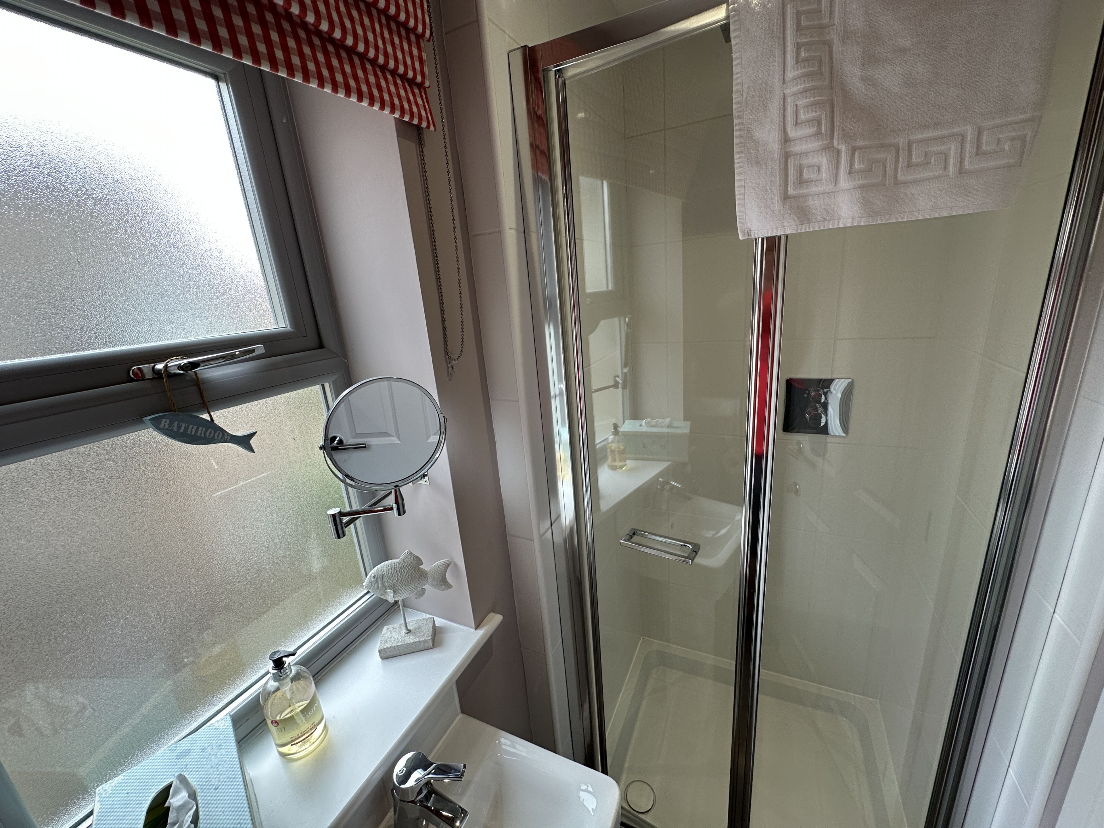 Upstairs there’s a large galleried landing, with 2 stunning bedrooms sharing a balcony (with seaview) each with their own en-suite shower room. There is also a large twin room with its own en-suite shower room.