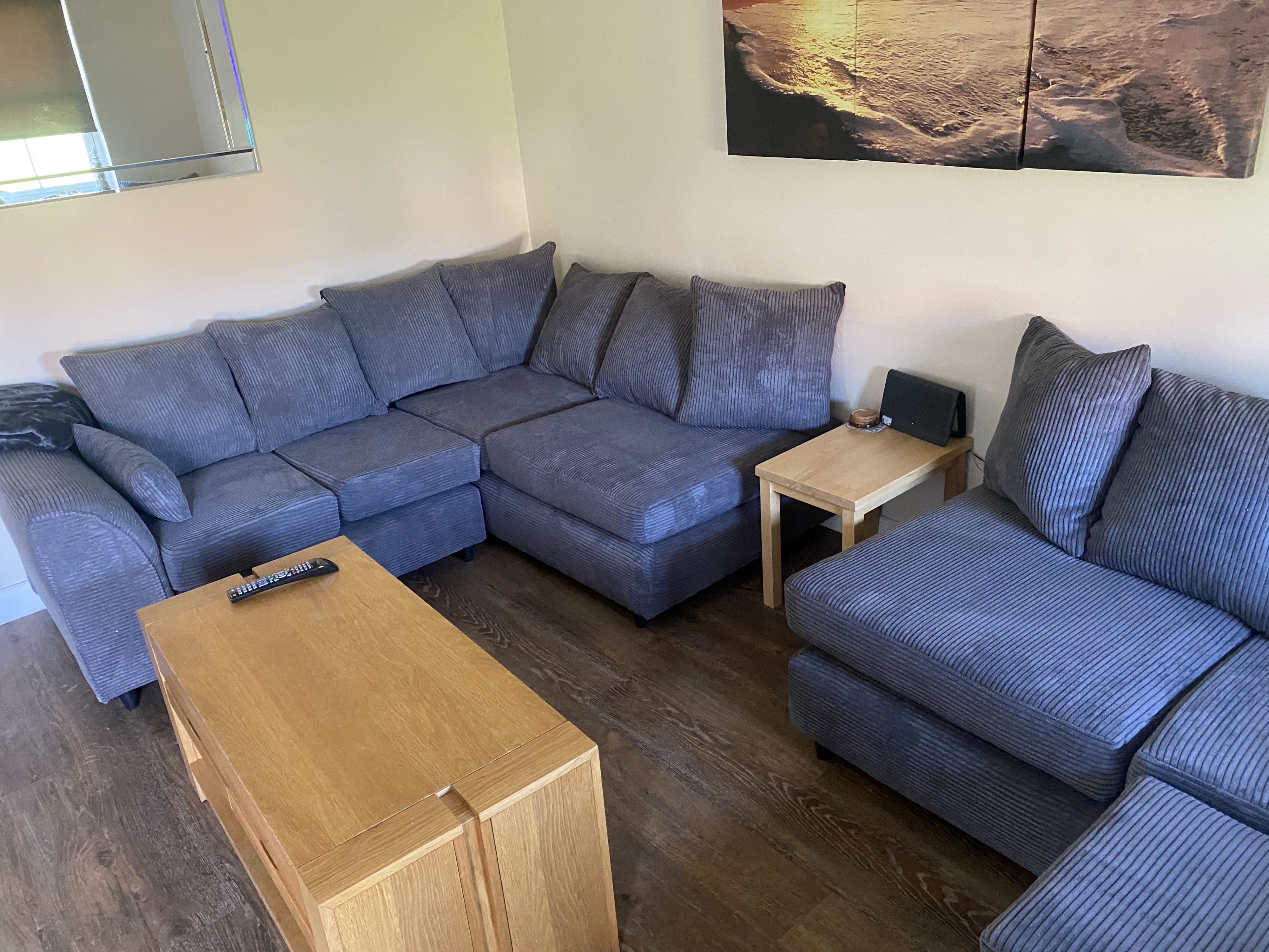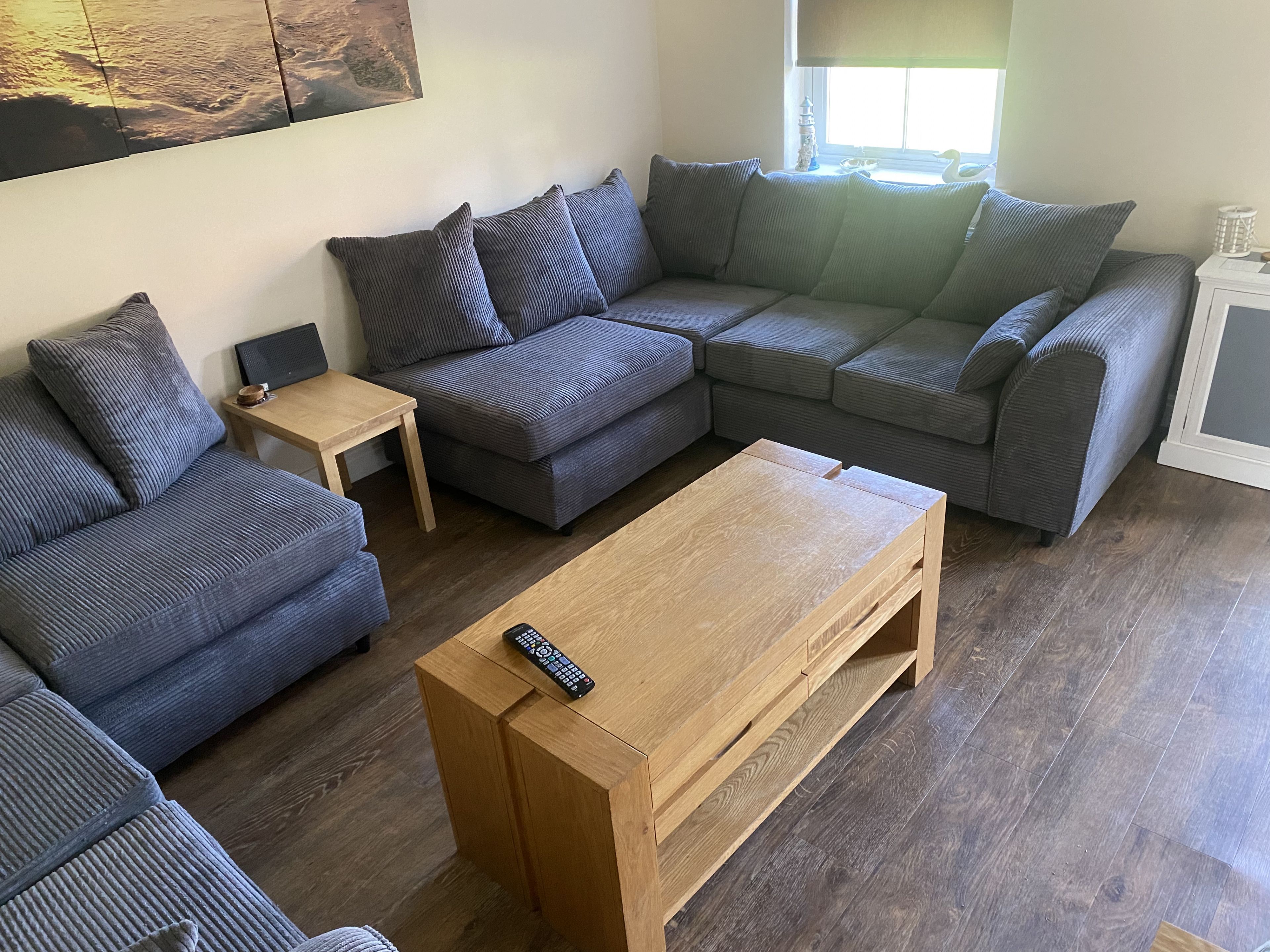 The other door leads to a large kitchen and lounge area with all the appliances you’ll expect for a self-catering break including a large fridge / freezer and spacious lounge / seating area with stunning large corner sofas ideal for movie nights.
