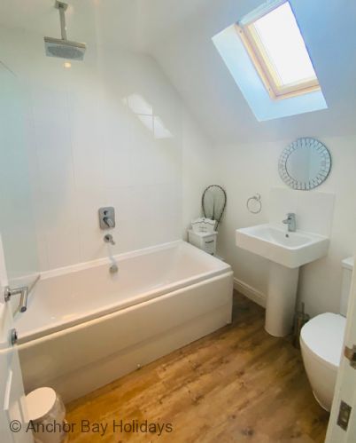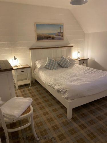 Upstairs the master bedroom includes a king-size bed, TV and luxury En-suite with rainfall shower, the second bedroom has full-size bunks and full size single bed. Family bathroom with bath and overhead rainfall shower.