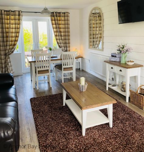 Enter through the step free doorway into a generously proportioned hallway with WC / cloakroom. Walk into the 'L' shaped open plan living, dining and kitchen area with wood-burner stove, sofas for 5 and SMART TV, dining table for 5 and modern fully equipped kitchen including a dishwasher, washer-dryer and microwave. Off the dining area French doors lead onto a private furnished patio, ideal for outside relaxing with seating for 4 with lawned area.