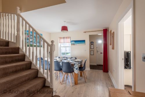 Off the dining room is a WC and ground floor twin bedroom - ideal for multi generational family holidays. The other door leads to a large kitchen and lounge area with all the appliances you’ll expect for a self-catering break including a large fridge / freezer and spacious lounge / seating area with an additional fridge for all your drinks!