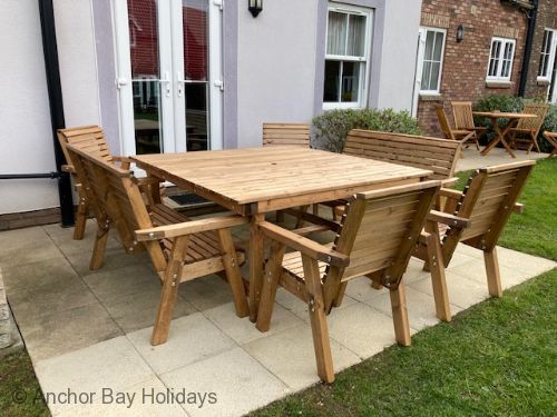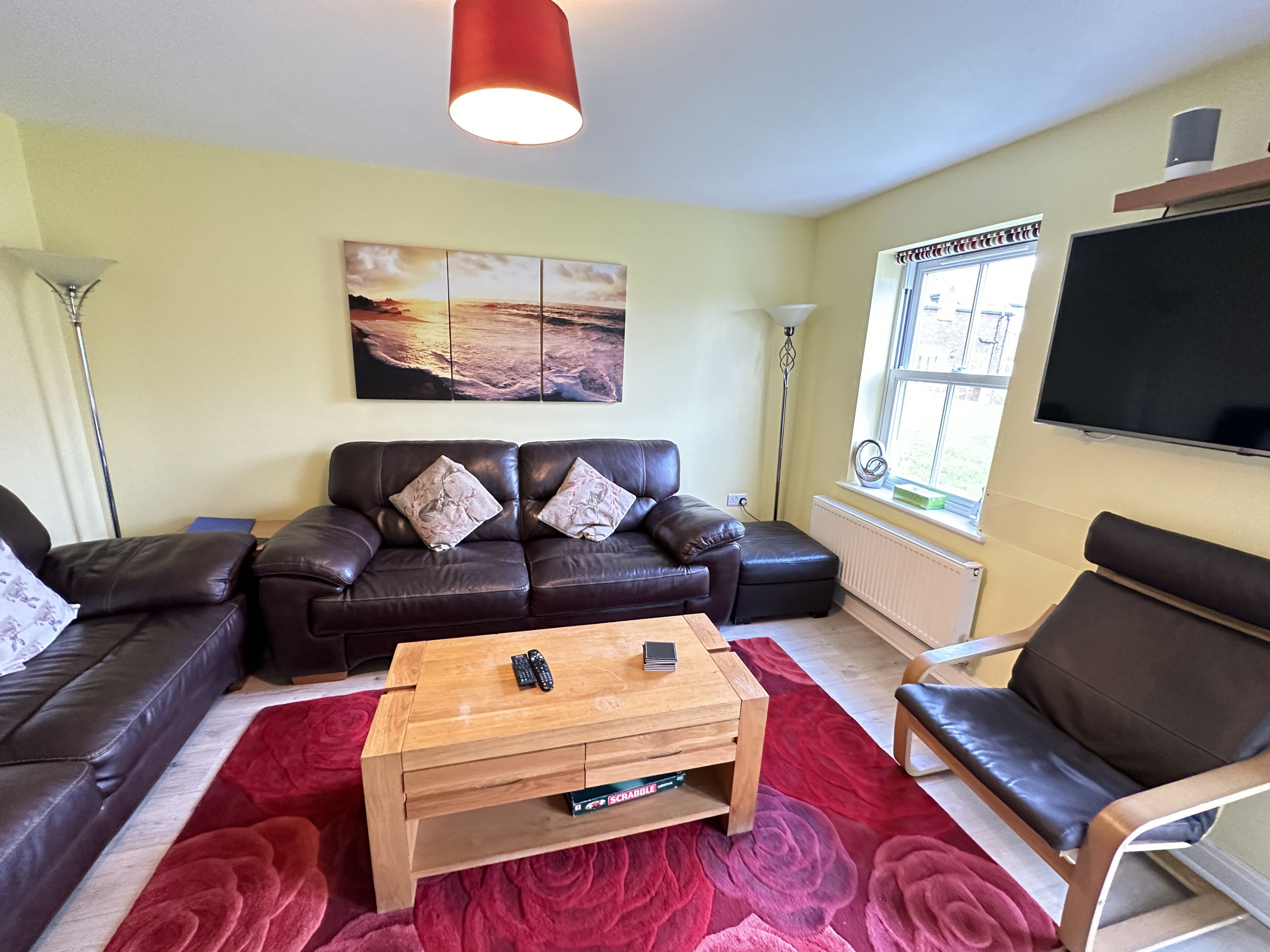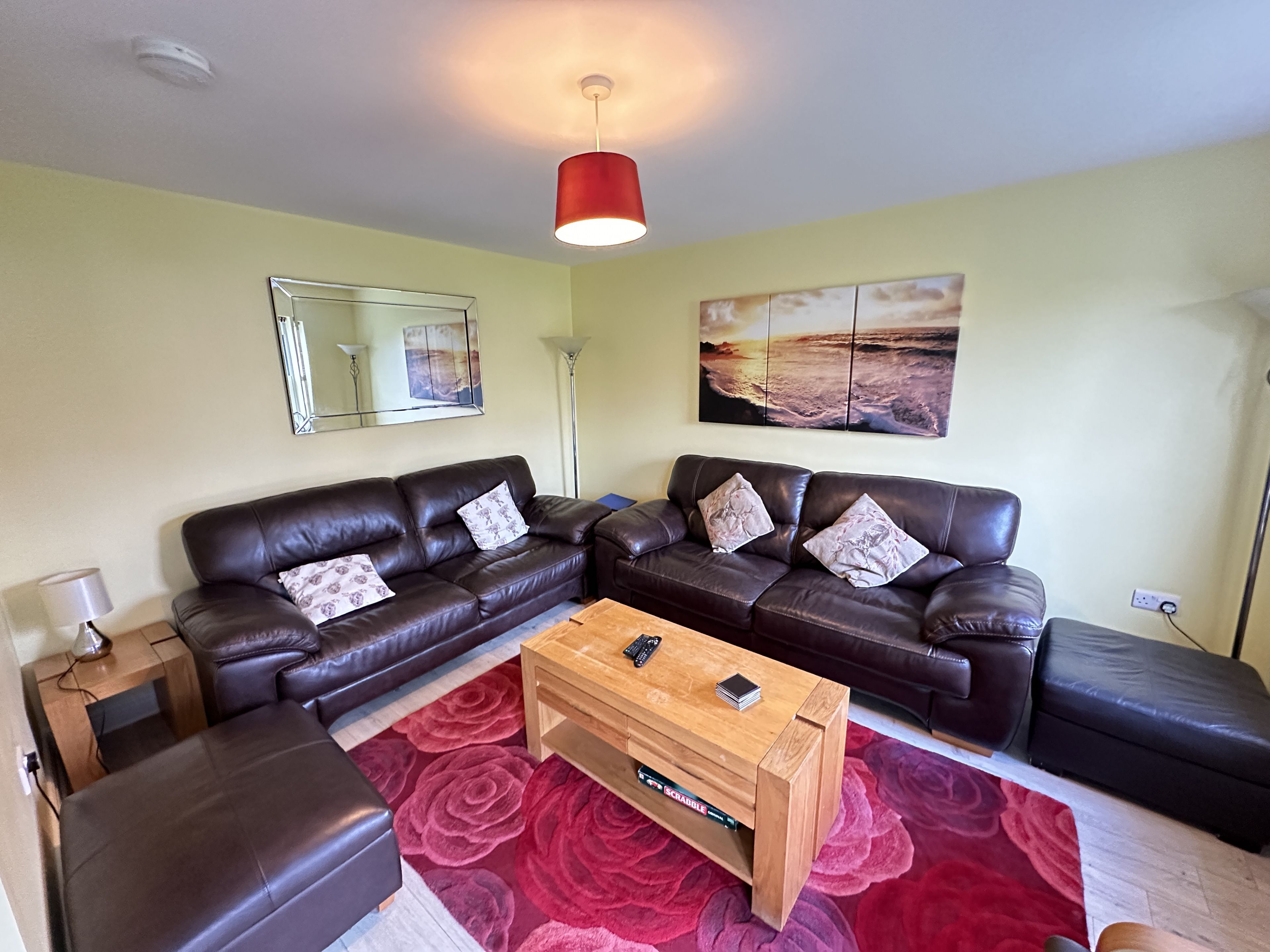 The large kitchen / lounge to the rear of the property has French doors leading to a patio with seating for 8. The lounge area has lovely leather sofas and SMART TV.