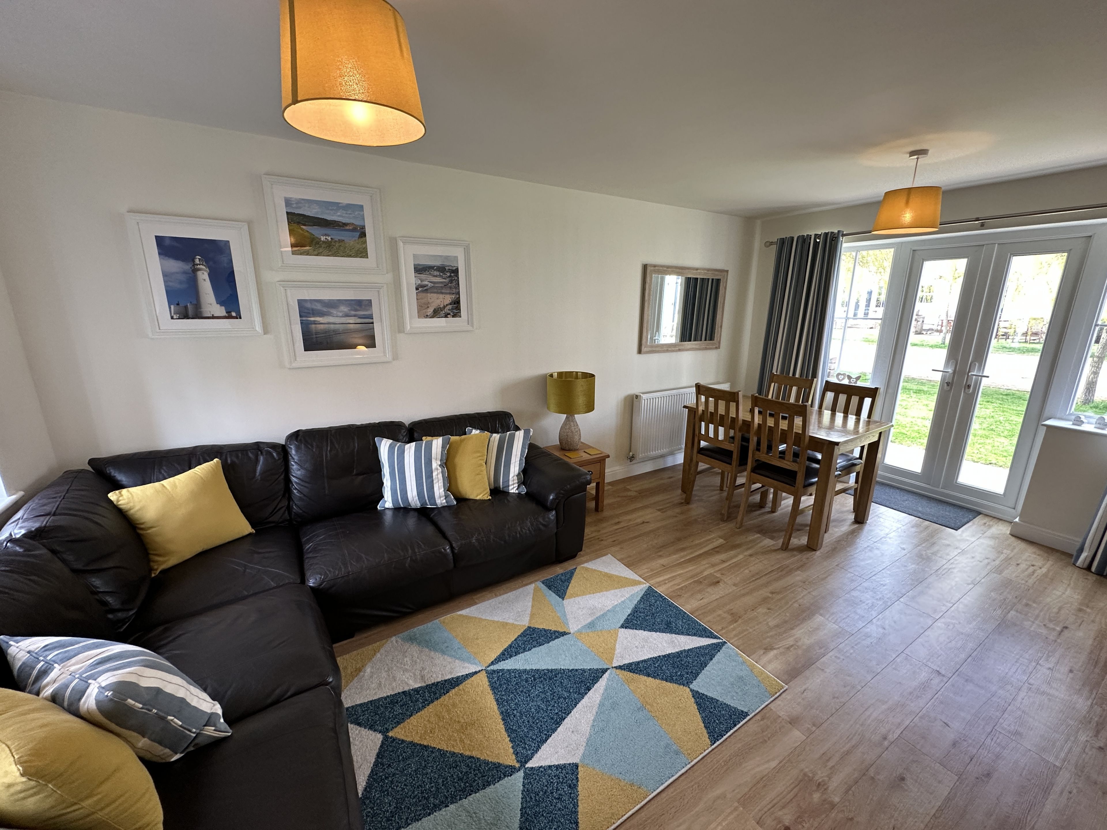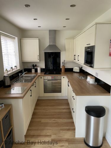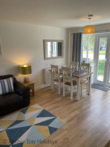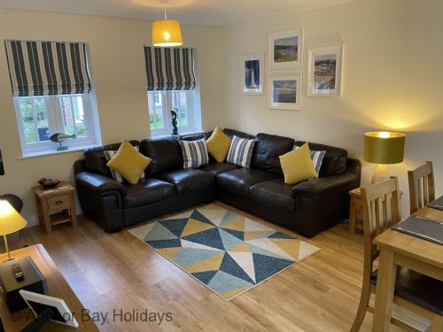 Walk through into the large open plan L shaped lounge with corner sofa, SMART TV, dining room (sits 4) and fully fitted kitchen including dishwasher, washing machine etc.