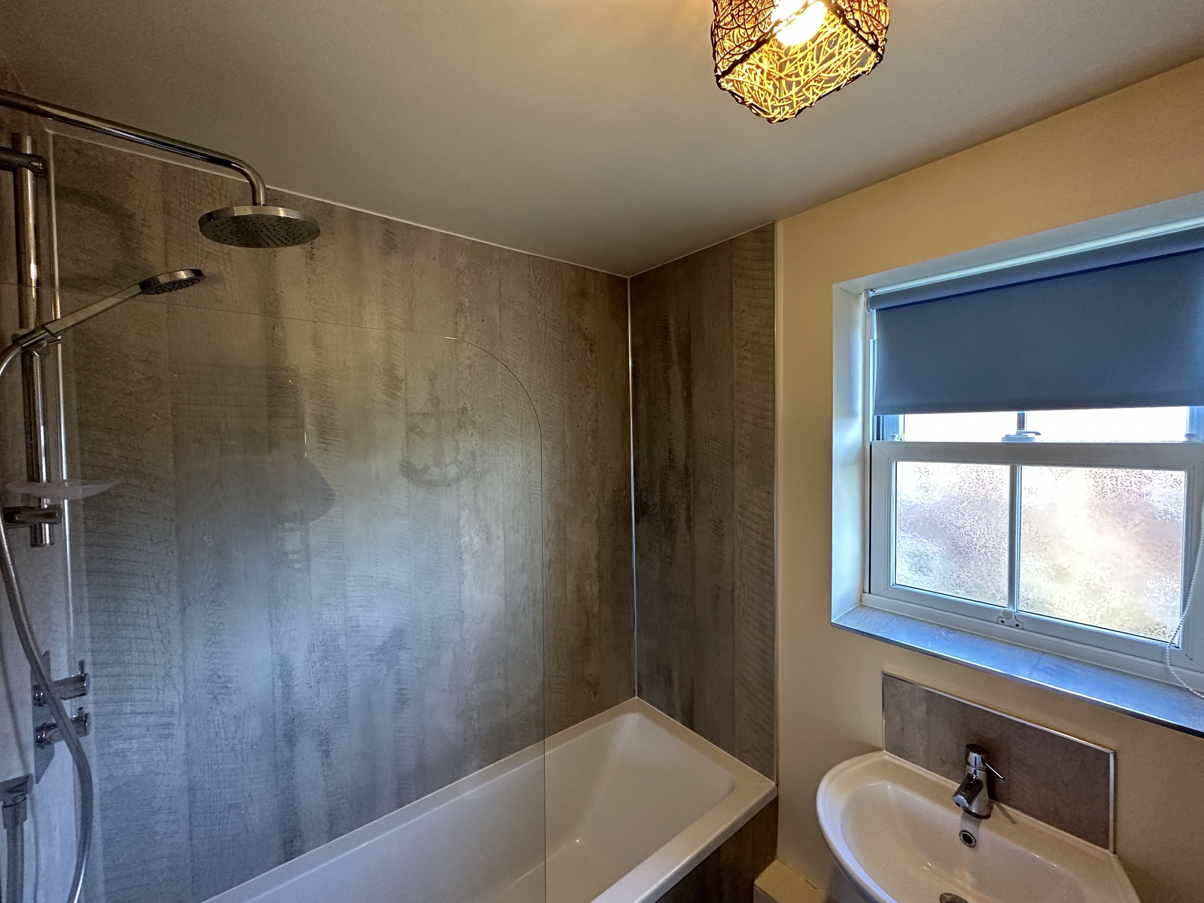 Off the hallway is a family bathroom (new in 2022) with shower over and a spacious bedroom with comfy double bed and lots of storage.