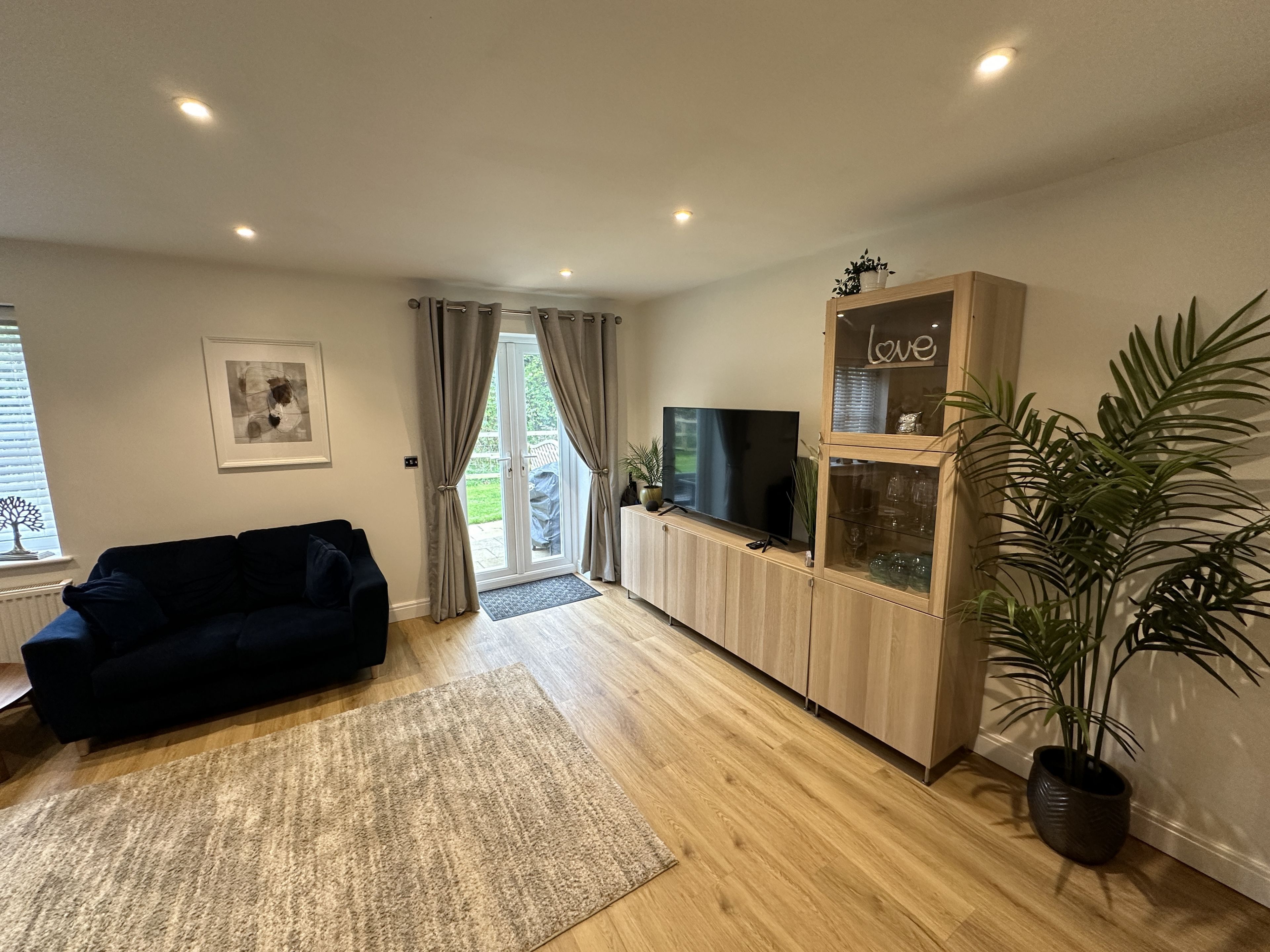 There is an excellent dining space in the kitchen, with extended dining table seating 6 with French doors to the patio, and 2 large comfortable sofas - ideal for relaxing in front of. The patio has lovely furniture and a gas BBQ for you to use. Across the hall there is a WC.