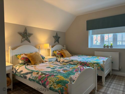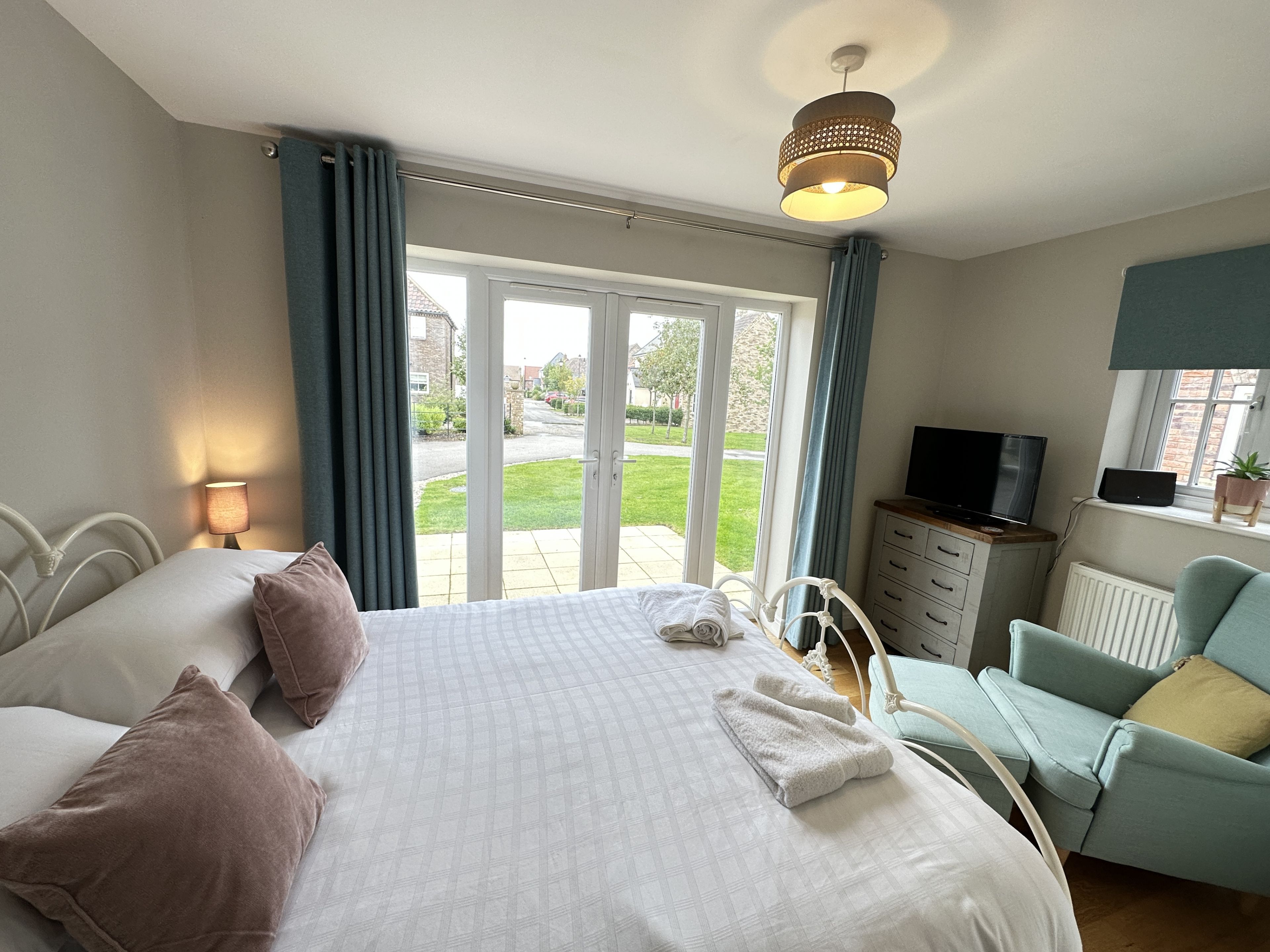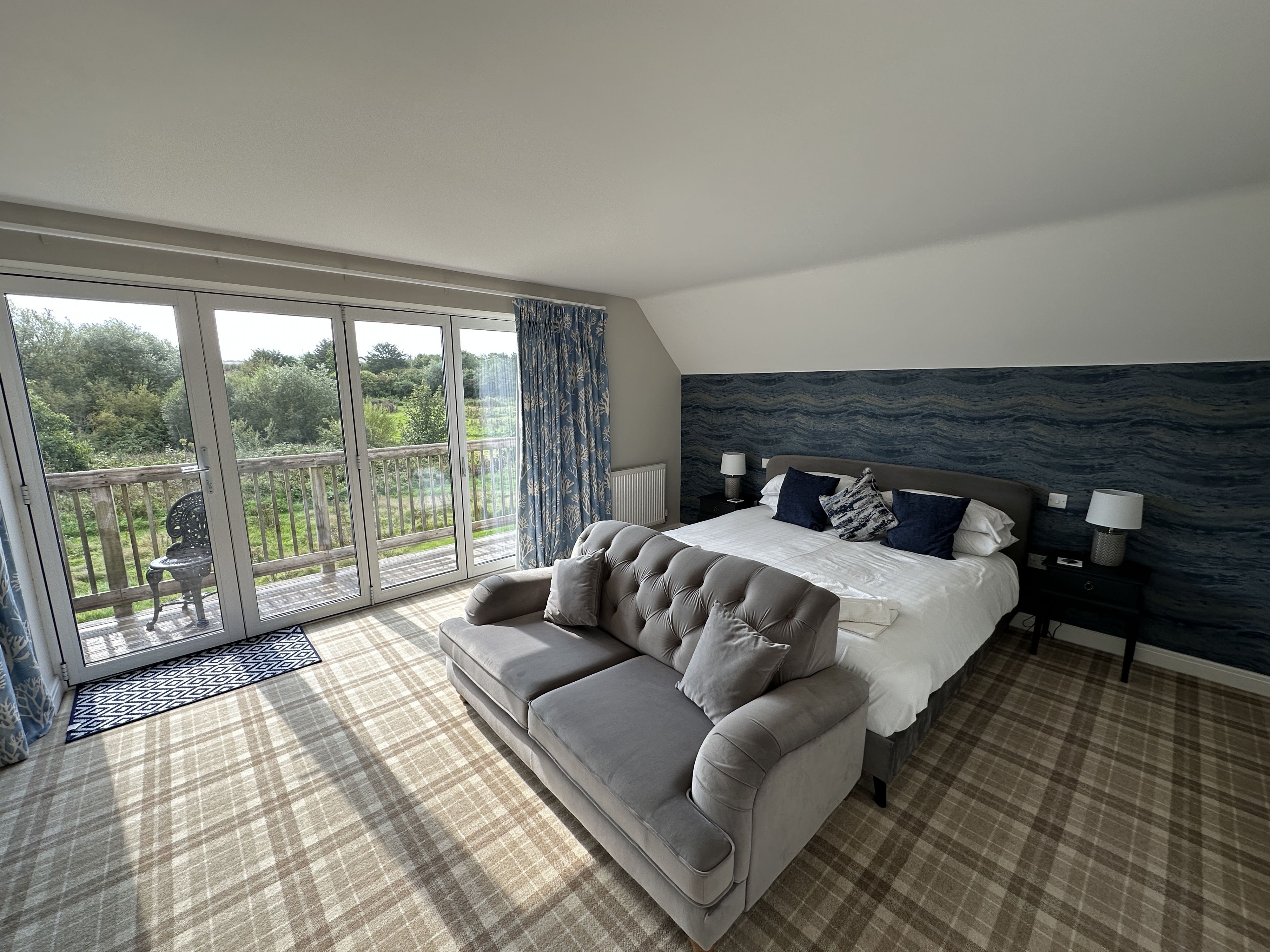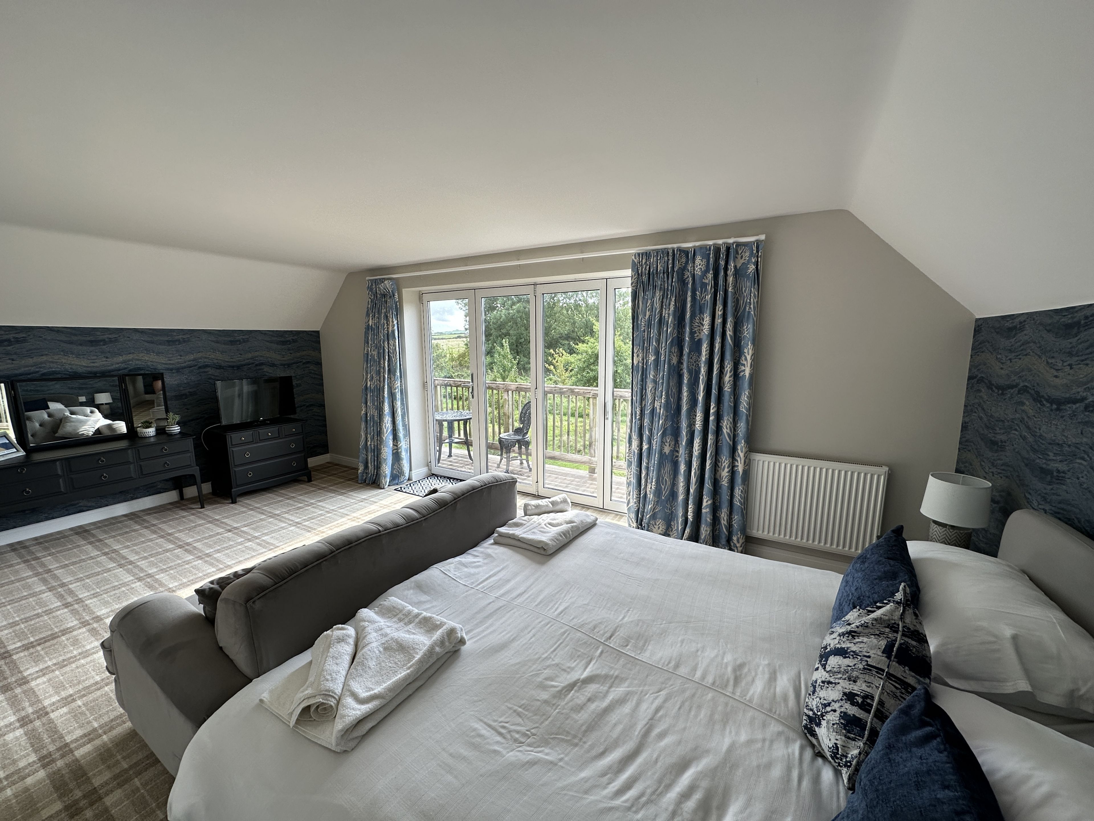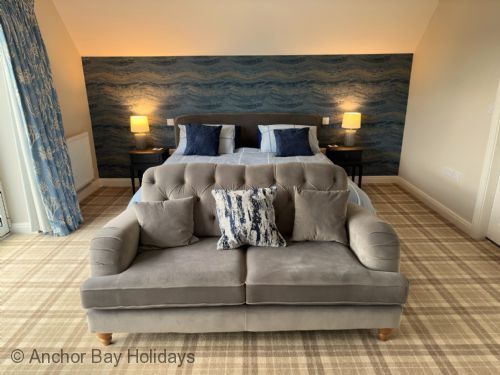 Upstairs there is the stunning main bedroom suite with a super-kingsize bed, with an ensuite shower room, seating area with bifold doors onto the balcony with views to The Meadows and beyond. There are 2 further bedrooms one as a king and one as a twin with single beds - these share a large family bathroom.