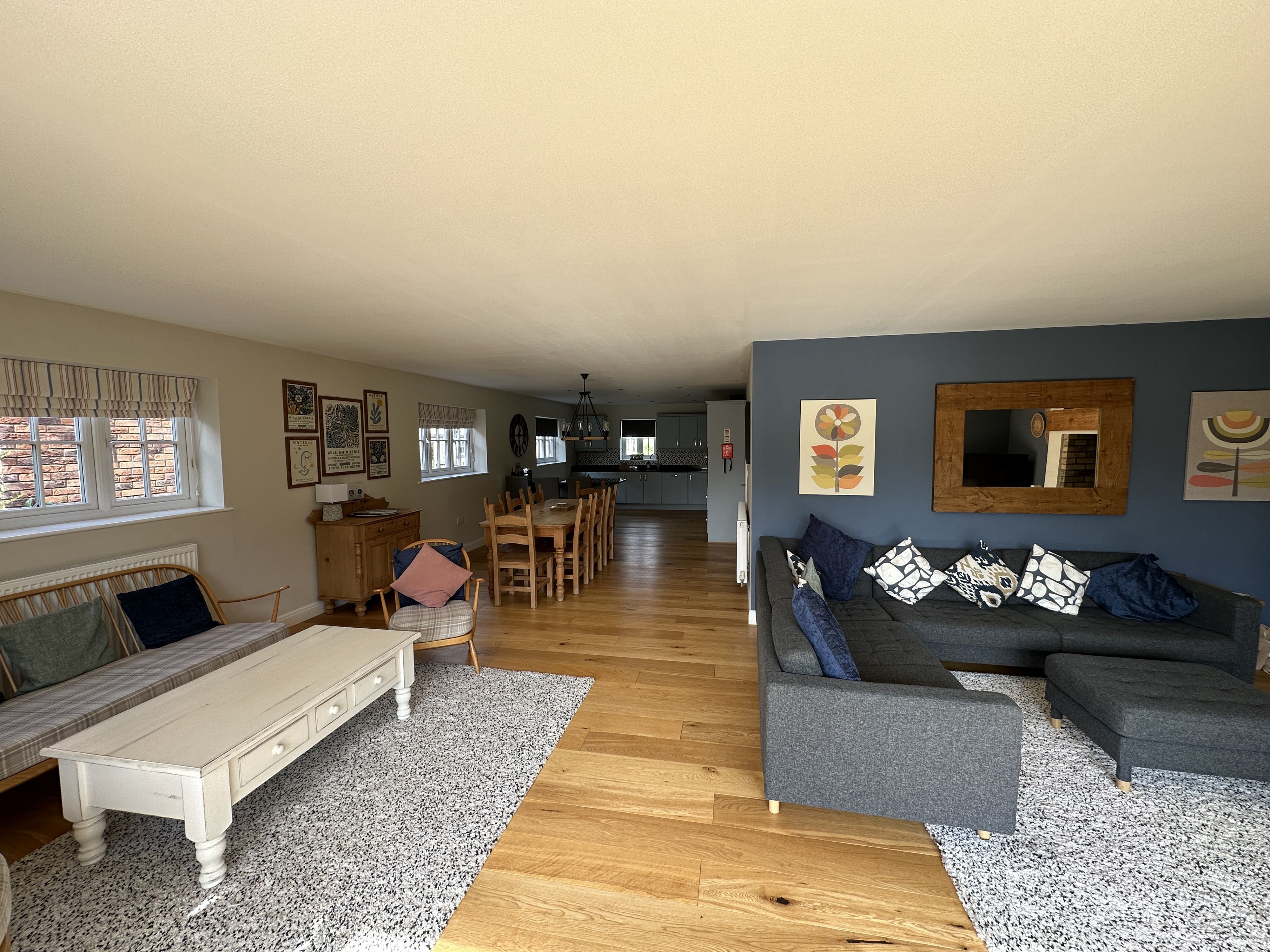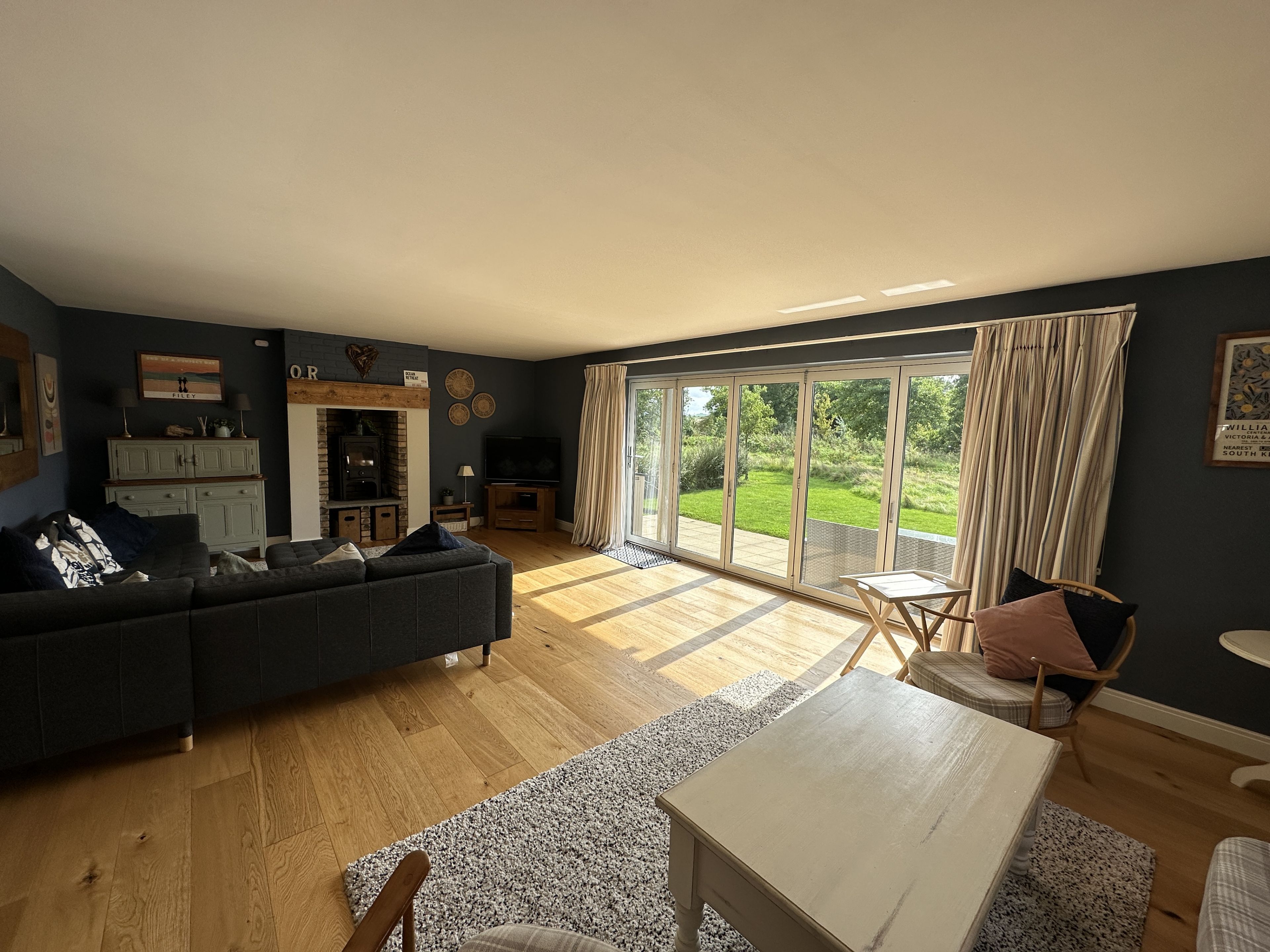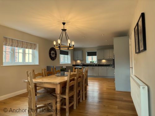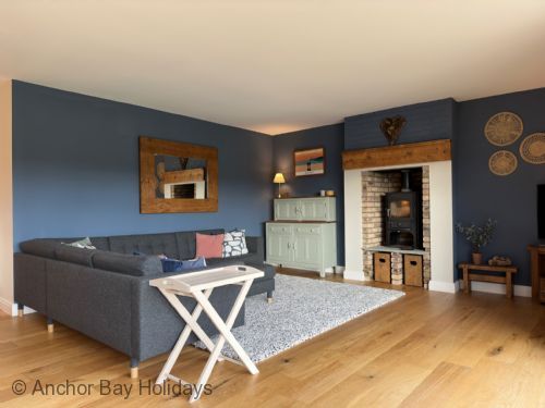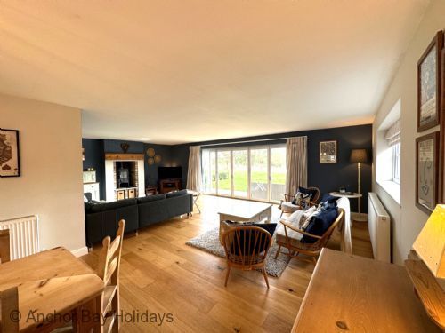 Off the kitchen is a dining area with plenty of room for 8 people which leads to the stunning lounge area with log burner, multiple large comfortable sofas and bifold doors onto the large patio with seating and amazing access to The Meadows edge.