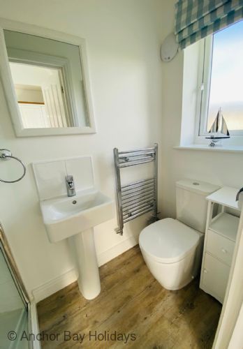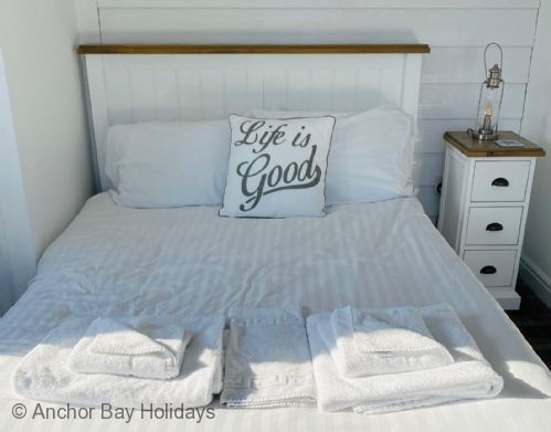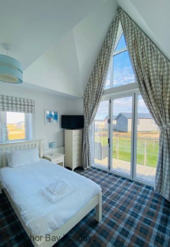 Upstairs there are two double bedrooms both with En-suite shower rooms. The master bedroom has a king-size bed and vaulted ceiling, the second bedroom with full-size bunks, full-size single bed and TV. Both bedrooms have large bi-fold doors leading onto the south facing full length balcony with seating to enjoy breakfast or to reflect on the days activities with a glass of wine.