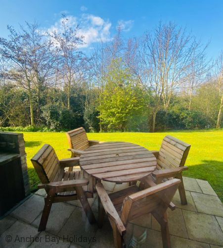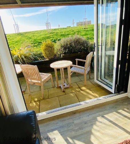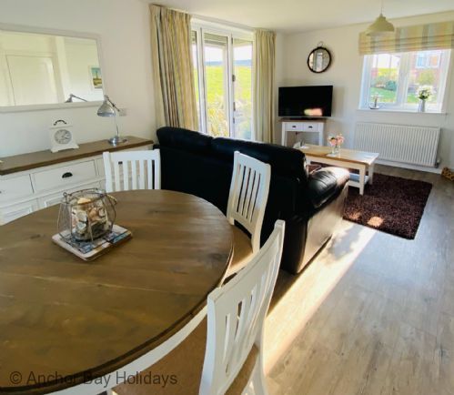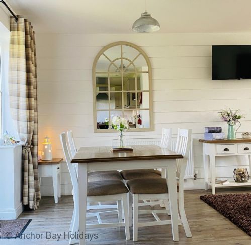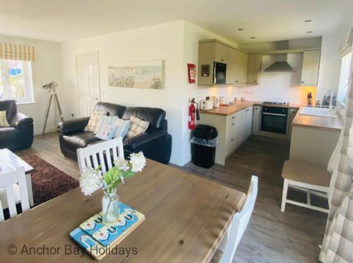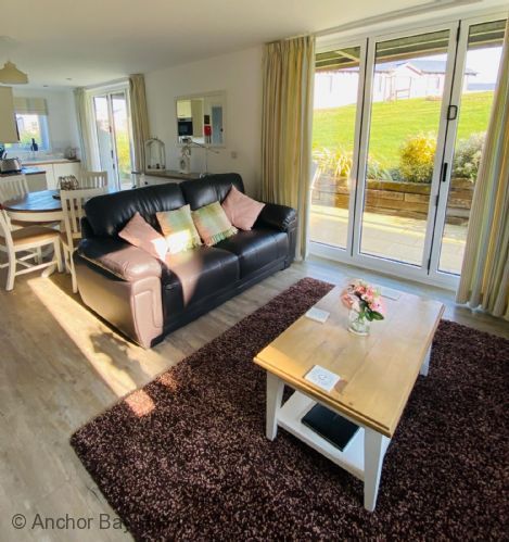 Enter through the step free doorway into a generously proportioned hallway with cloakroom. Walk into the 'L' shaped open plan living, dining and kitchen area with wood-burner stove, sofas for 5 and SMART TV, dining table for 5 and modern fully equipped kitchen including a dishwasher, washer-dryer and microwave. Off the dining area French doors lead onto a private furnished patio, ideal for outside relaxing with seating for 4 with lawned area.