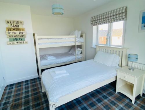 Upstairs the master bedroom includes a king-size bed, TV and luxury En-suite with rainfall shower, the second bedroom has full-size bunks and full size single bed. Family bathroom with bath and overhead rainfall shower.