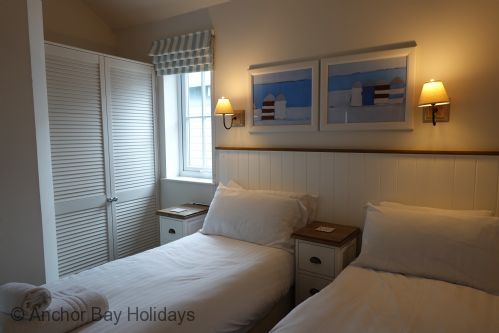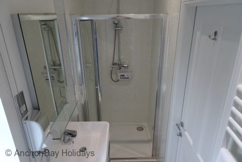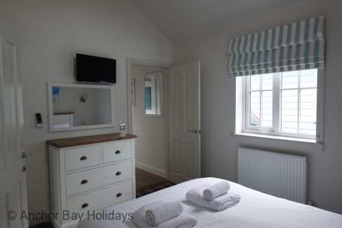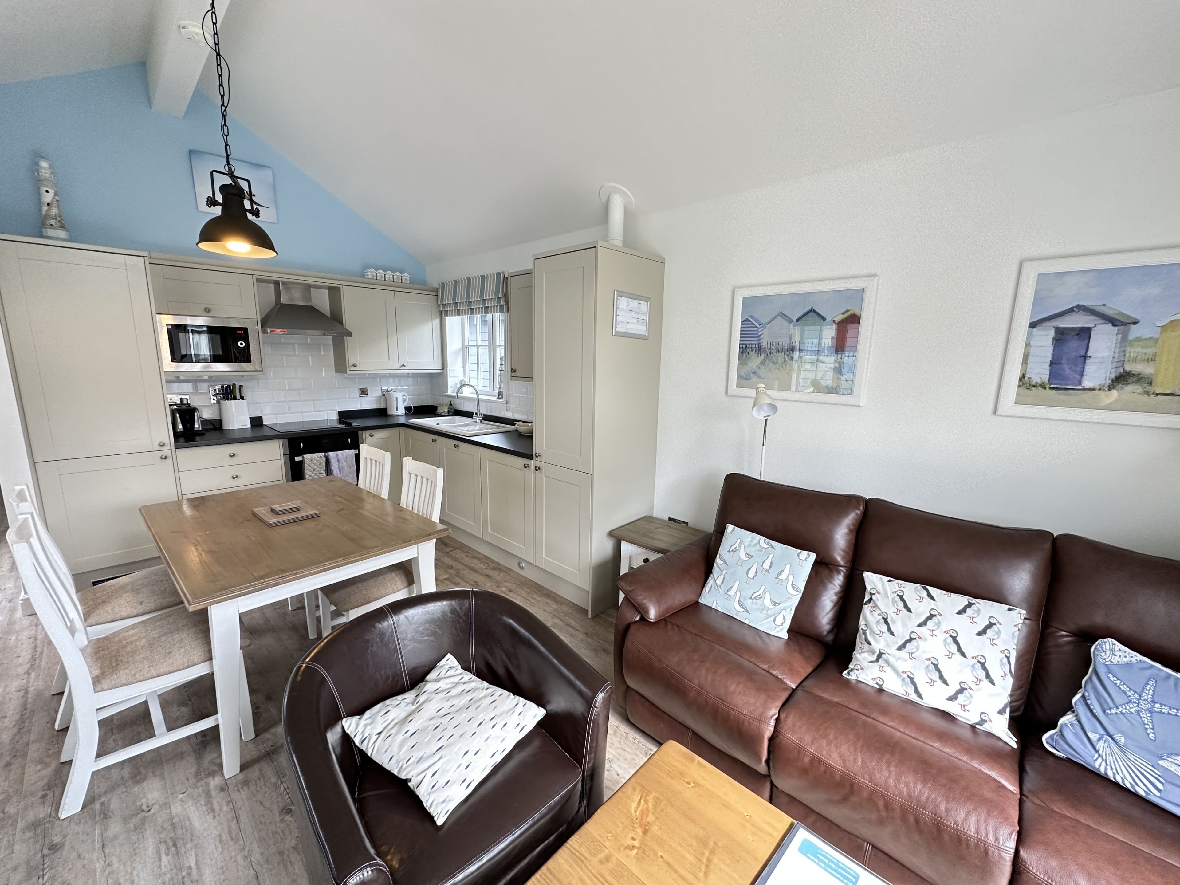 Enter Puffin Lodge through the step free door into the hallway with storage for coats. To your left are the master bedroom with kingsize bed and ensuite shower room, and the second bedroom with two single beds (these can be made up by guests on arrival as a 5 foot bed).