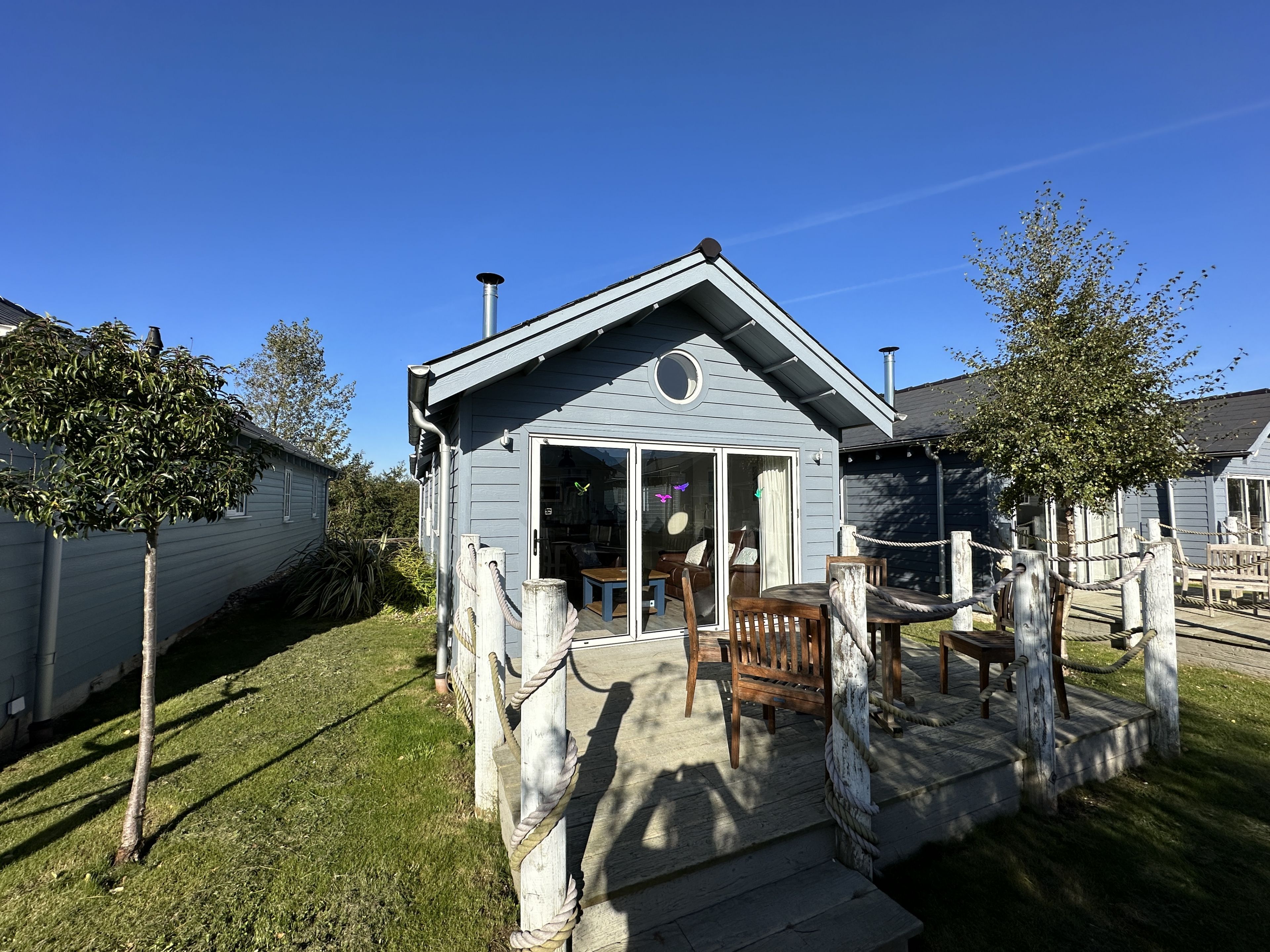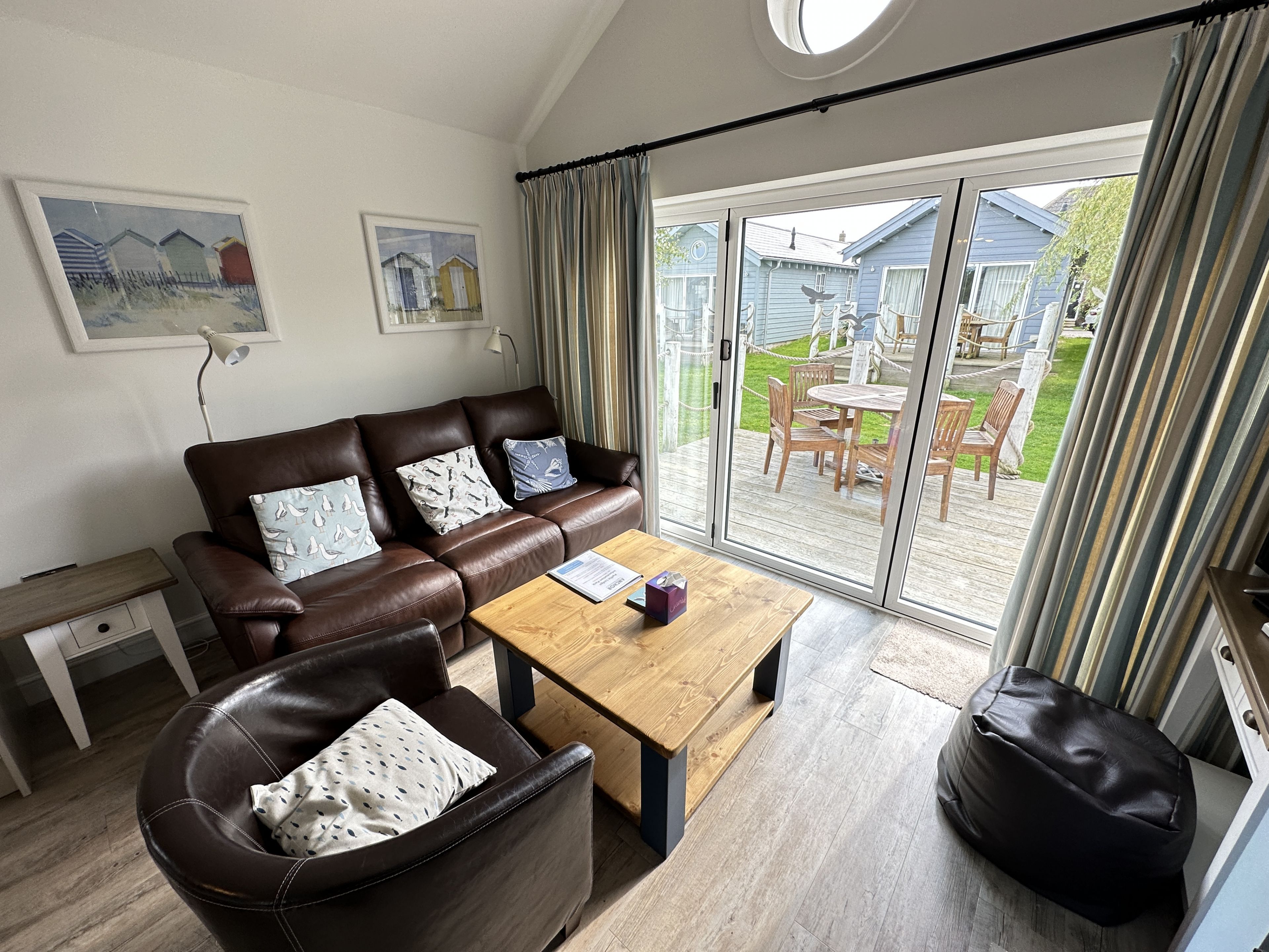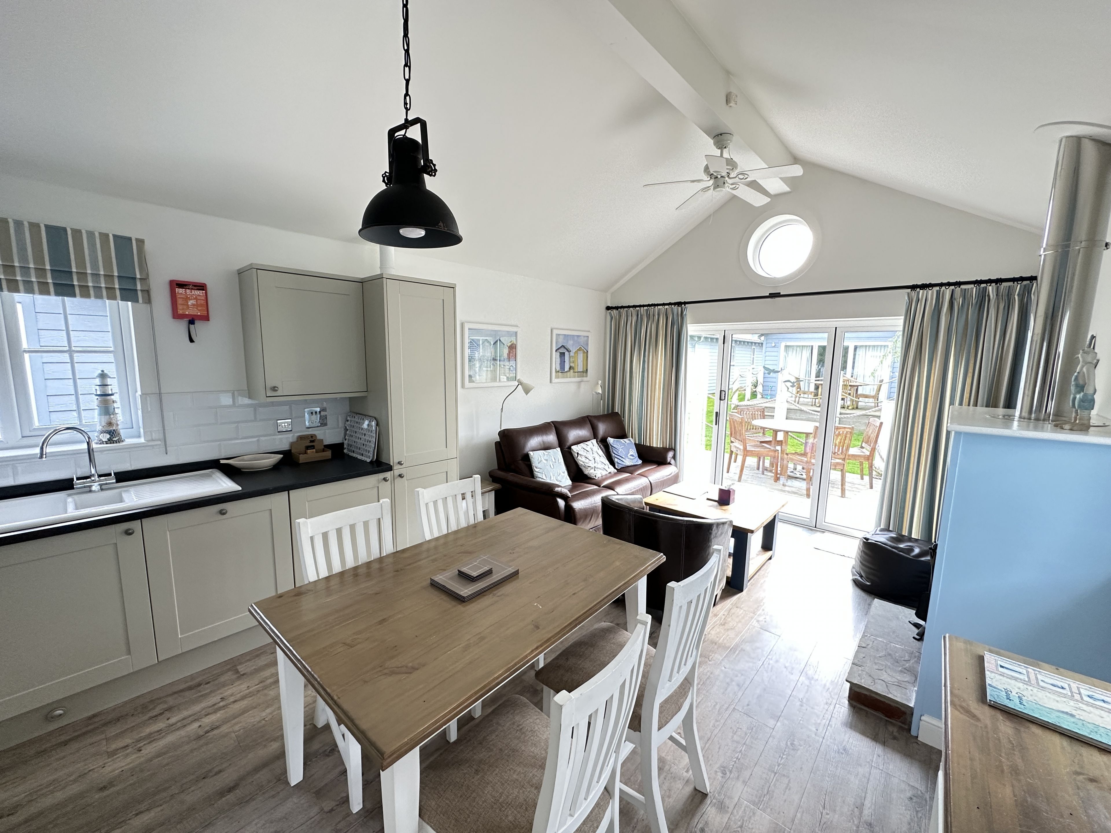 To the right is the open-plan kitchen / dining / lounge space with leather sofa and SMART TV (with Netflix, amazon prime, Apple TV etc - bring your own logins). Exit through the large bifold doors to the deck with seating, ideal for alfresco dining or sitting out whilst the children play outside.