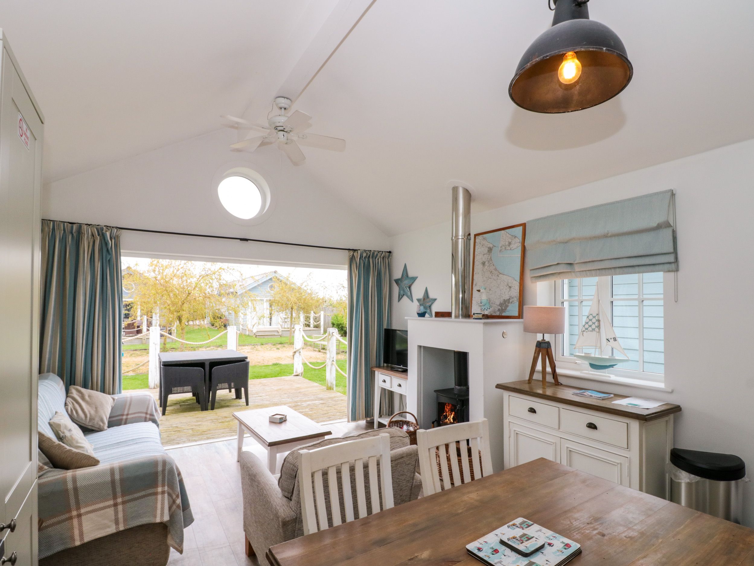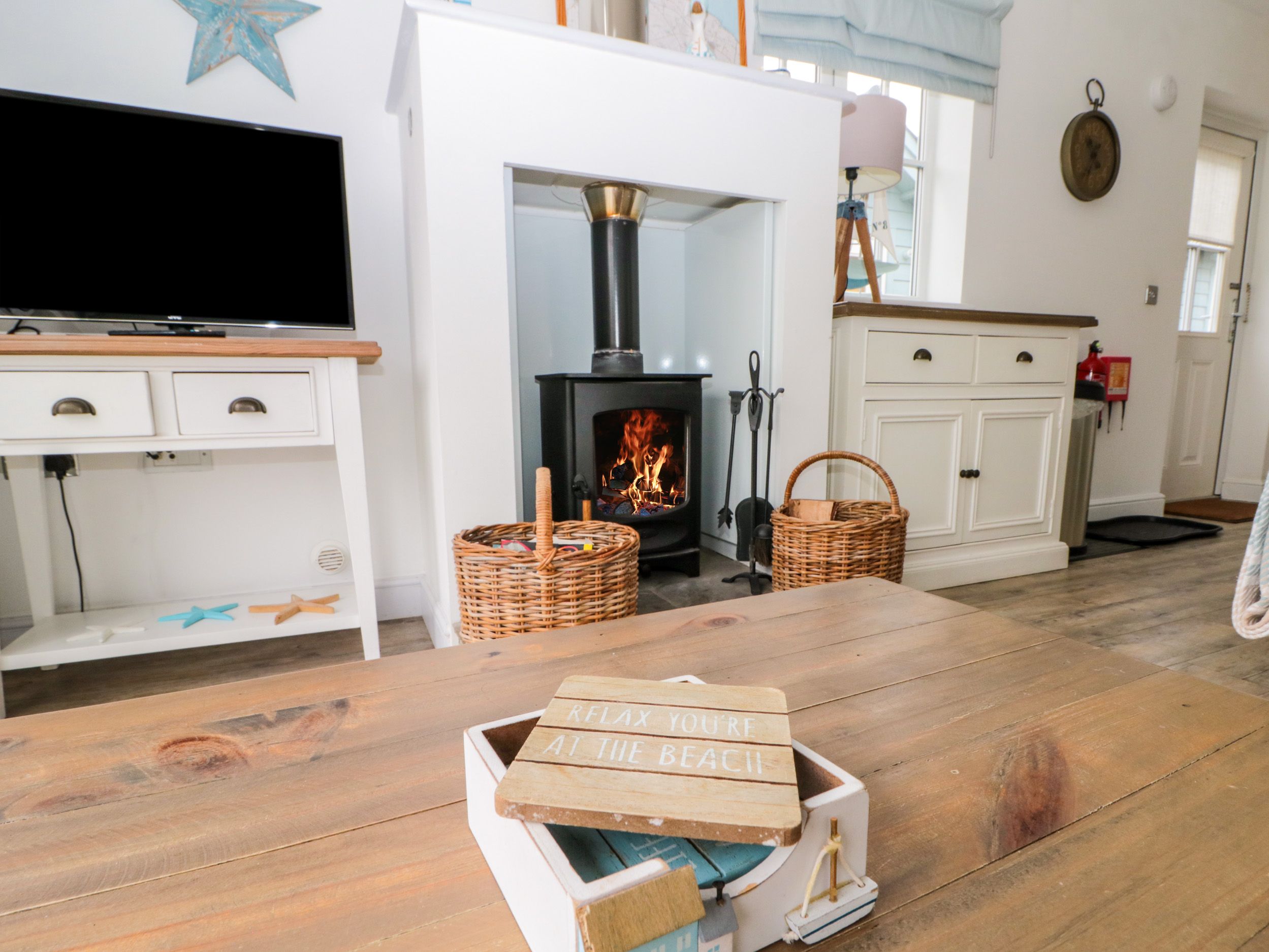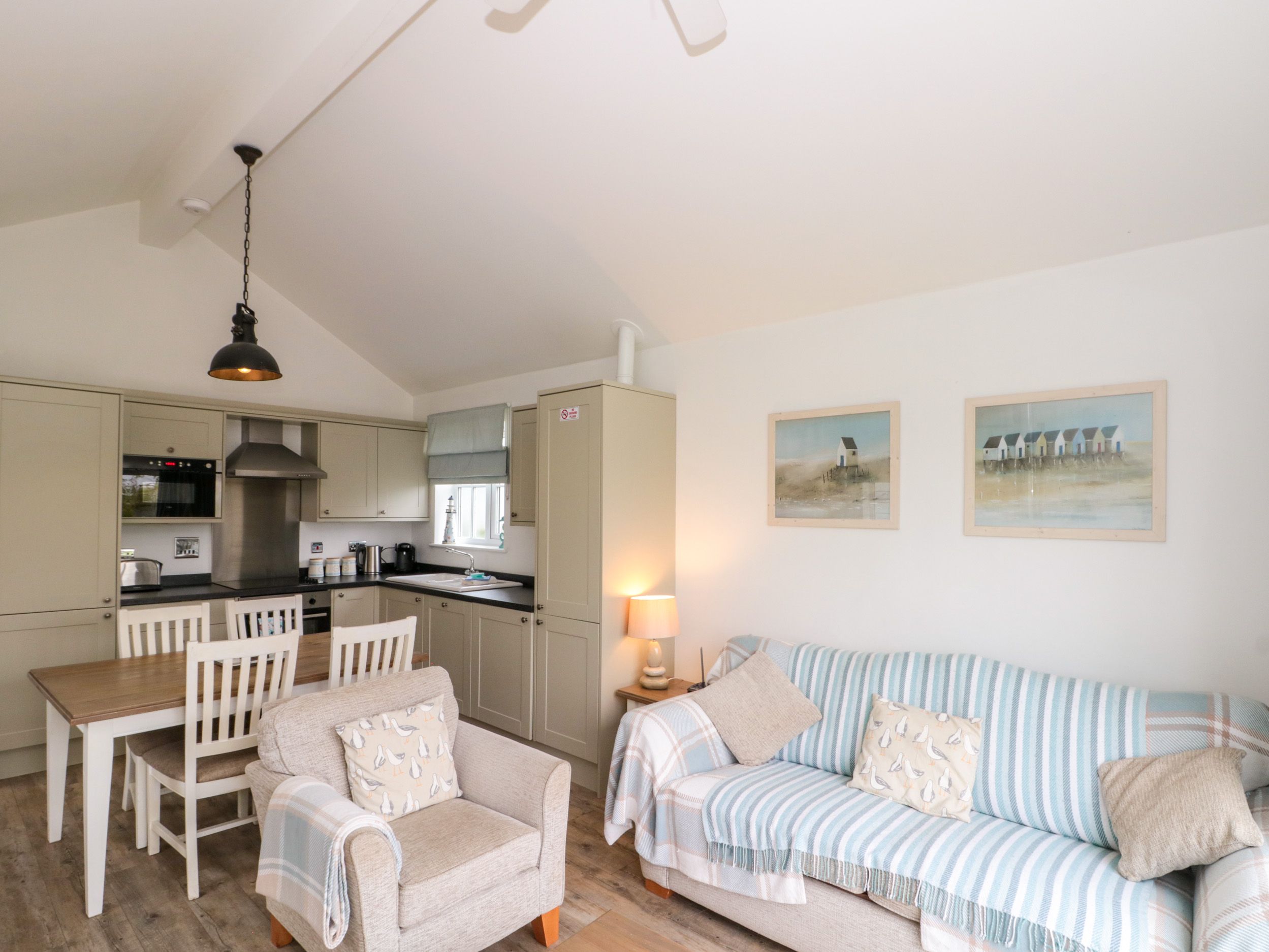 Amenities Gas central heating with woodburning stove. Electric oven, ceramic hob, microwave, fridge/freezer, washer/dryer, dishwasher, 3 x TVs with Freeview, DVD, WiFi, selection of books, games and DVDs. Fuel and power inc. in rent. Fuel for stove available to be purchased locally. Bed linen and towels inc. in rent. Travel cot and highchair. Off road parking for 2 cars. Private decked front patio with furniture. Communal grounds with picnic areas and lakes. One well-behaved dog welcome. Sorry, no smoking. Shop and pub 5 mins walk. Beach 5 mins walk. Note: Use of the indoor heated swimming pool, children's pool, sauna and steam room is included in the rental price. The gym and additional facilities and activities are available at additional cost, payable on site.The facilities are open but do need to book to use them. You can phone the main number on site, then select option 4