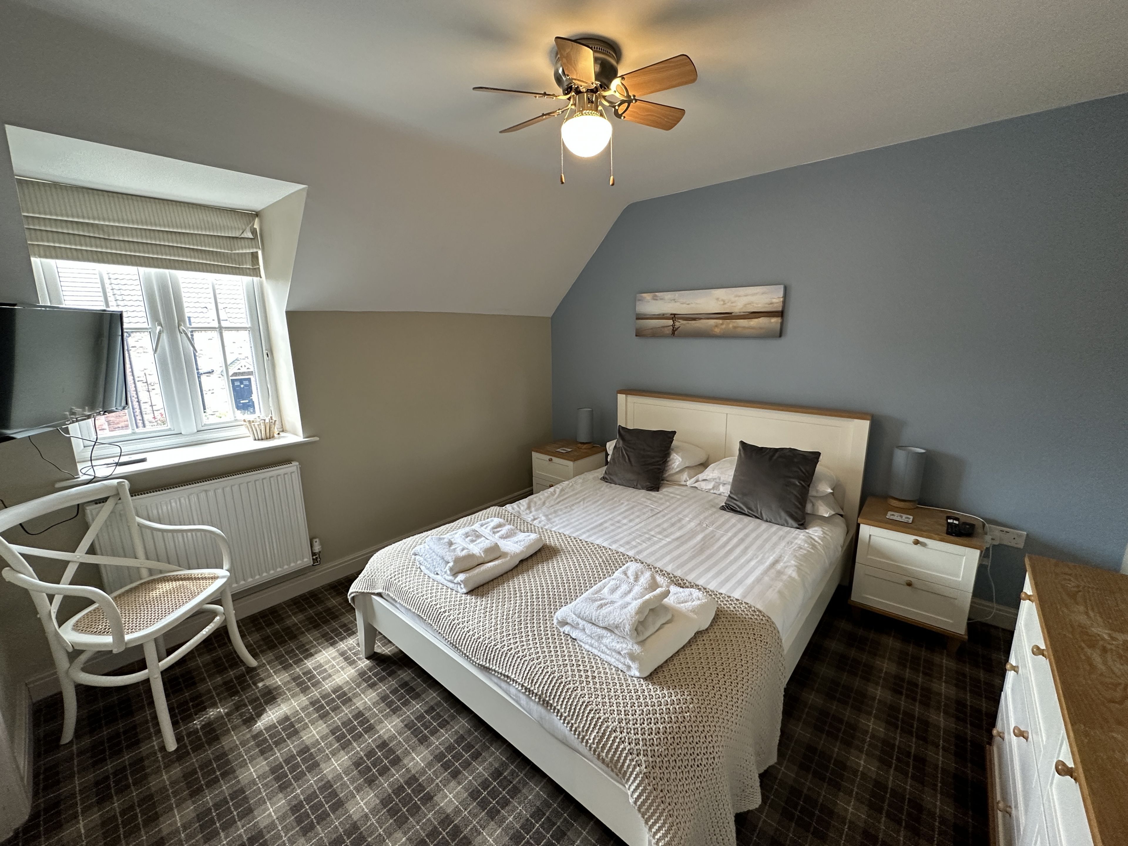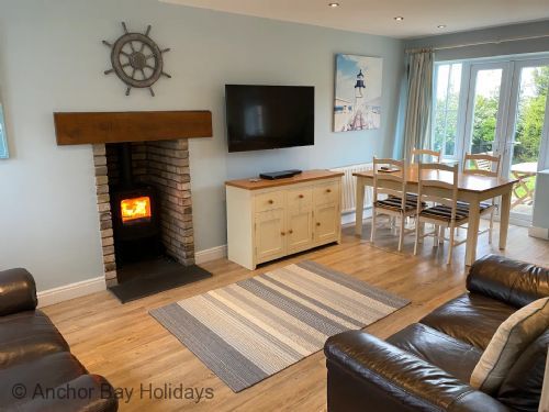 Enter through the step free doorway into a generously proportioned hallway with cloakroom and storage. Walk into the 'L' shaped open plan living, dining and kitchen area with wood-burner stove, sofas for 4 and stunning SKY GLASS TV (sports and netflix included), dining table for 4 and modern fully equipped kitchen including a dishwasher, washer-dryer and microwave. Off the dining area French doors lead onto a private furnished patio with BBQ area, ideal for outside relaxing with seating for 4 with quiet lawned area.