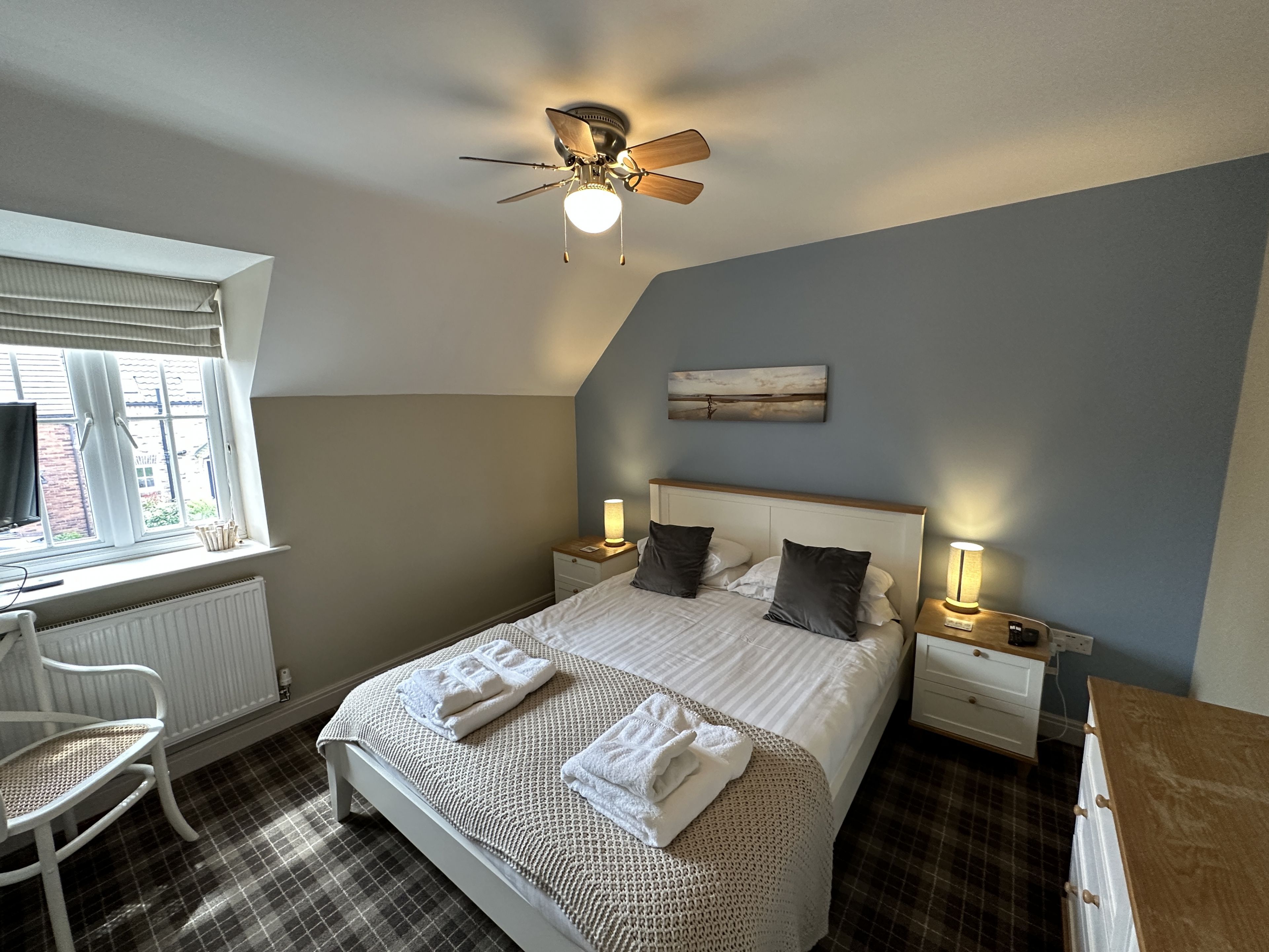 Upstairs the master bedroom includes a king-size bed, SKY TV and luxury En-suite with rainfall shower and ceiling fan for those hot evenings. The second bedroom has two single beds, SKY TV and access to the family bathroom with bath and overhead rainfall shower.