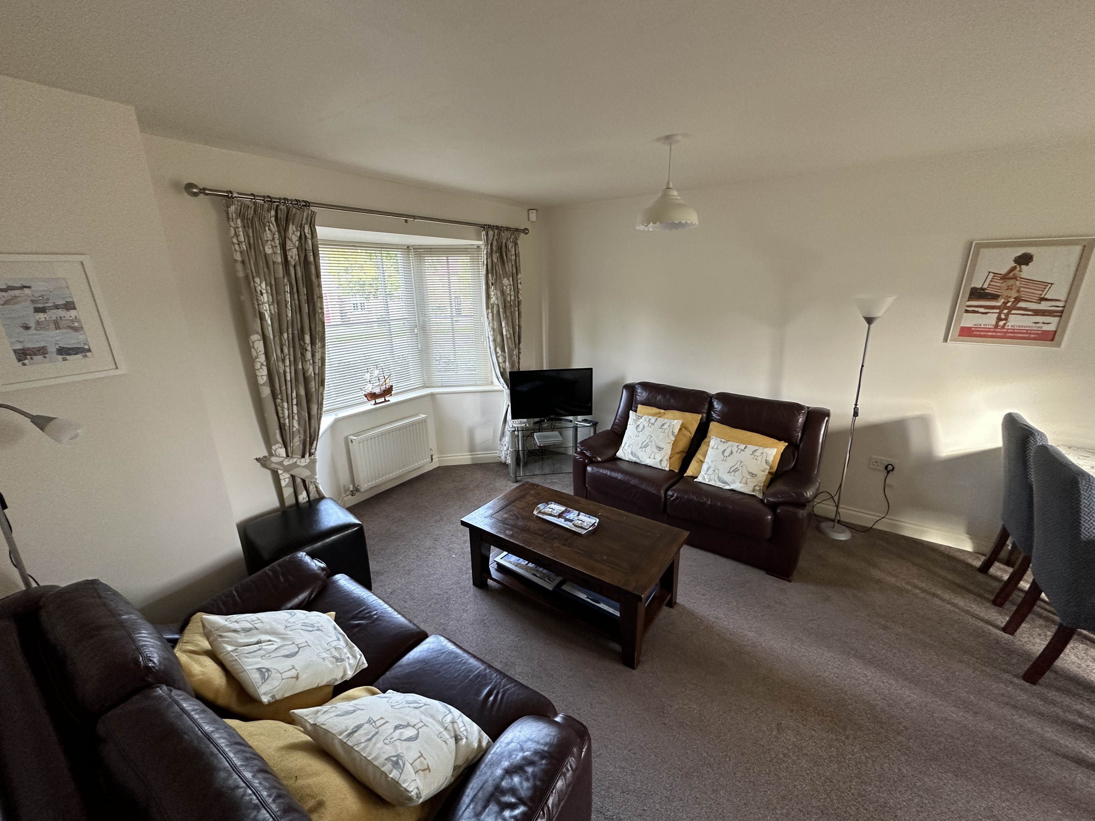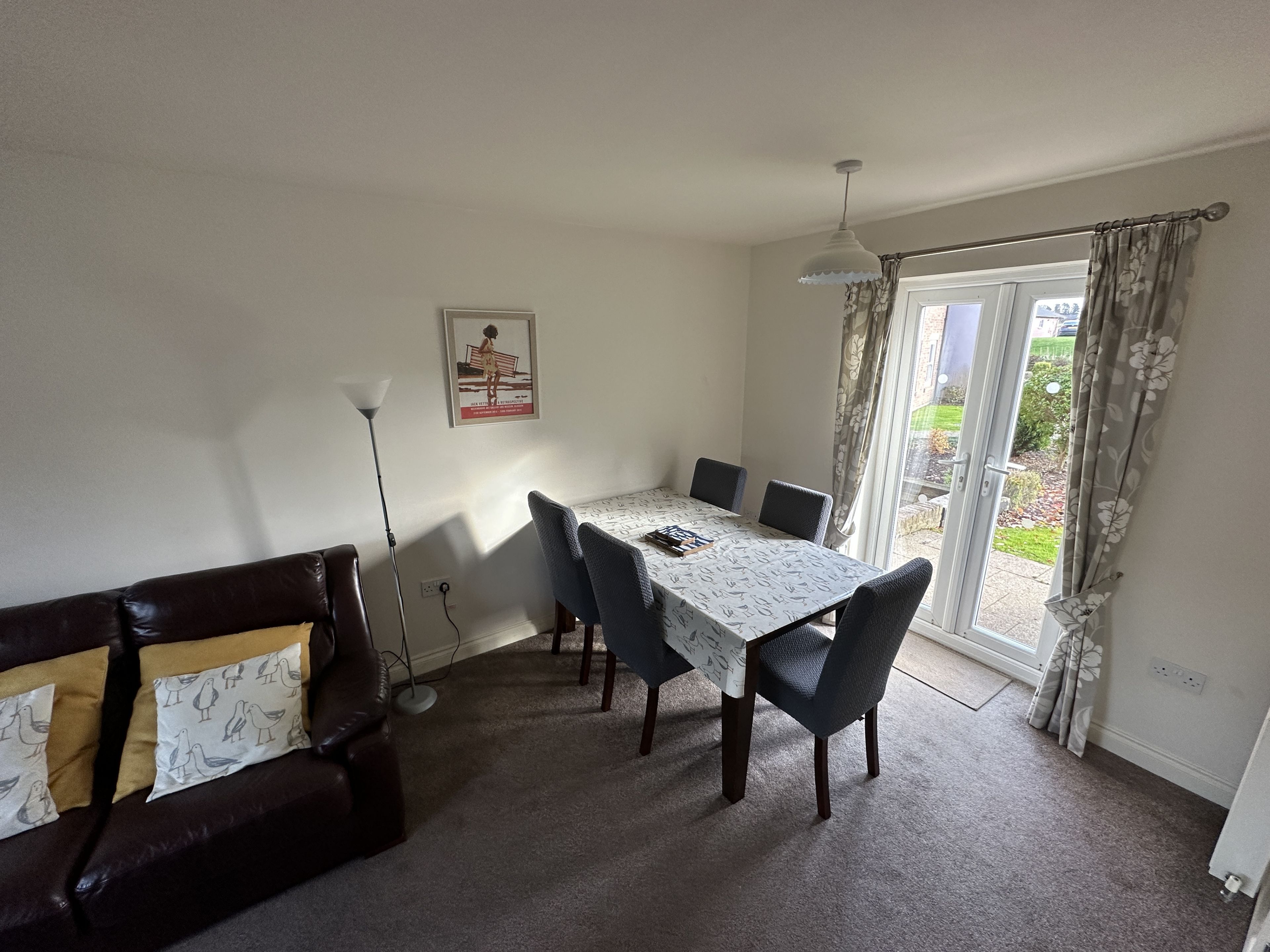 The other side of the hallway leads to the stunning large lounge taking full advantage of the Bay window with lovely leather sofas and SMART TV. At the rear of the lounge / diner is a large dining table for 4 with French doors to the large patio area to the rear.